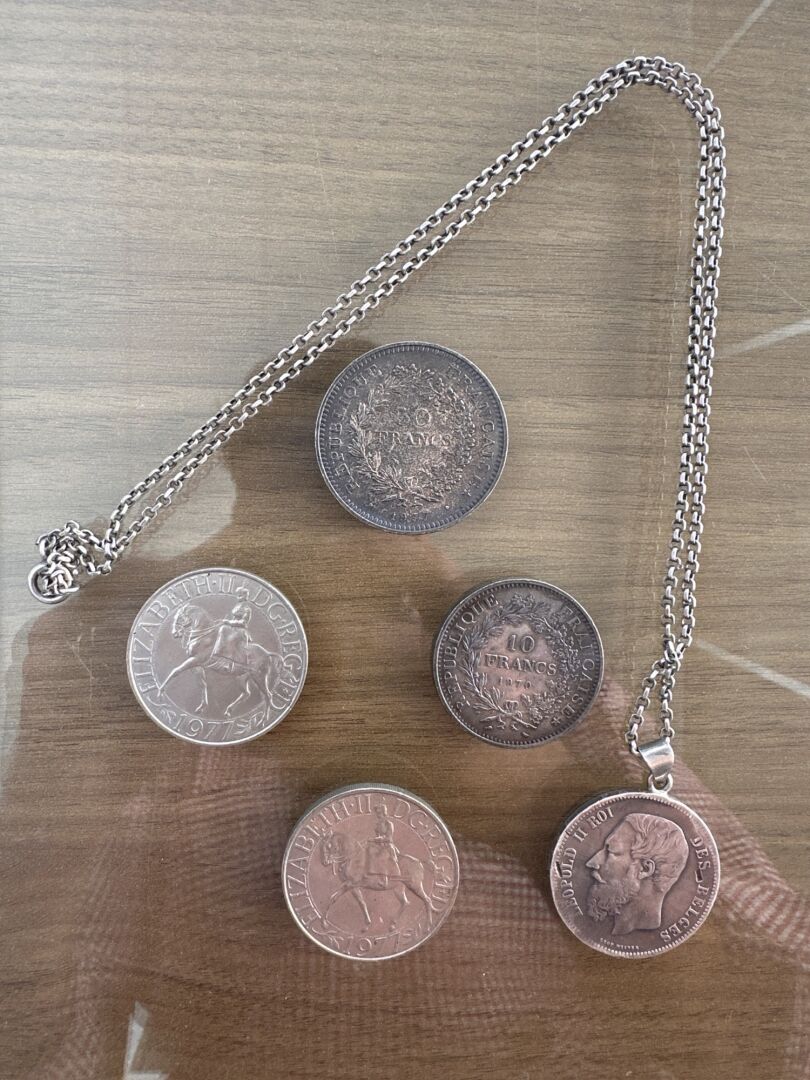 Ensemble de trois pièces en argent comprenant : - Pièce de 10 francs Hercule ; - Pièce de 50 francs Hercule ; - Pièce de 5 francs belges transformée en médaille avec chaîne en argent. Poids total : 93.7 gr On joint : Deux pièces pour le Jubilé d'Elisabeth II en 1977.