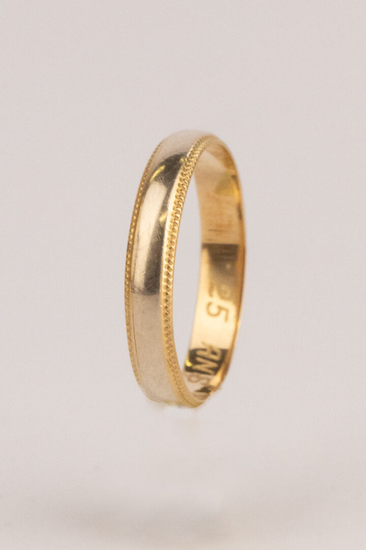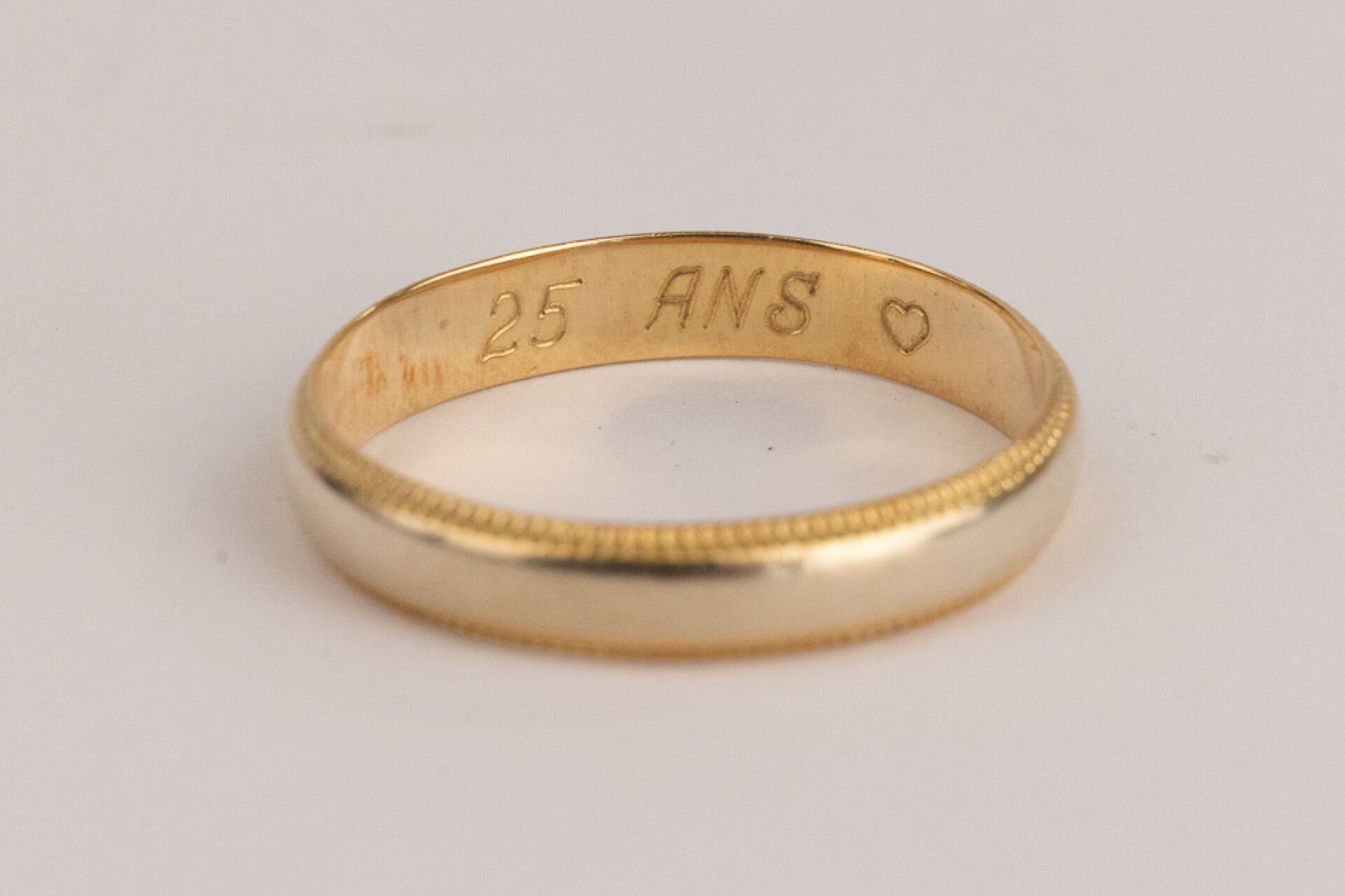 Alliance en or gris et or jaune perlé 18k (750 millièmes). Poids : 3,73 gr - Tour de doigt 62