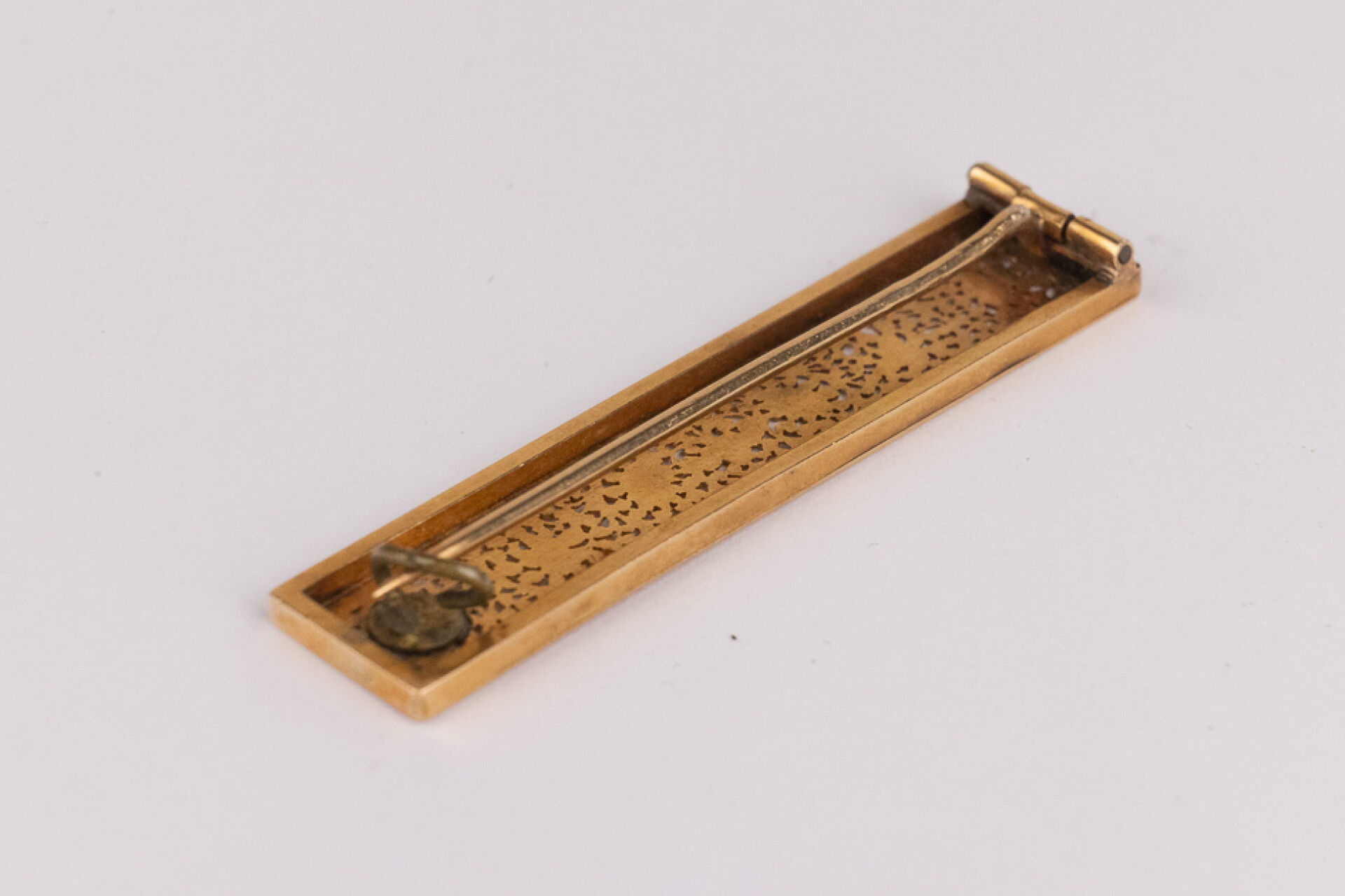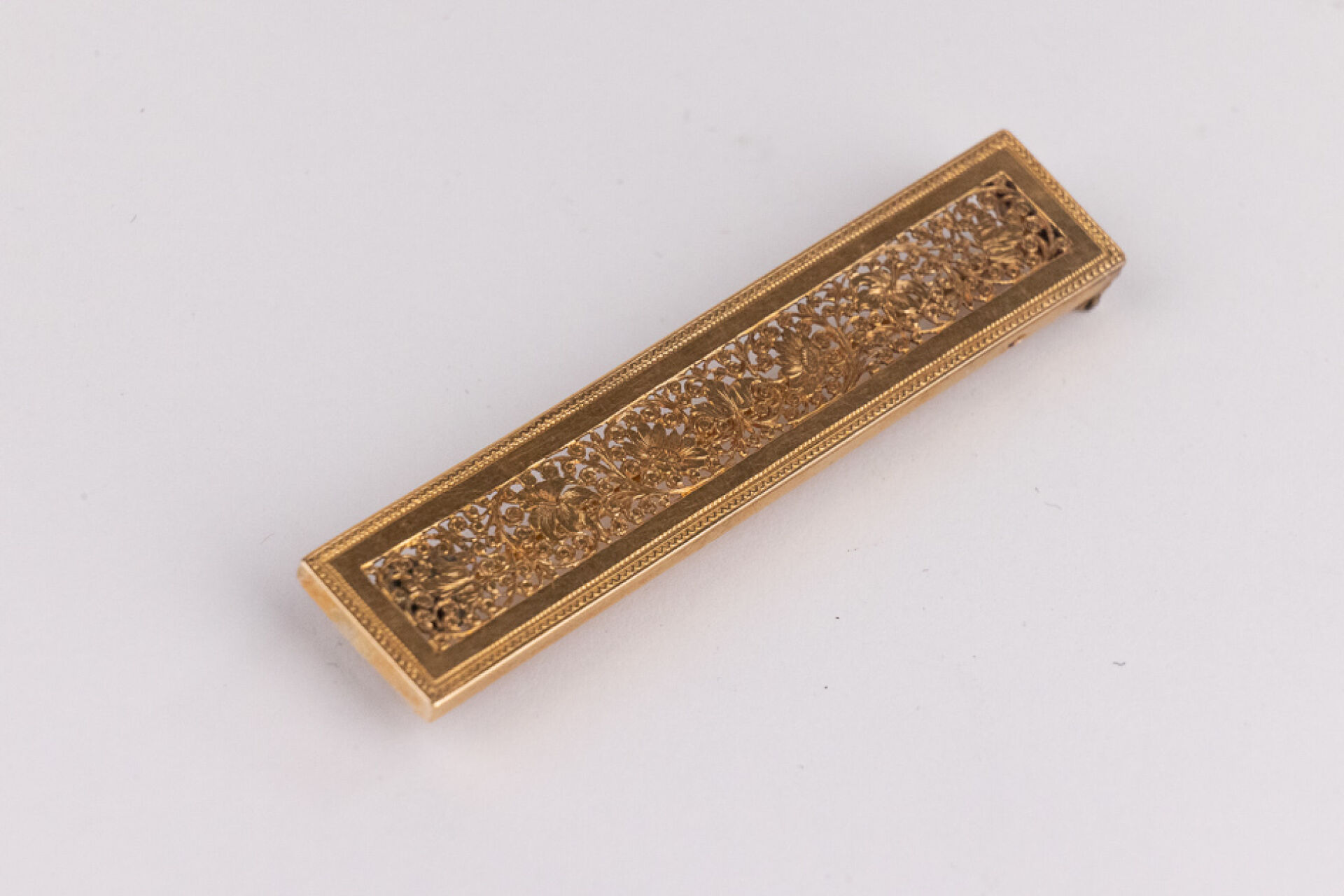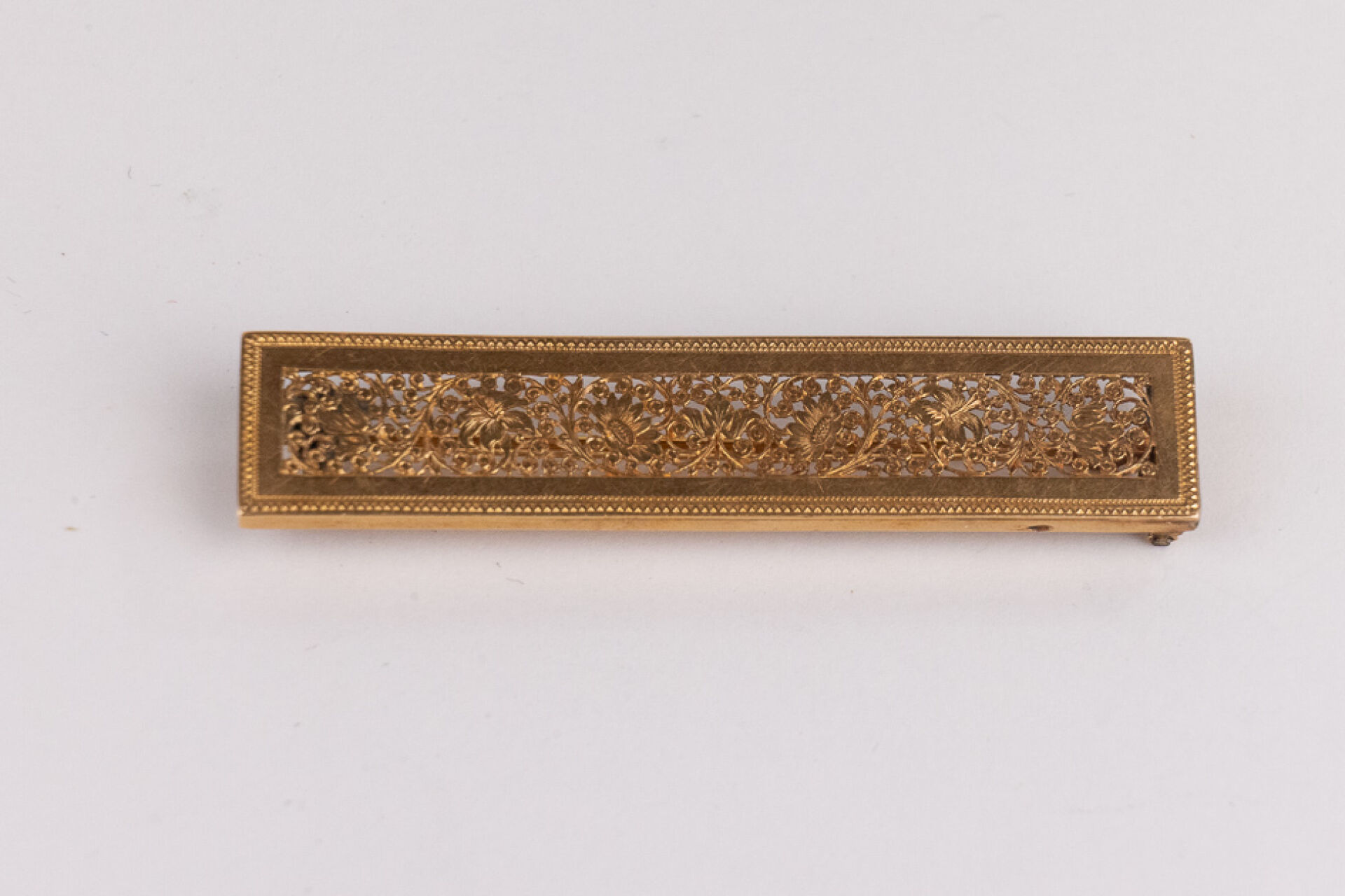 Broche rectangulaire en or jaune 18k (750 millièmes), motifs de fleurs filigranés. Poids : 6,44 gr - Long. : 5.8 cm