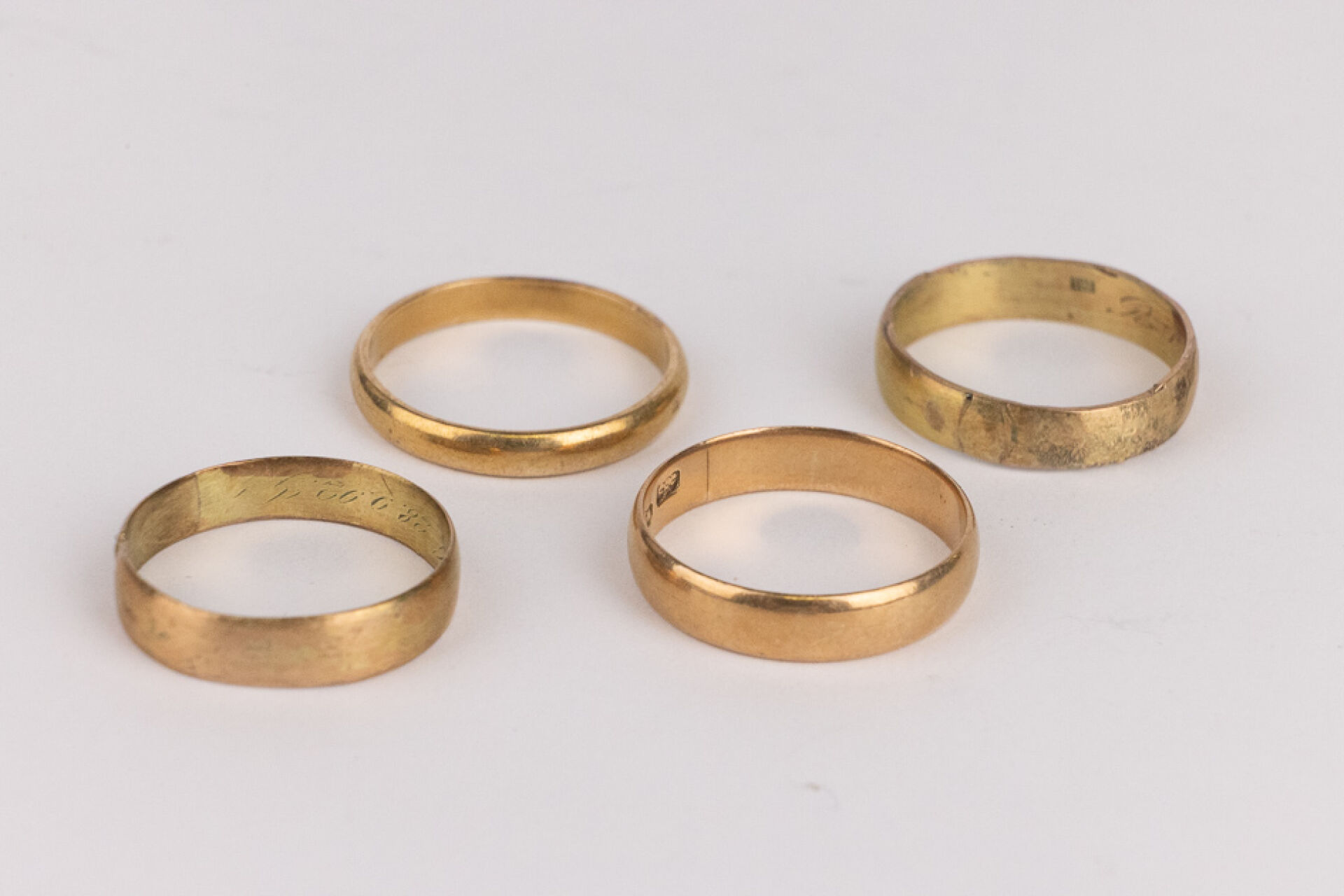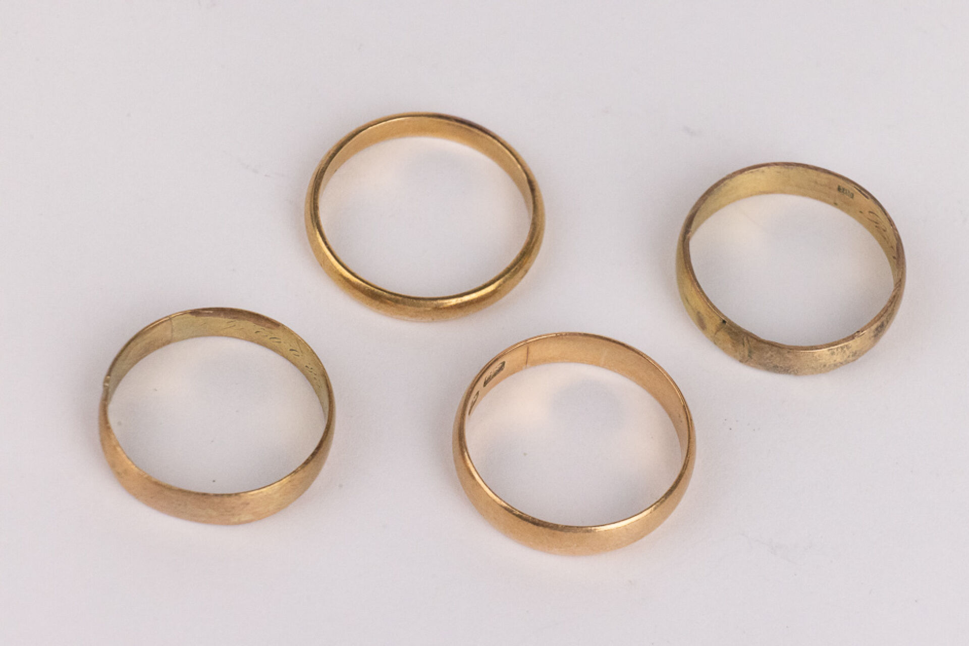 Lot de quatre alliances en or jaune 14k (585 millièmes). Poids total : 13.74 gr - Tours de doigt 62, 63 et 64 (usures)