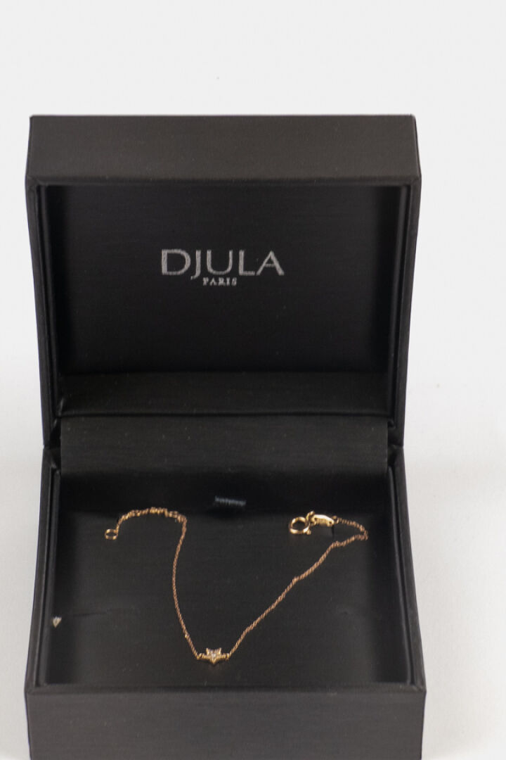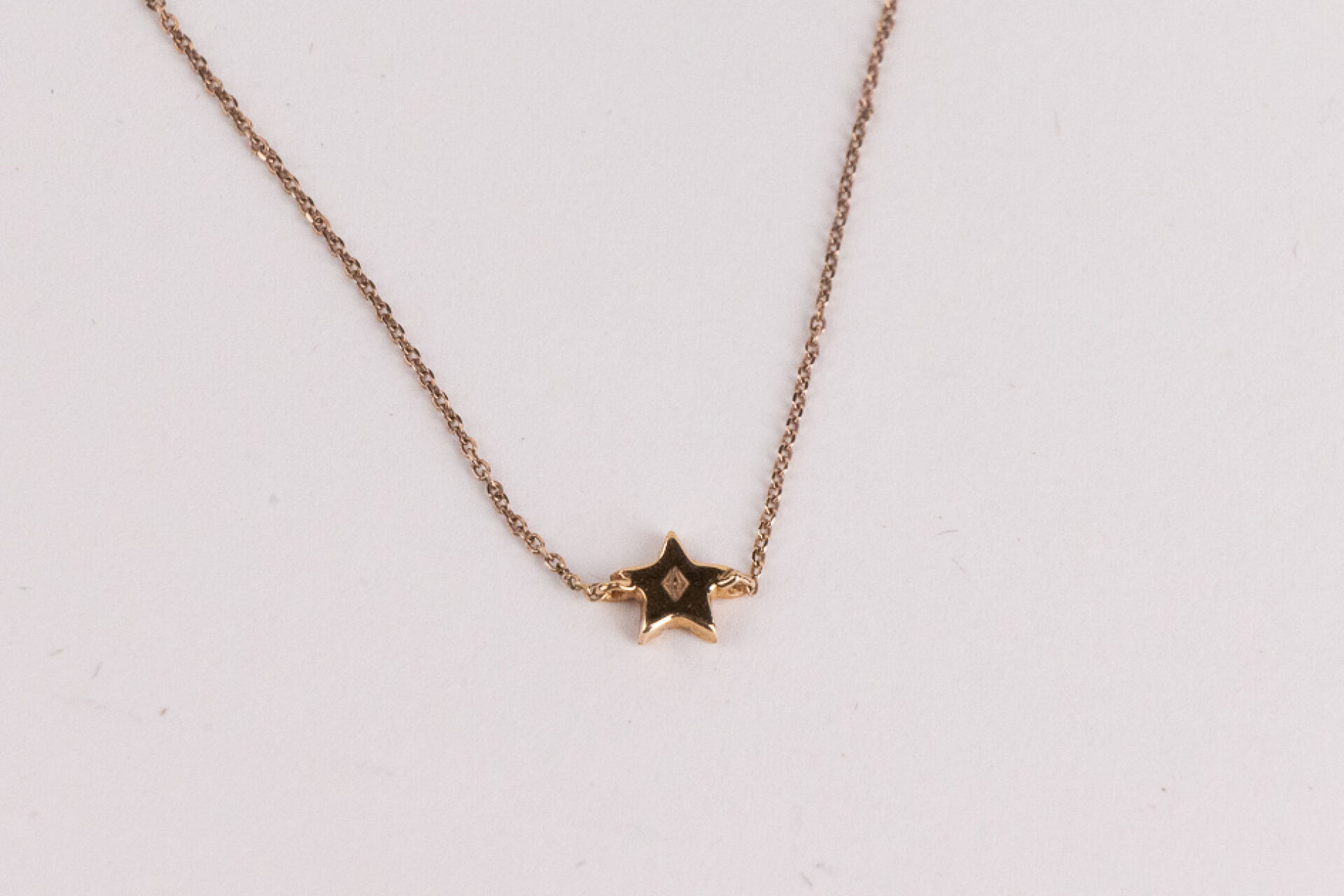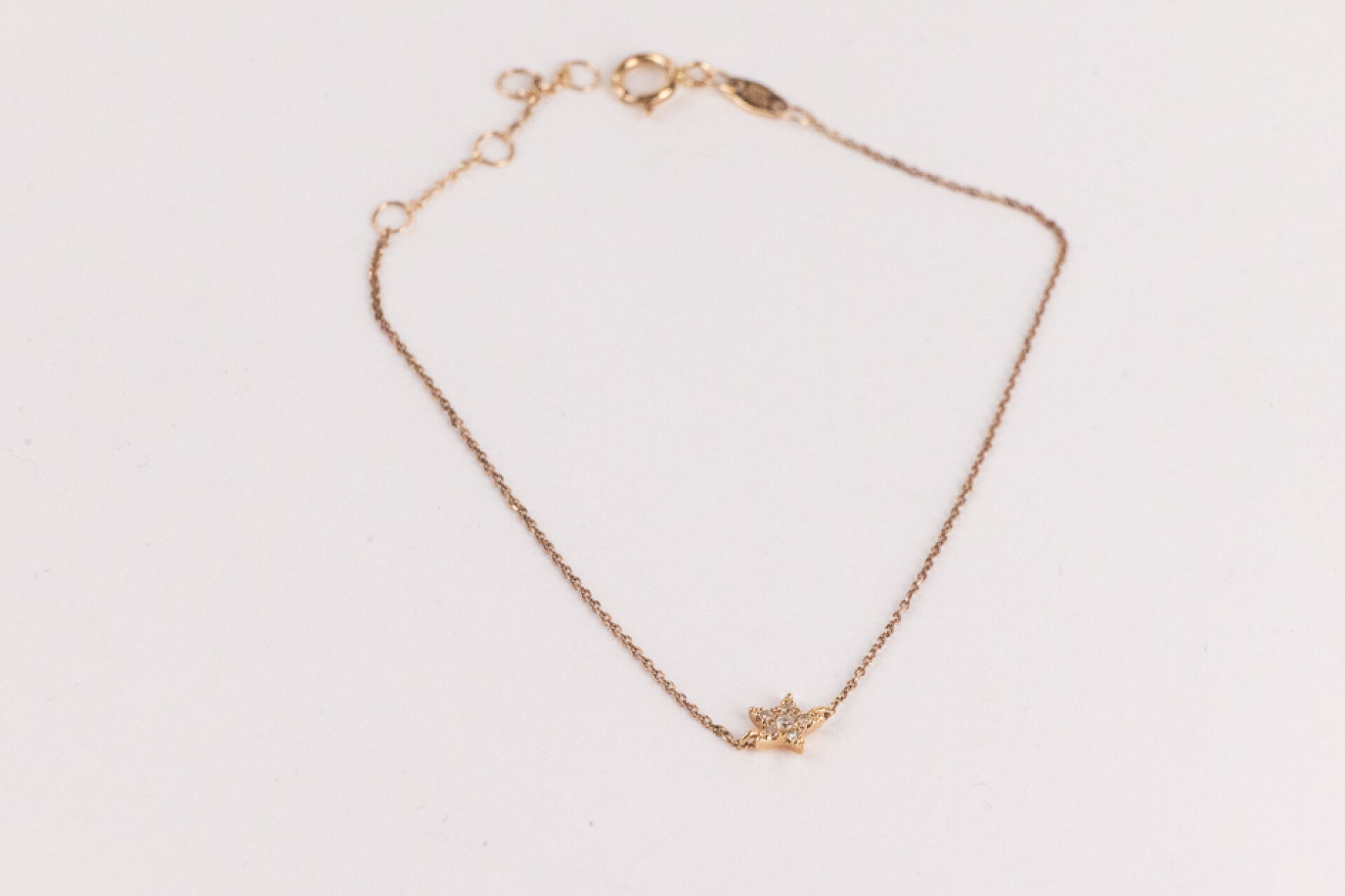 Bracelet en or rose 18k (750 millièmes), fine maille forçat, motif étoile serti de petits brillants, fermoir ajustable, écrin. Poids brut : 0,54 gr - Long. : 14 à 17 cm