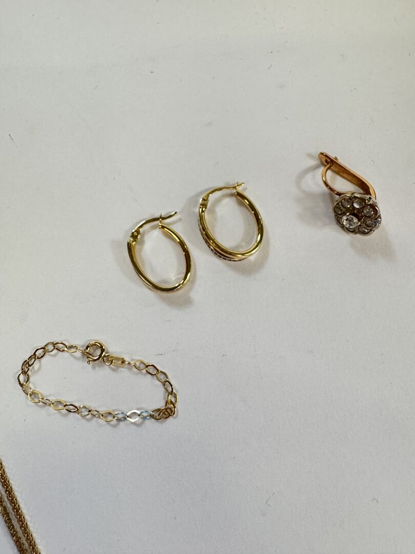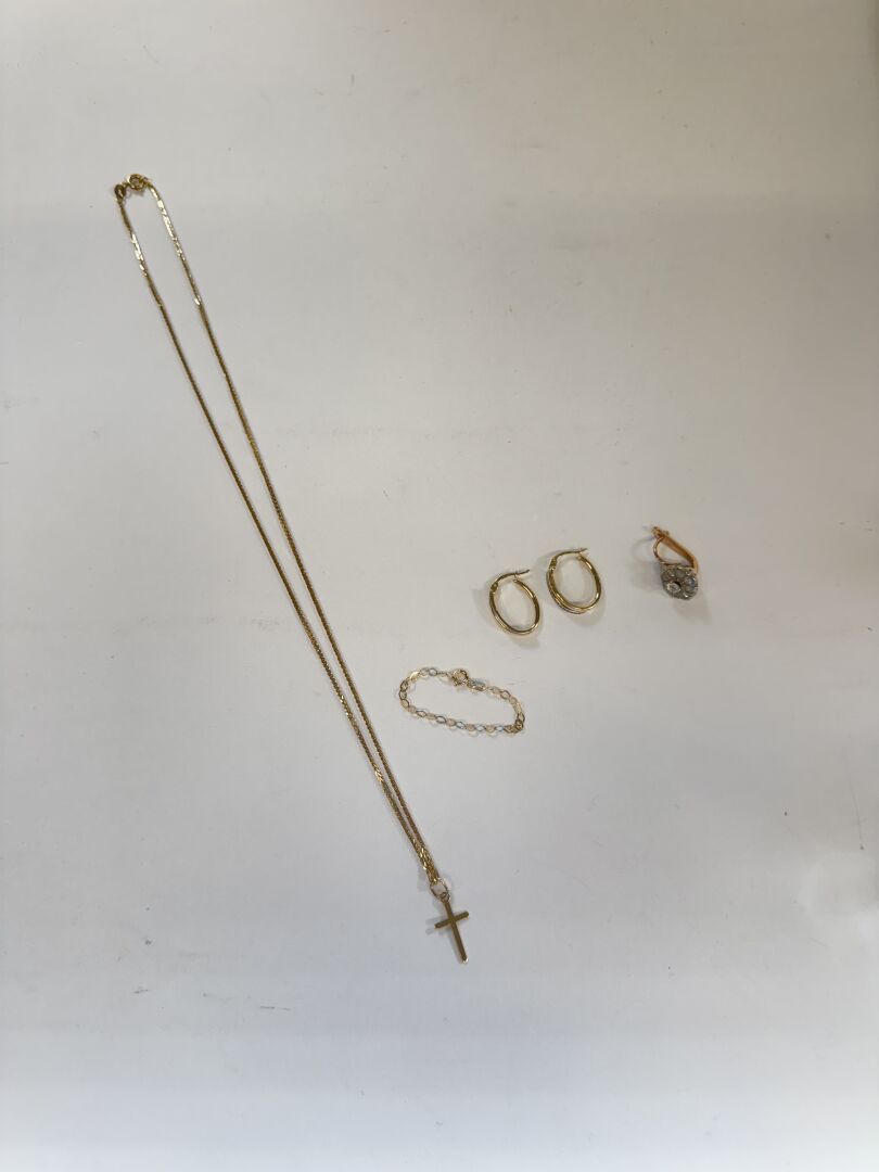 Ensemble comprenant une paire de boucles d'oreille, une chaine retenant une croix, un bracelet d'enfant et une boucle d'oreille, le tout en or jaune 14k (585 millièmes). Poids brut : 10 gr