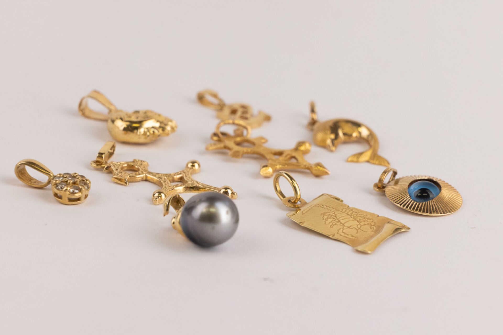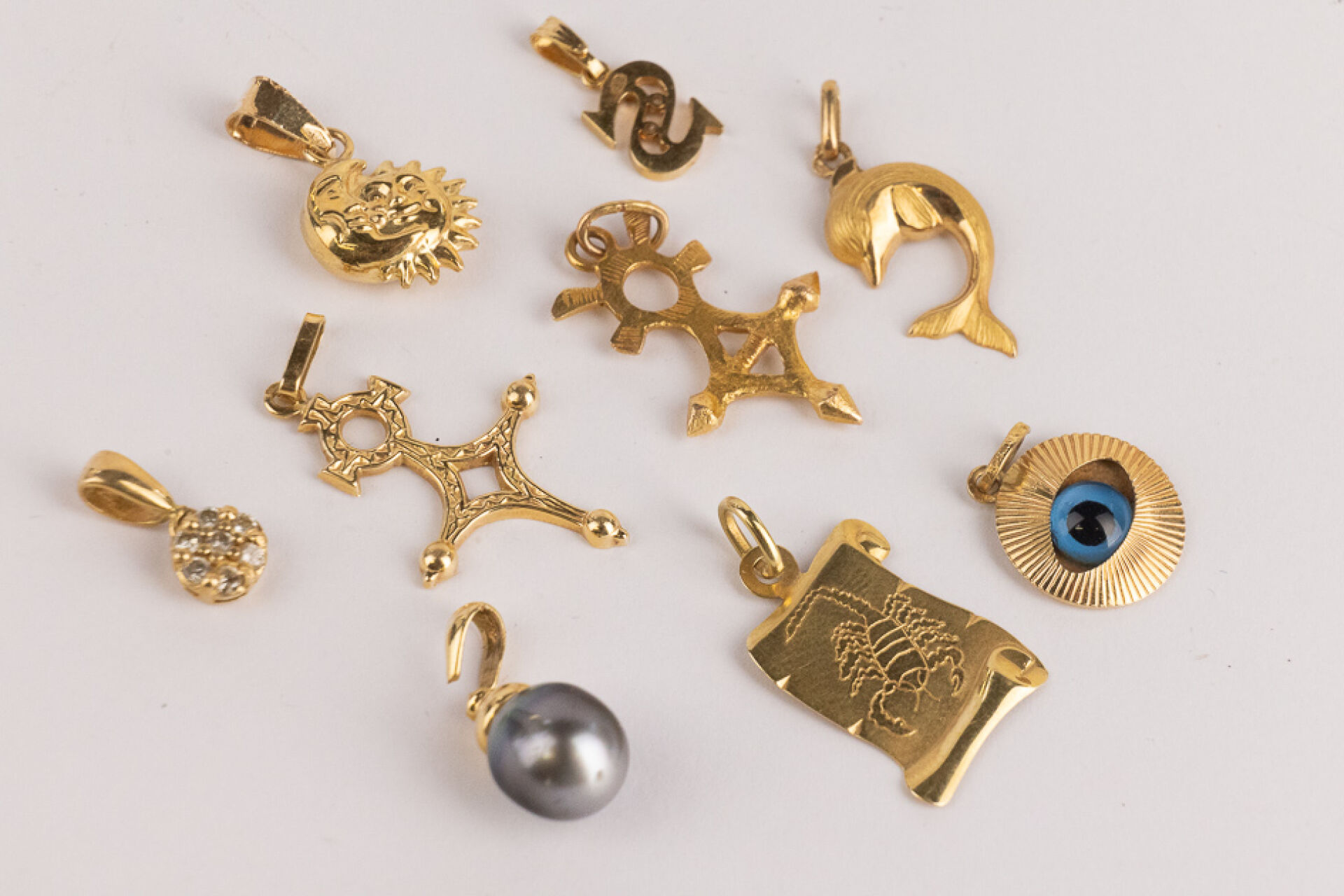 Ensemble de dix pendentifs en or jaune 18k (750 millièmes) figurant un dauphin, les astres, la lettre "S", deux croix d'Agadez,… Poids brut : 12,78 gr