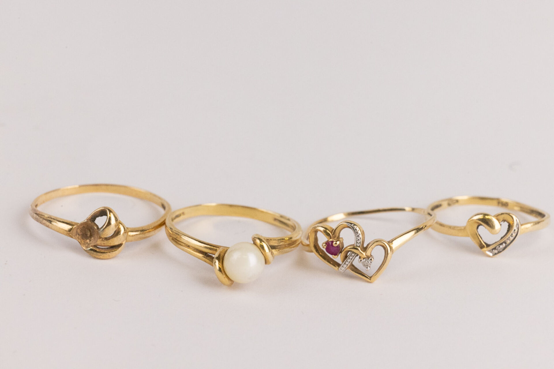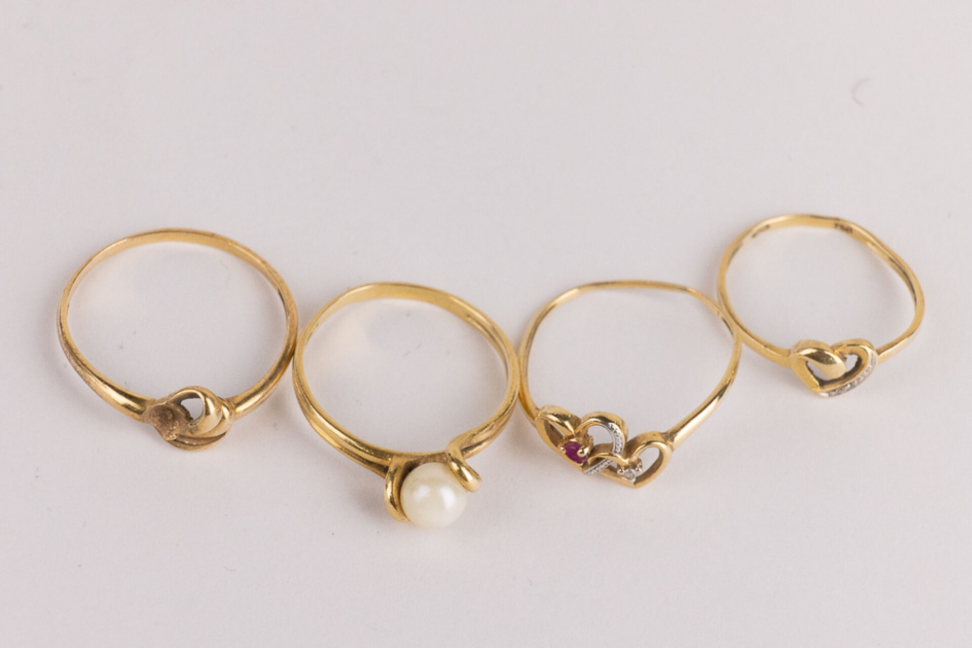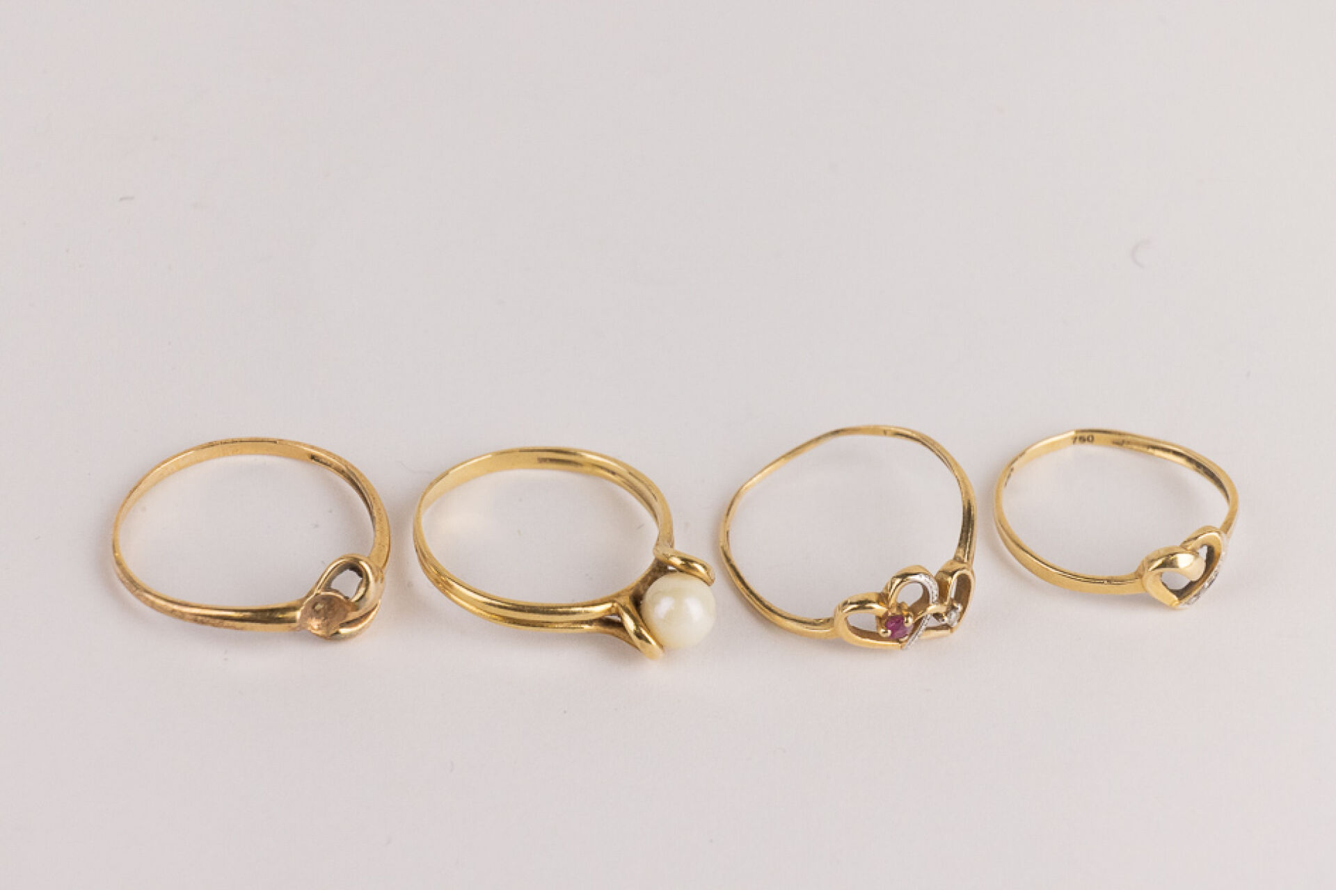 Ensemble de quatre bagues en or jaune 18k (750 millièmes). Poids brut : 6,32 gr - Tours de doigt 52, 57 et 60 (usures, déformations, élément manquant sur l'une)