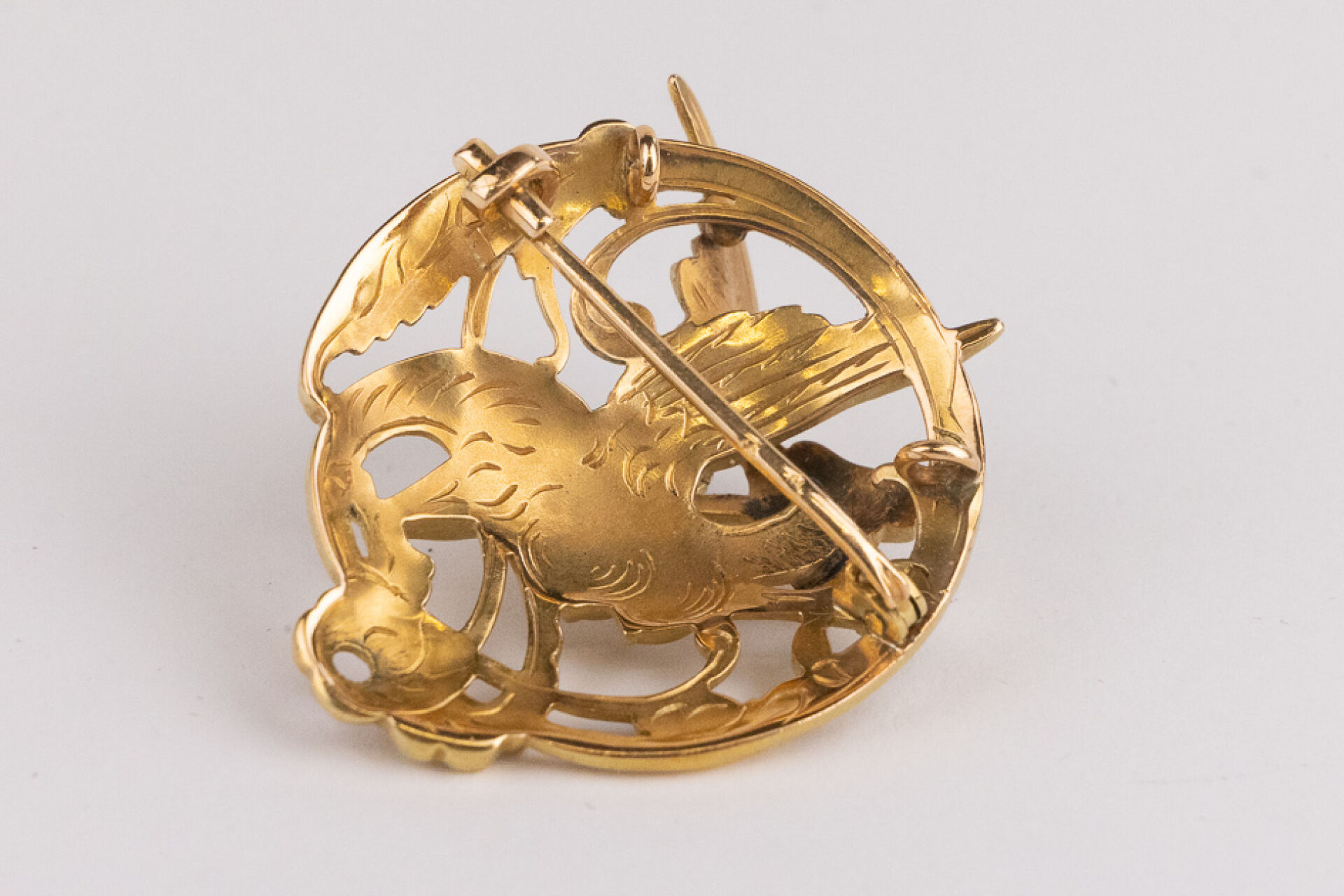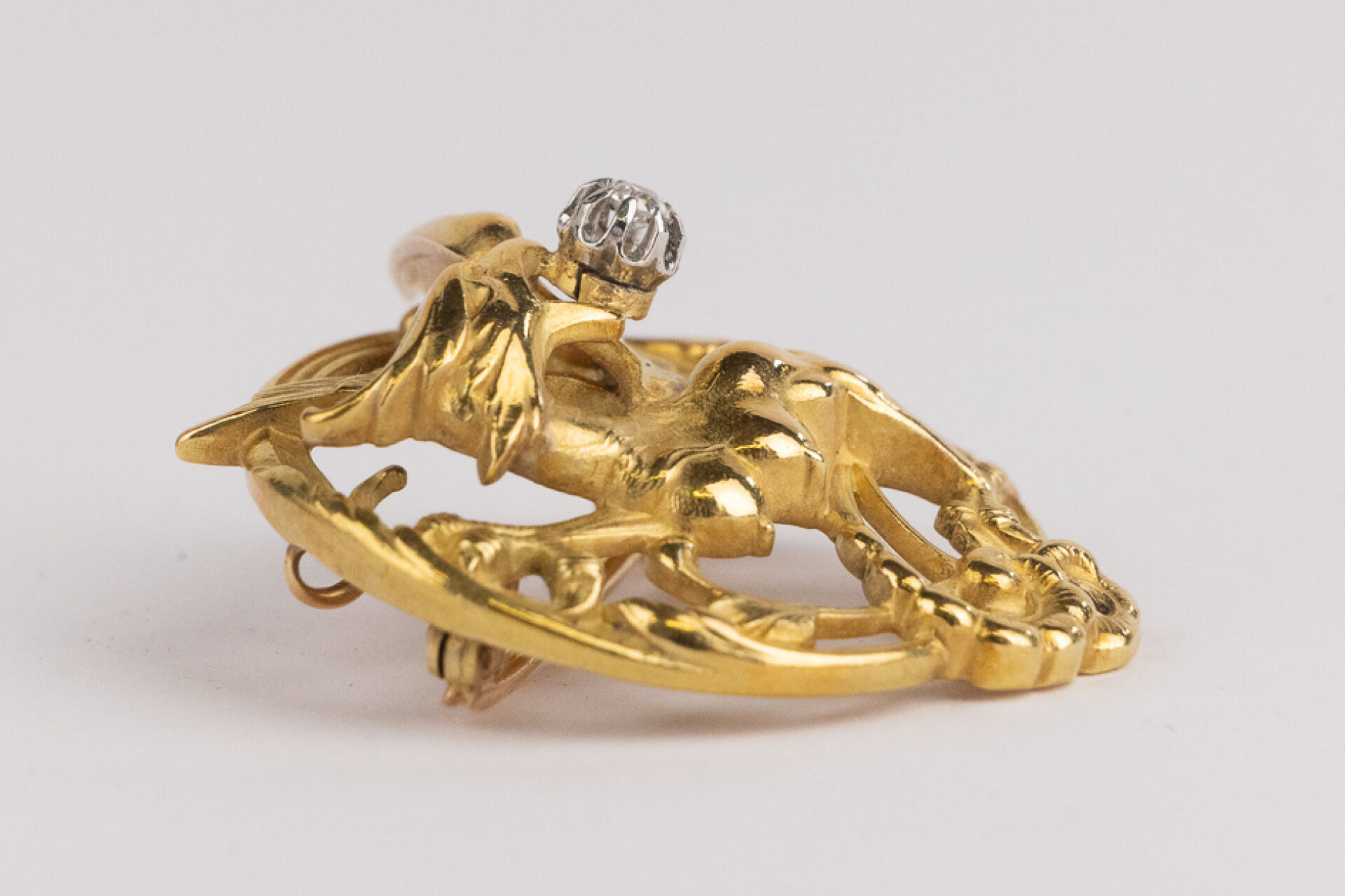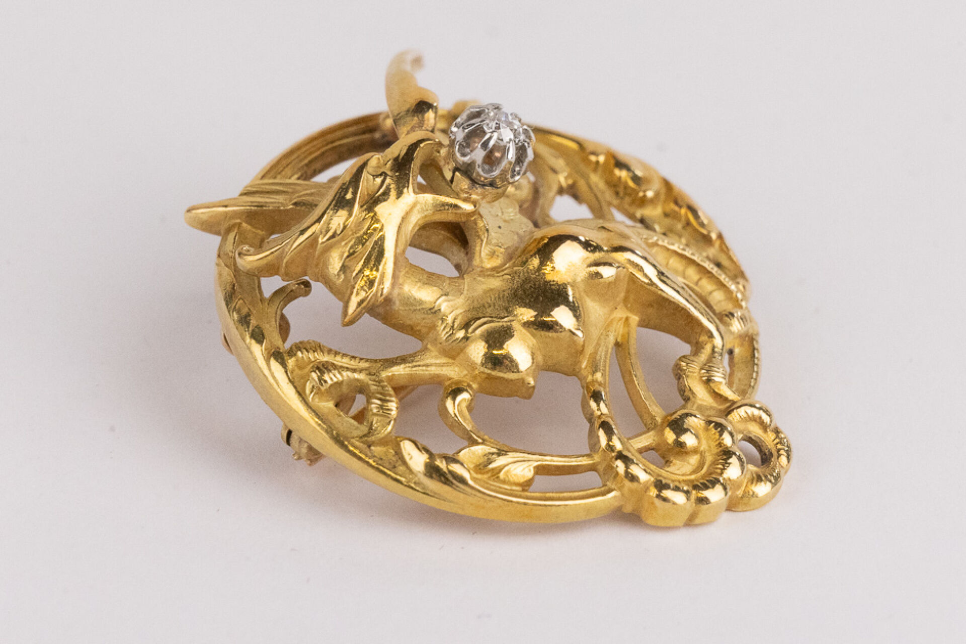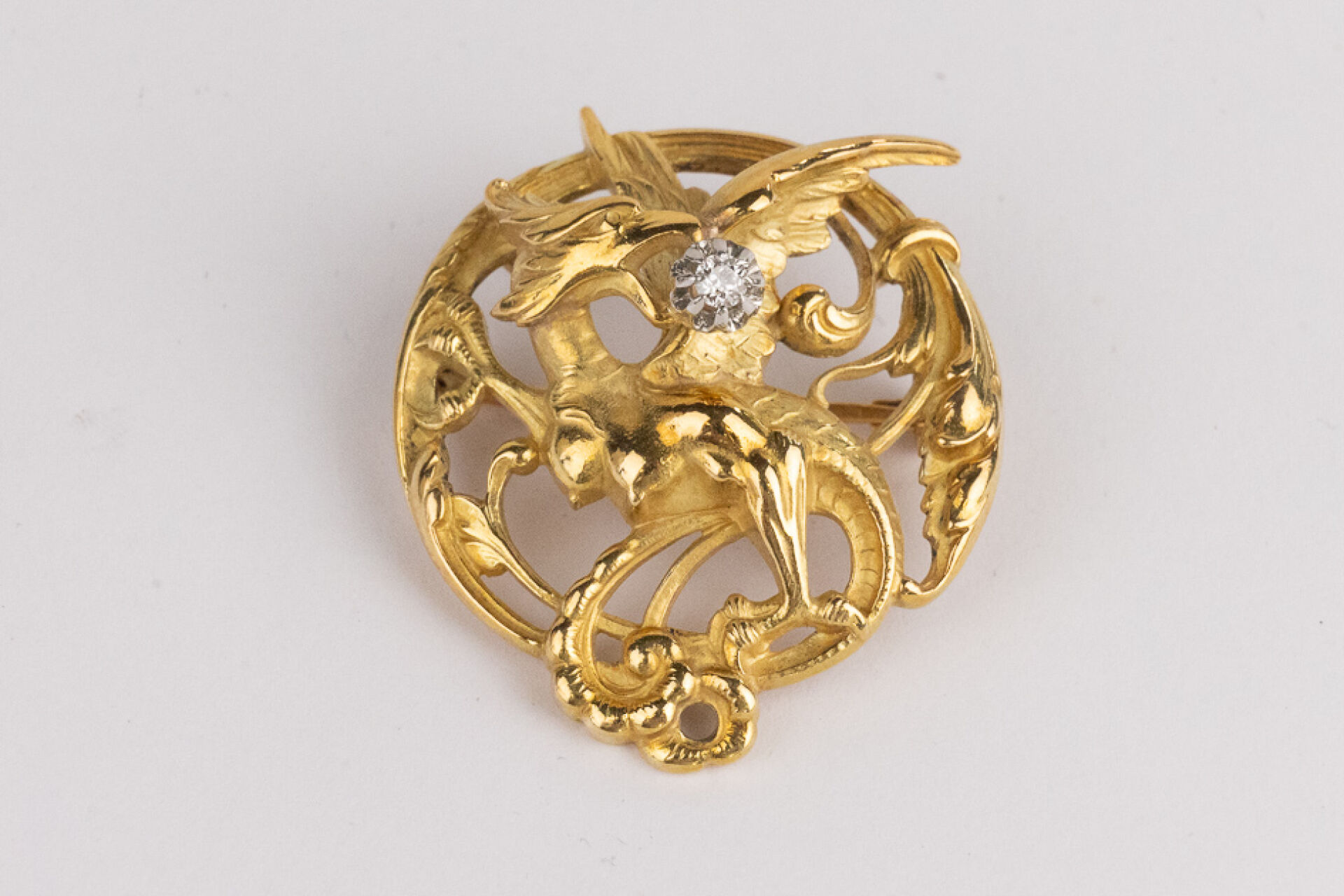 Broche circulaire, pouvant former pendentif, ajourée à l'hydre en or jaune 18k (750 millièmes) tenant dans sa gueule un diamant taille brillant. Diam. : 3.5 cm - Poids brut : 8.97 gr