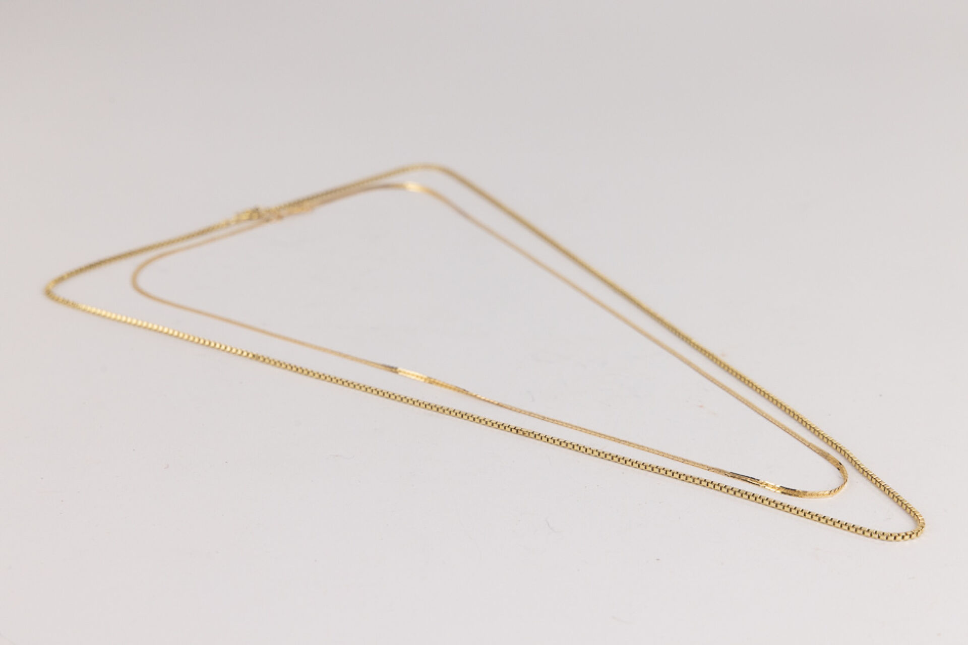 Lot en or jaune 14k (585 millièmes) comprenant deux chaines. Poids : 11,74 gr - Long. : 50 et 59 cm200