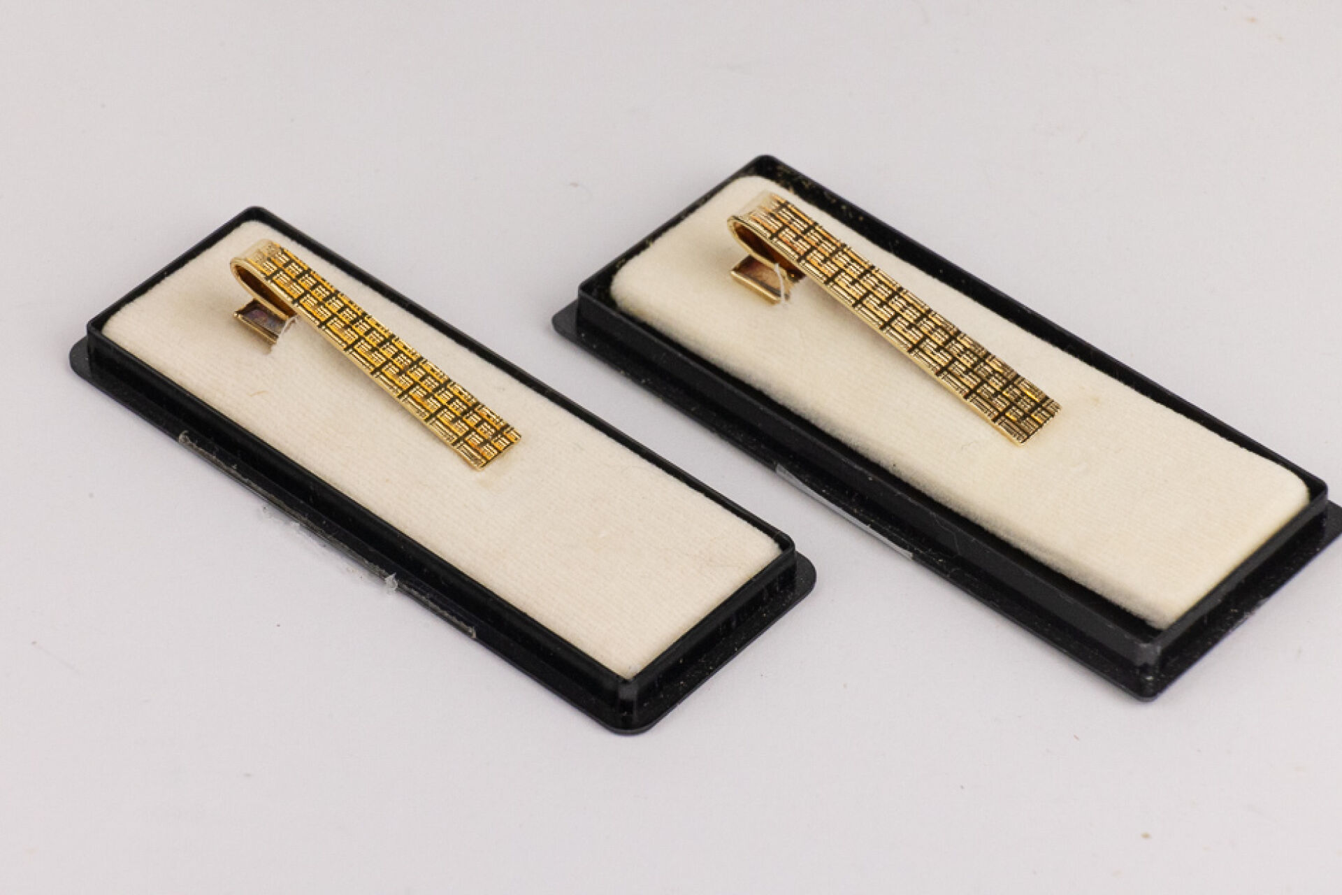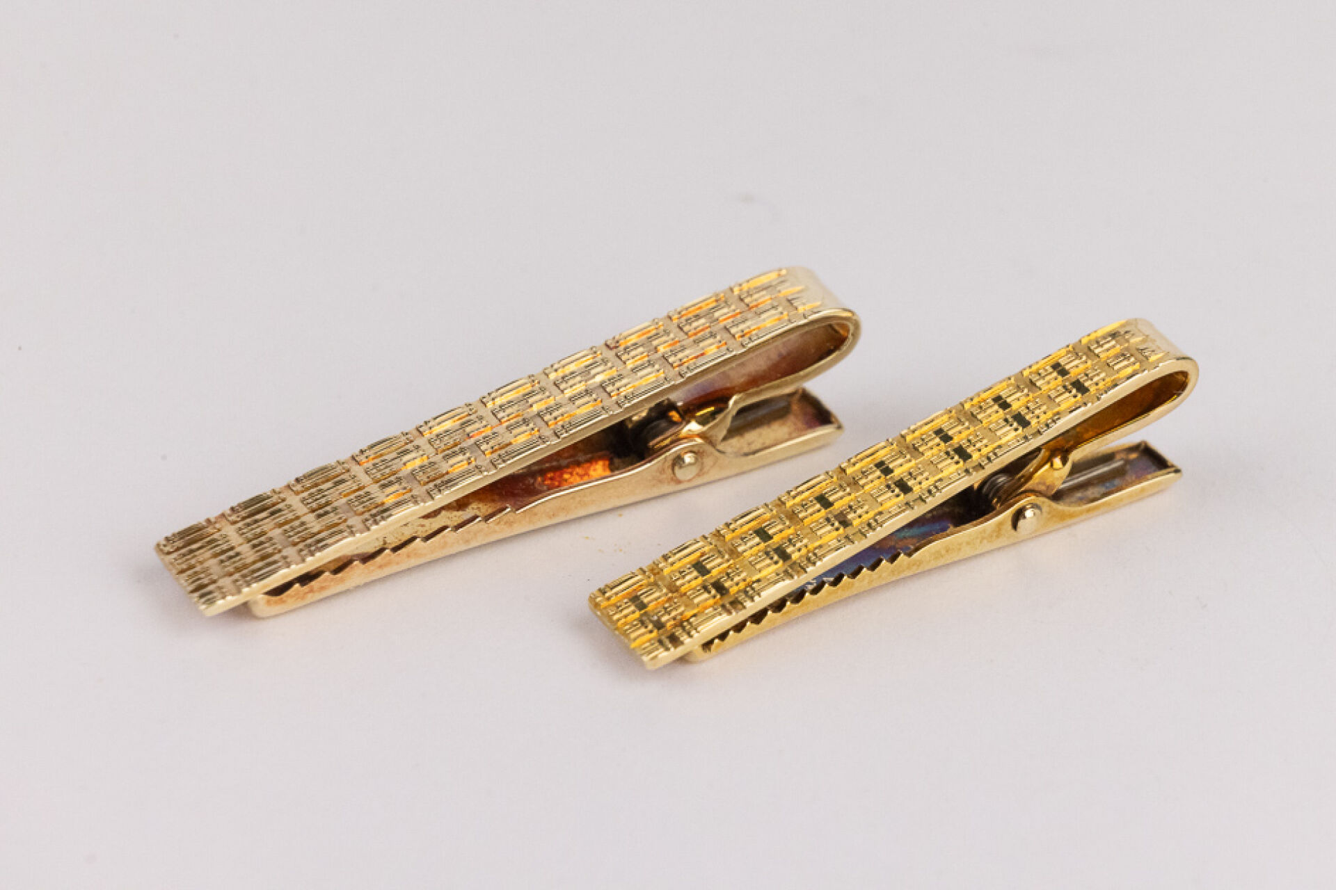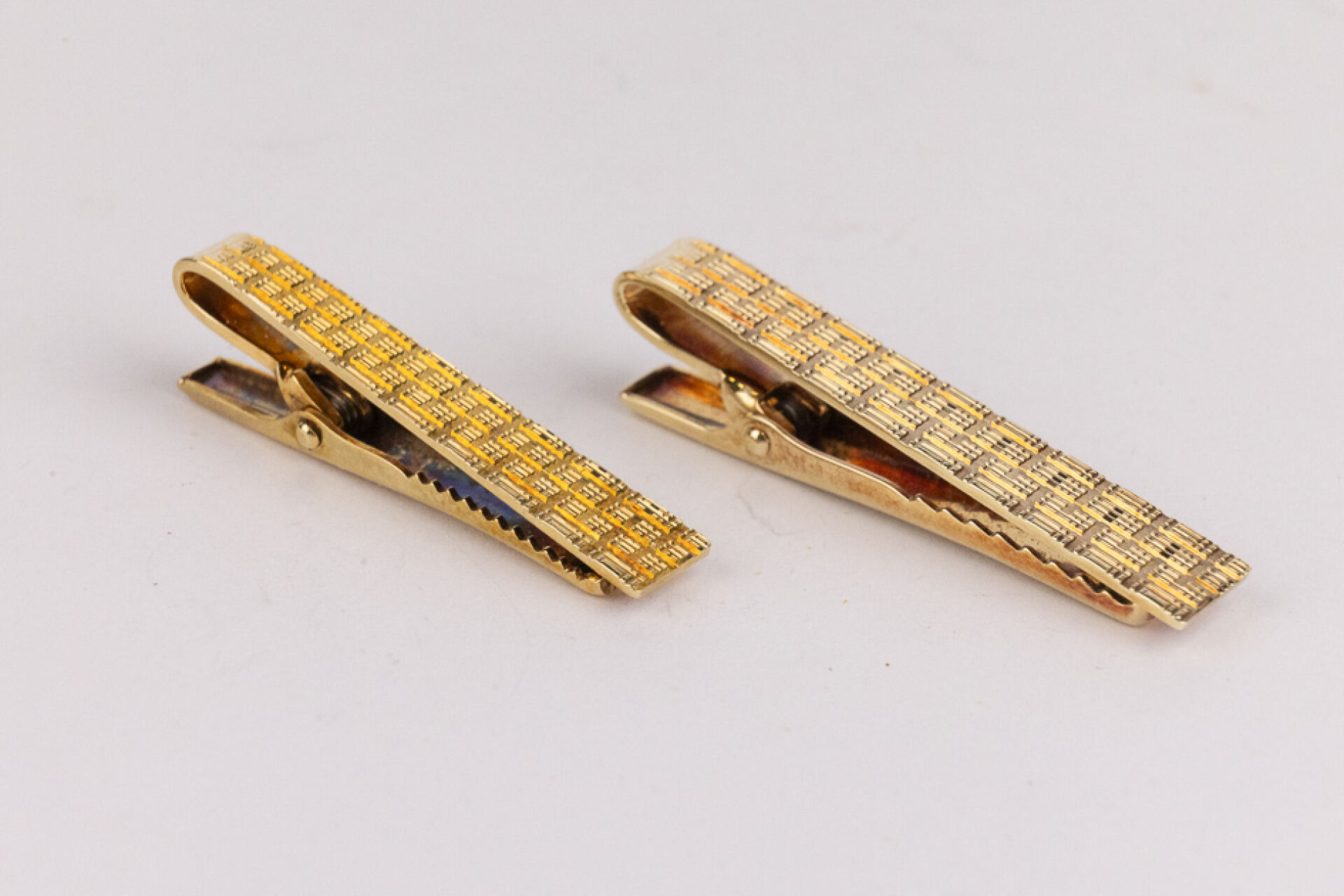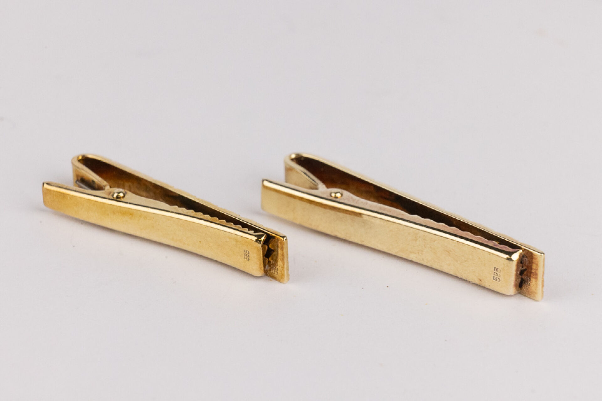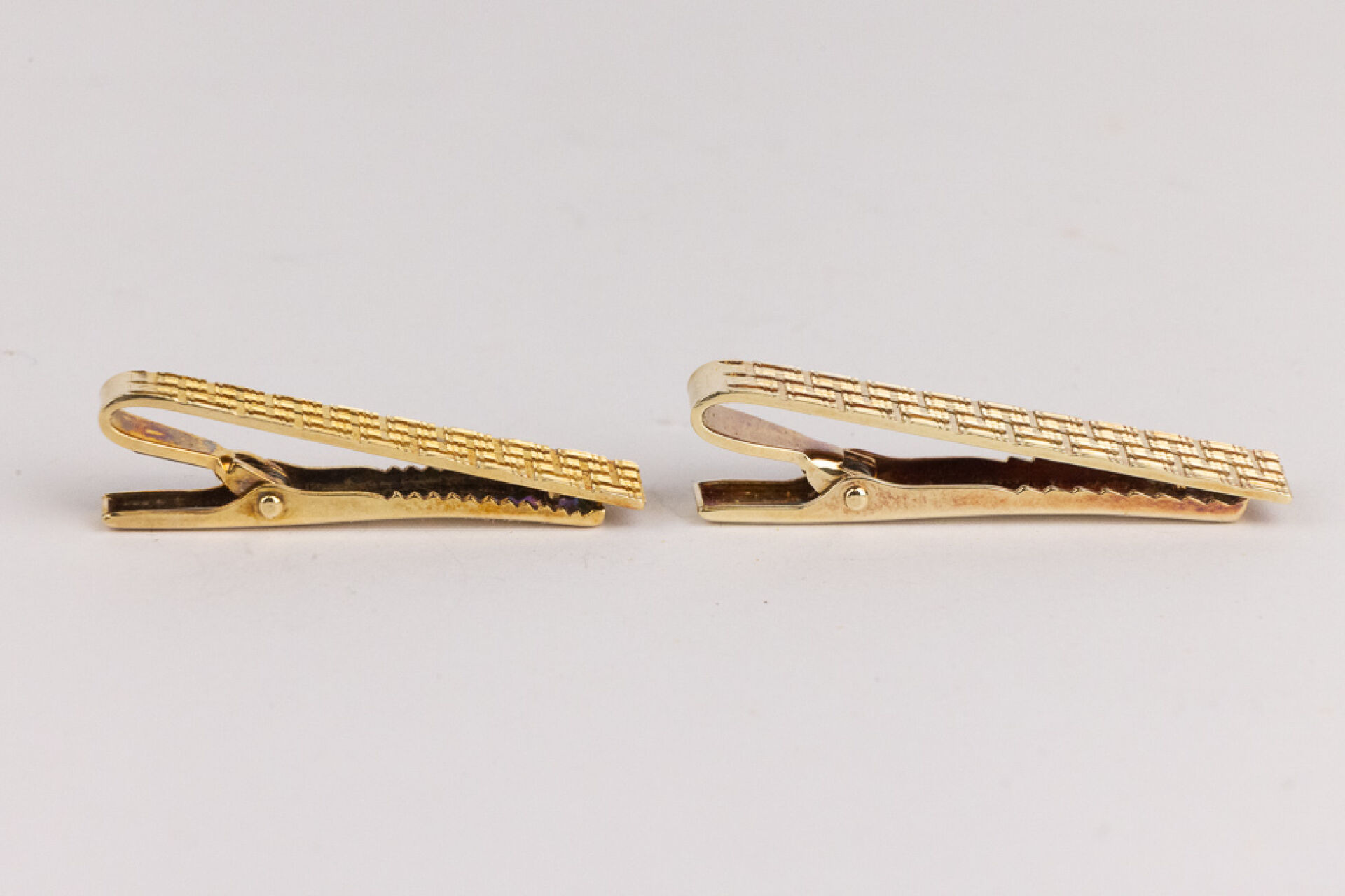 Lot comprenant deux pinces à cravate en or jaune 14k (585 millièmes) à décor géométriques. Poids : 12.41 gr