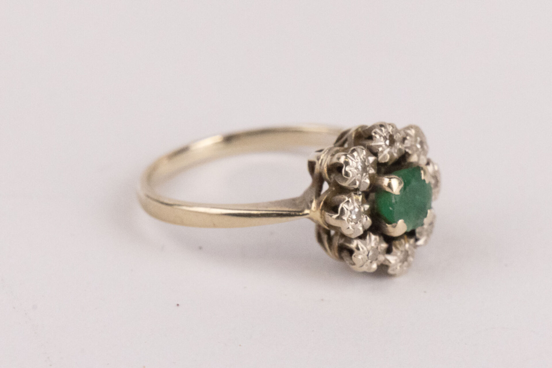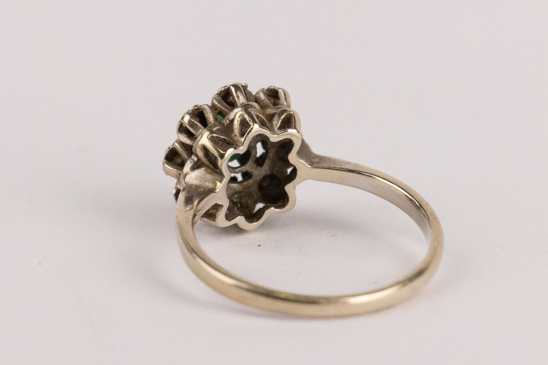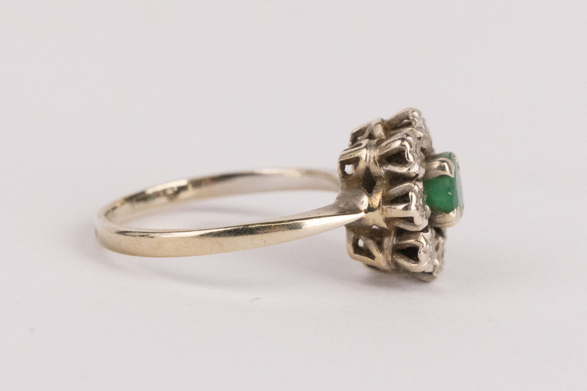 Bague "marguerite" en or gris 18k (750 millièmes), emeraude dans un entourage de huit petites pierres blanches. Poids brut : 2,25 gr - Tour de doigt 46