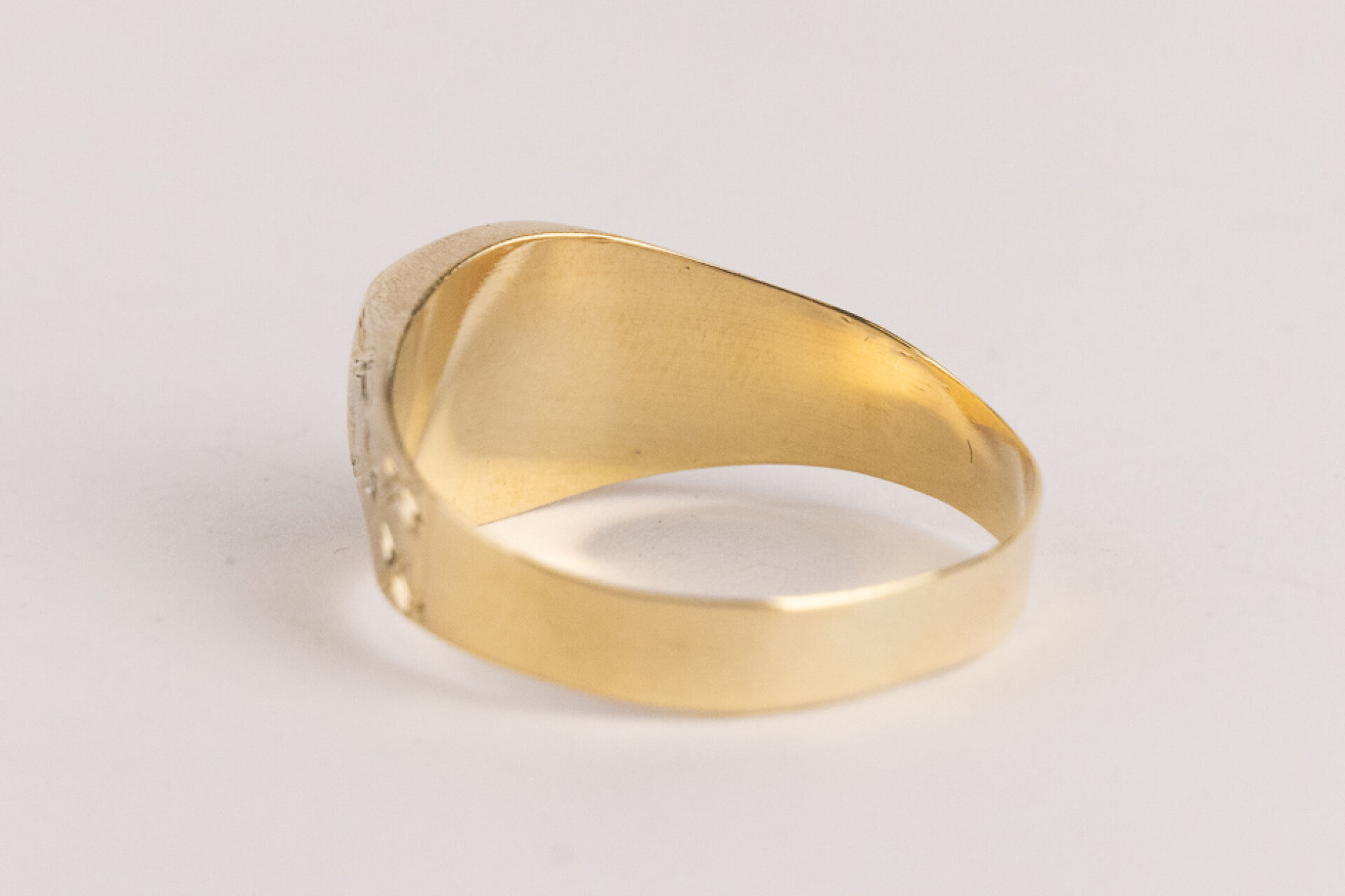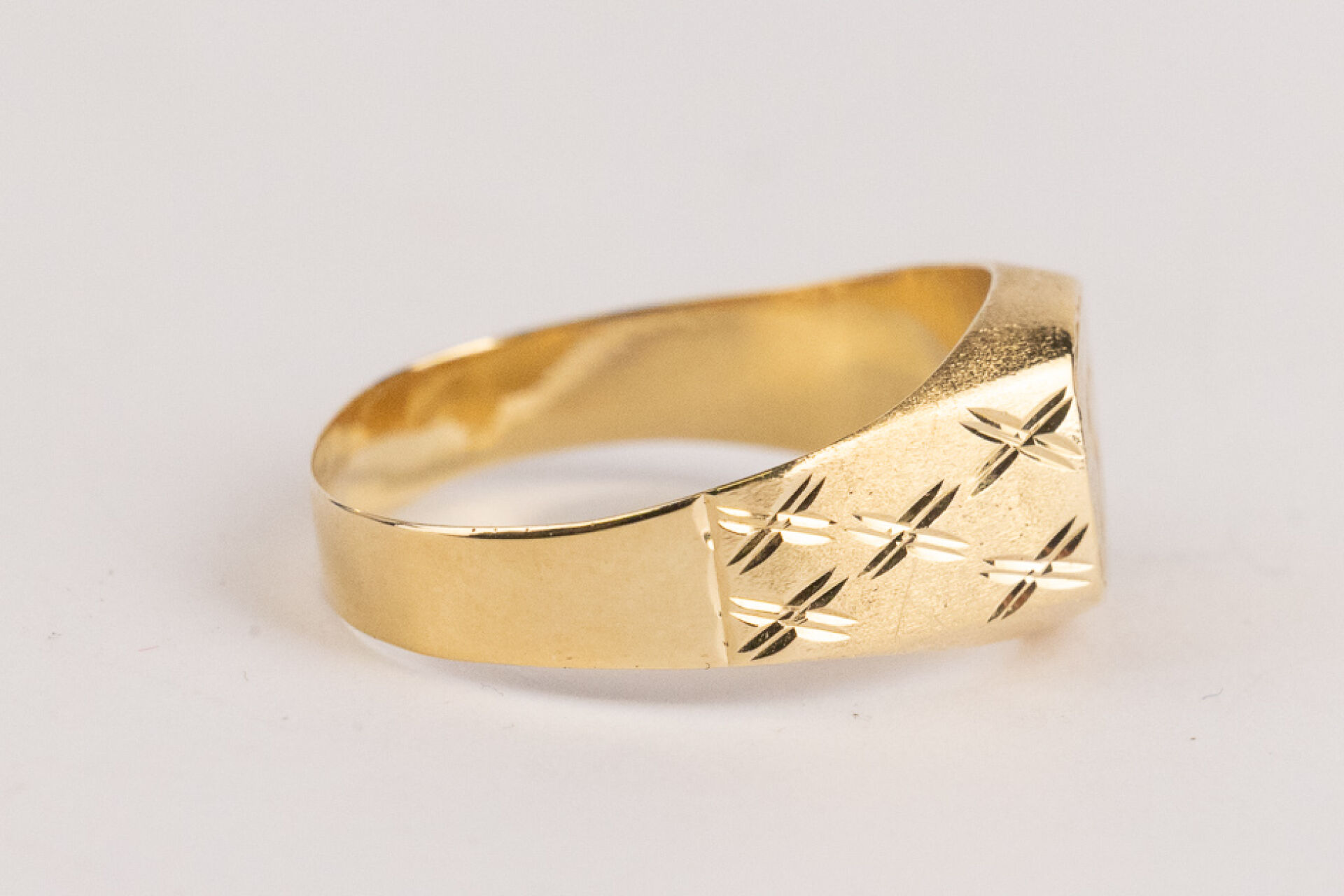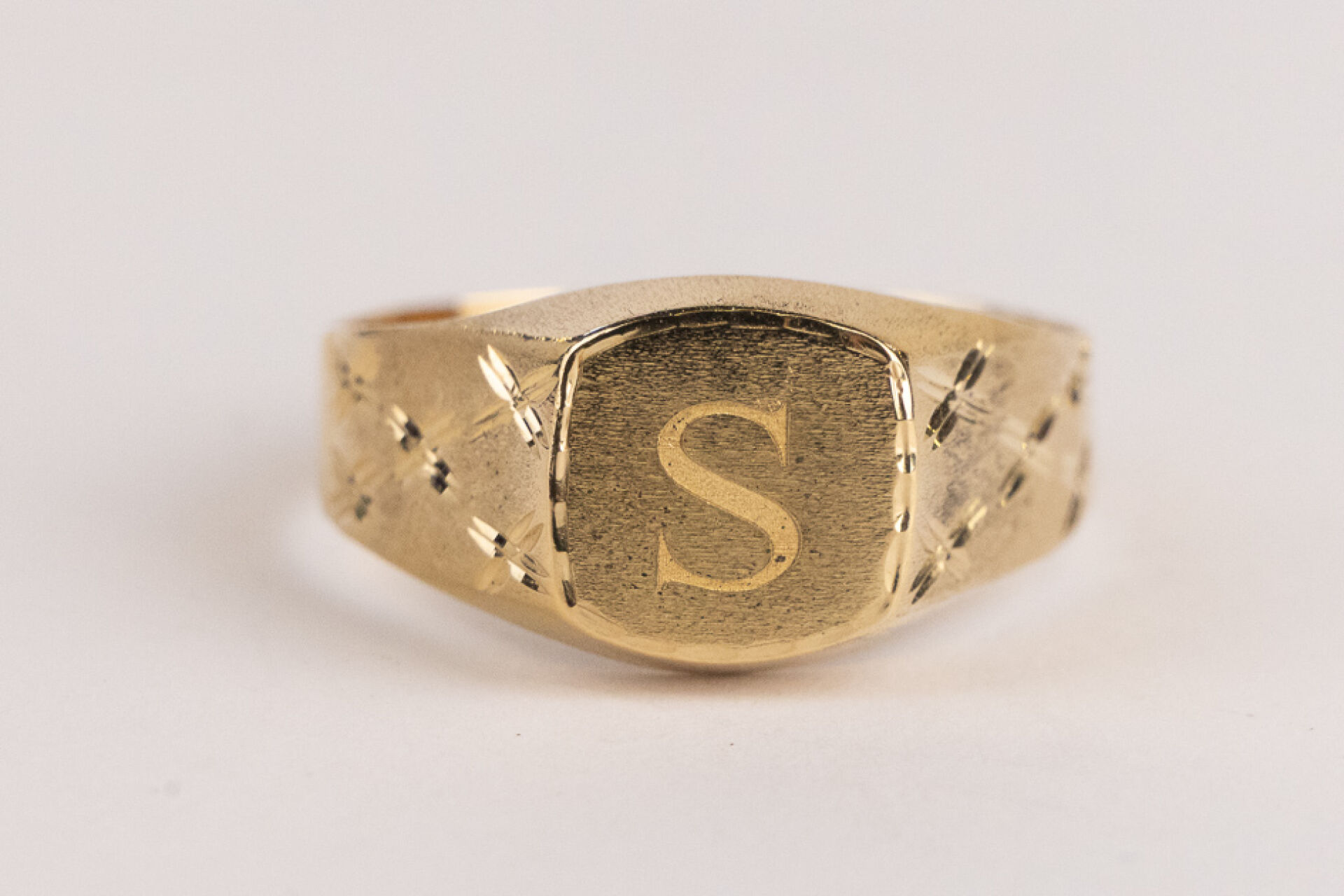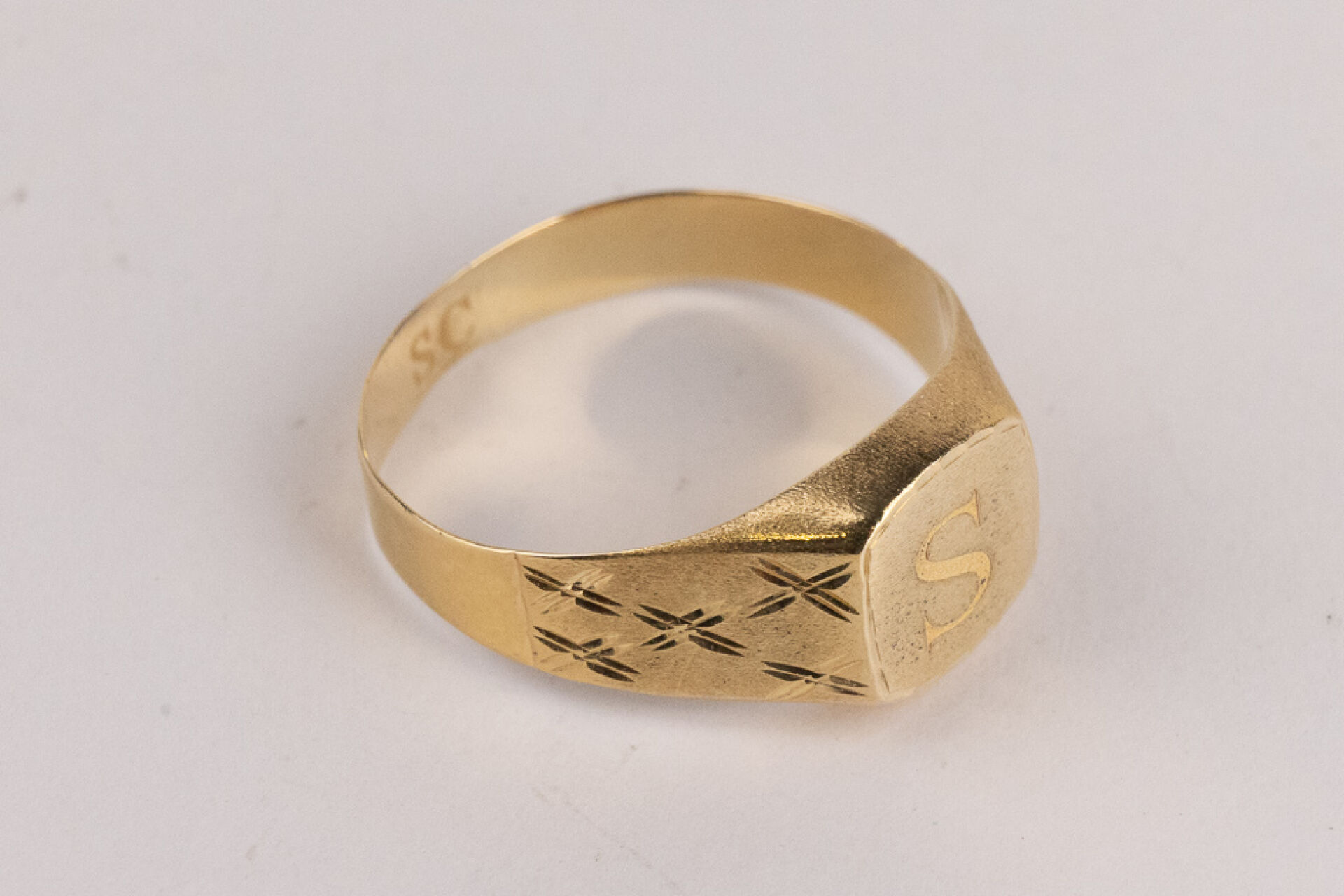Chevalière en or jaune 18k (750 millièmes), gravée d'un "S". Poids : 1,86 gr - Tour de doigt 61