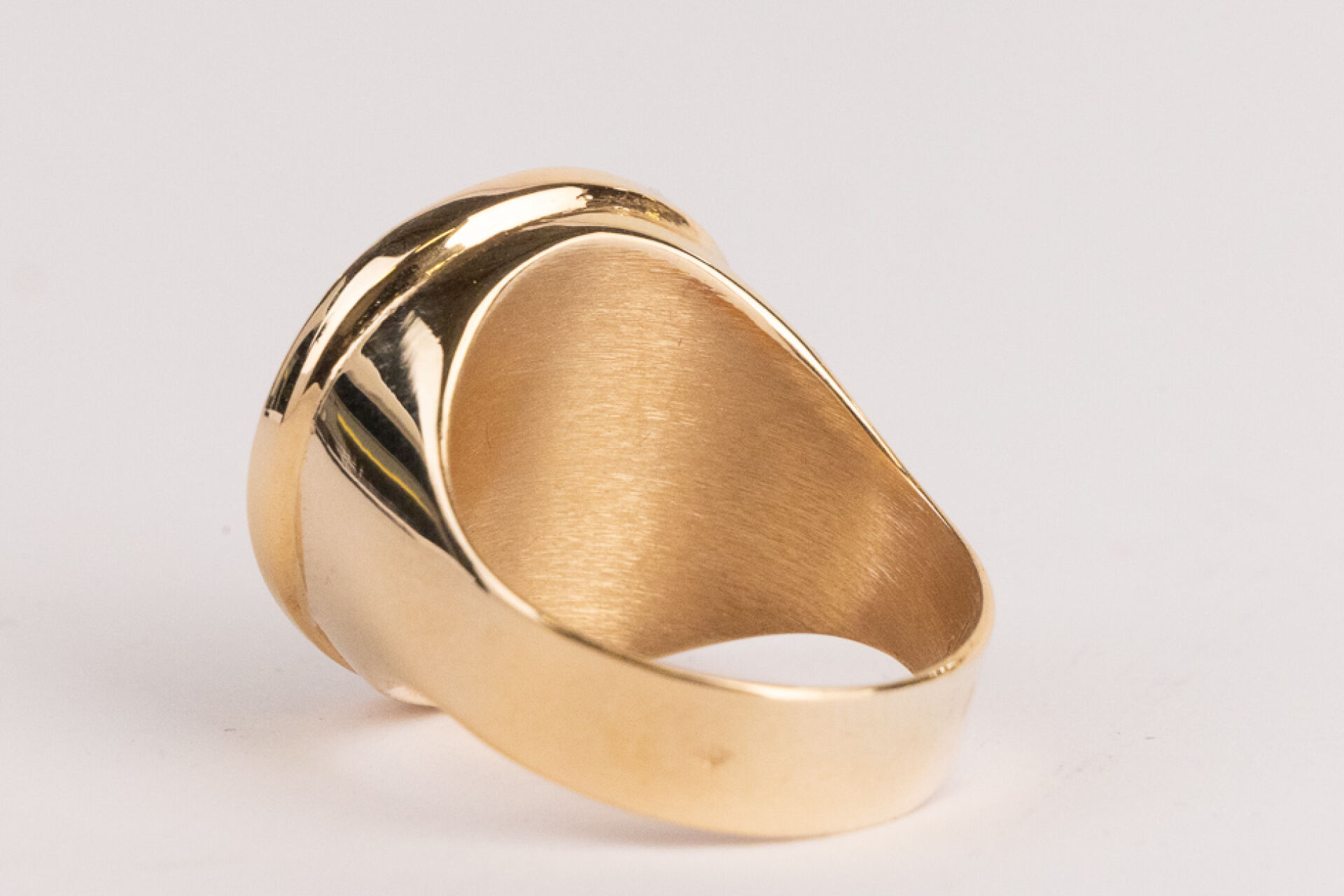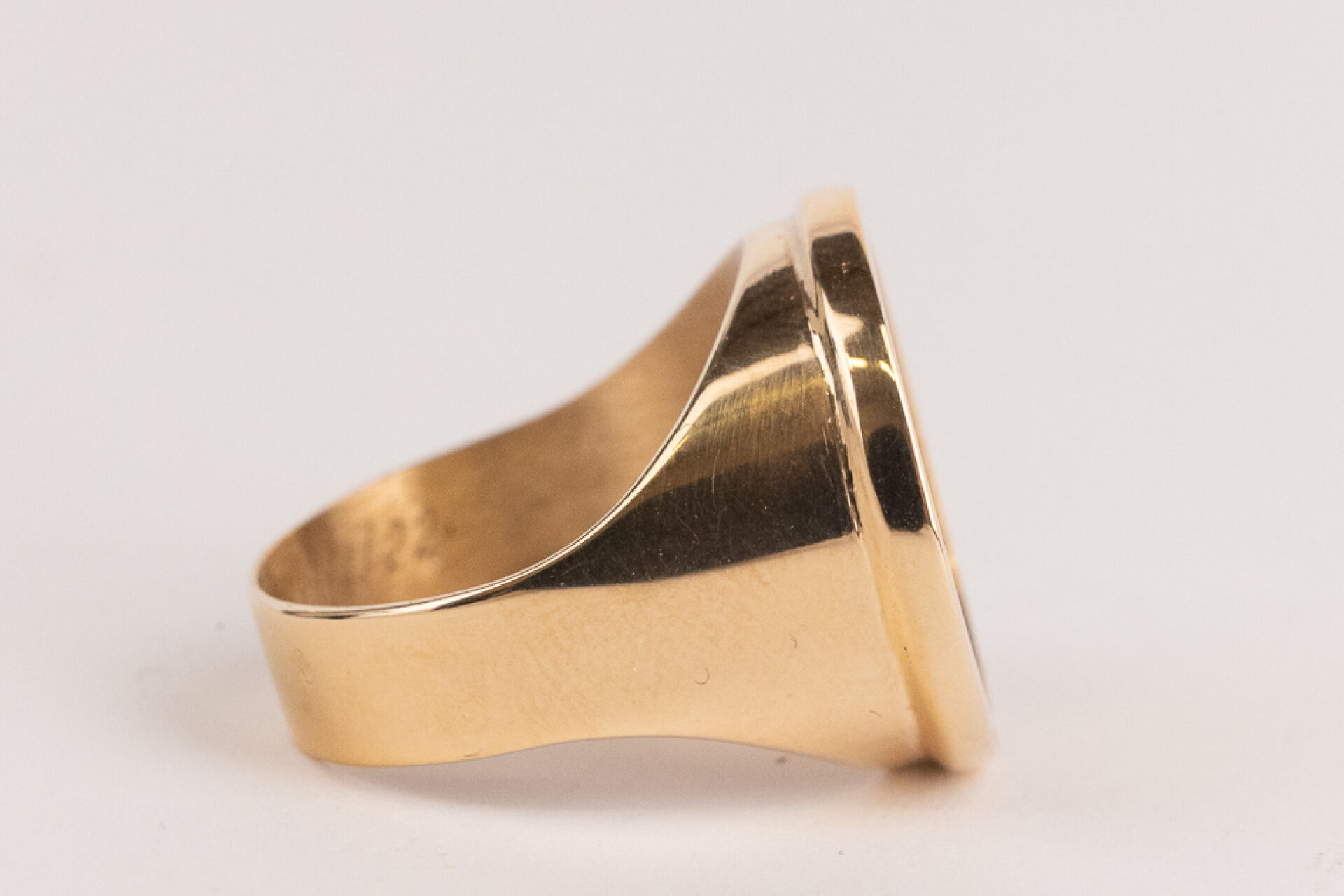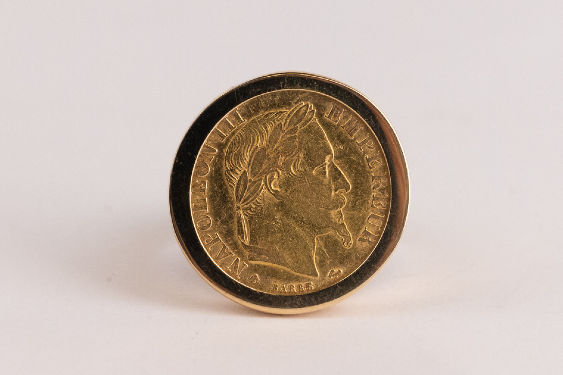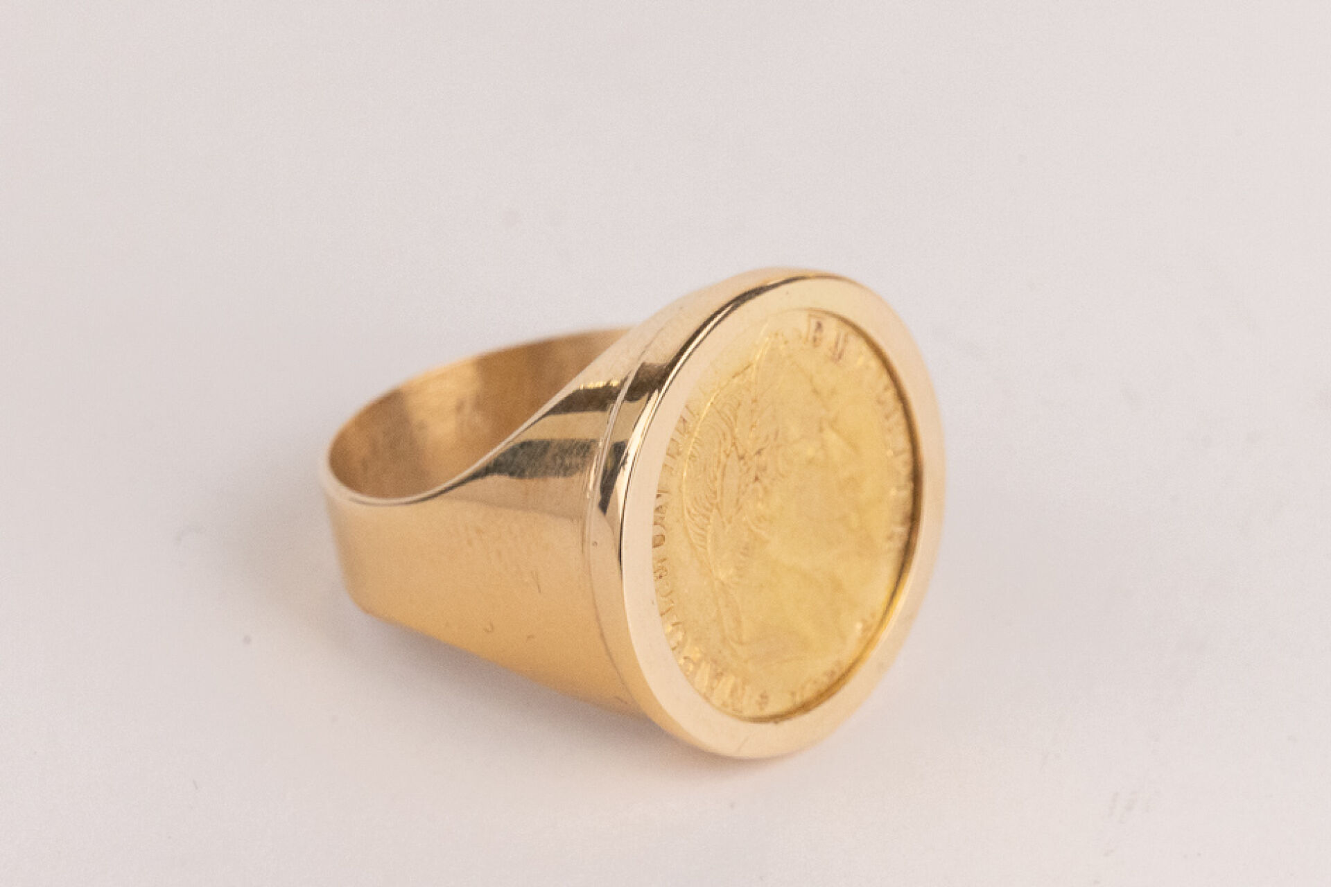 Bague en or jaune 18k (750 millièmes), sertie d'une pièce de 10 Francs or, Napoléon III Empereur. Poids : 10,57 gr - Tour de doigt 59