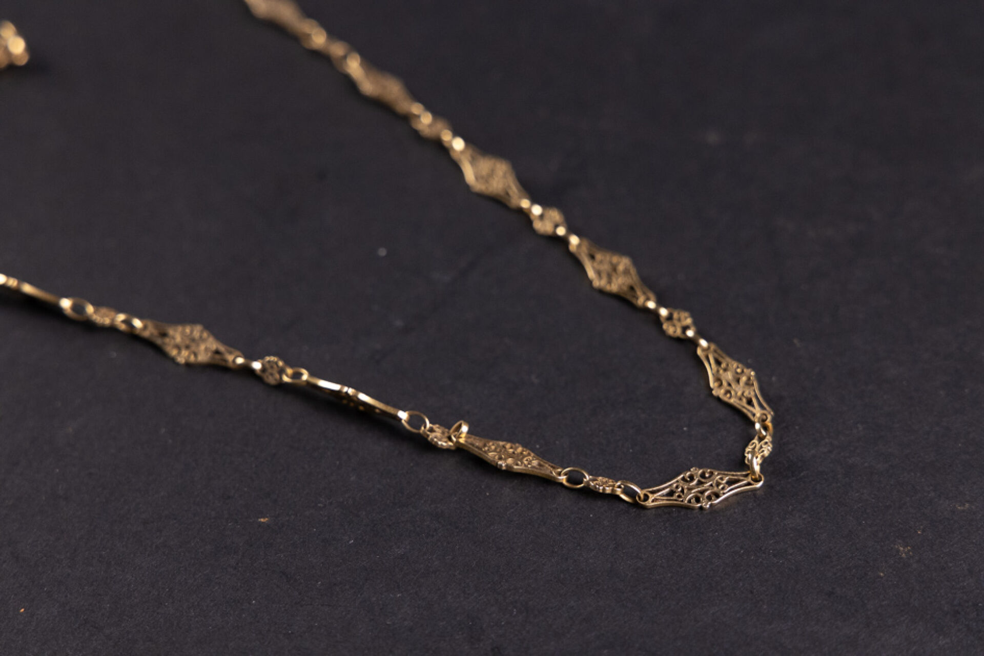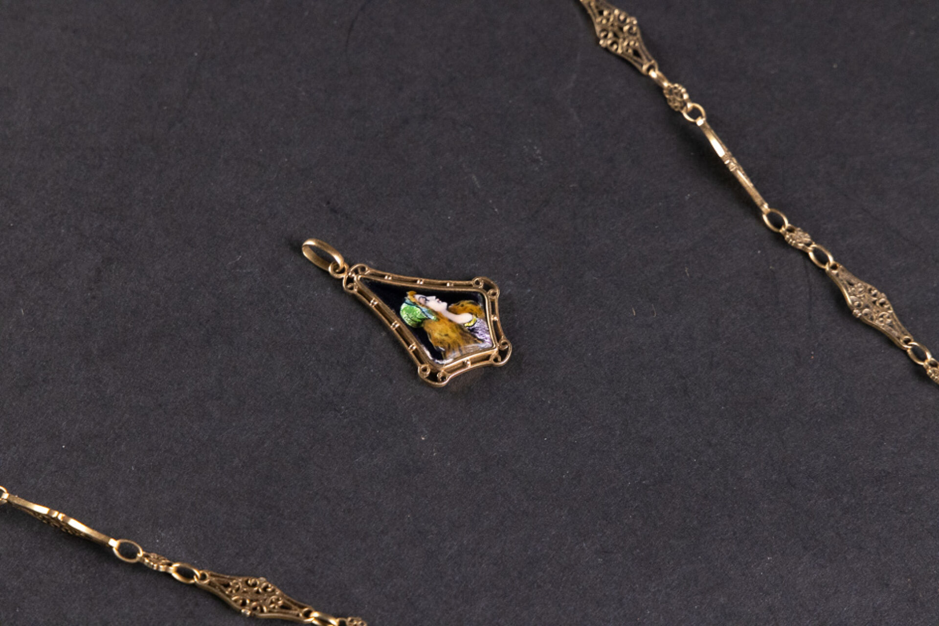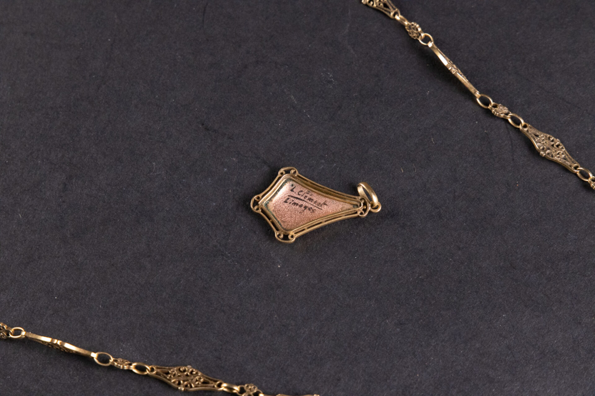 Sautoir en or jaune 18k (750 millièmes), le fermoir en or rose 18k (750 millièmes) (probablement rapporté). Poids : 21.6 gr On joint : Pendentif en or jaune 18k (750 millièmes) de forme piriforme enchâssant un profil de femme polychrome peint sur émail signé au revers L. CLEMENT Limoges. Poids brut : 2.6 gr