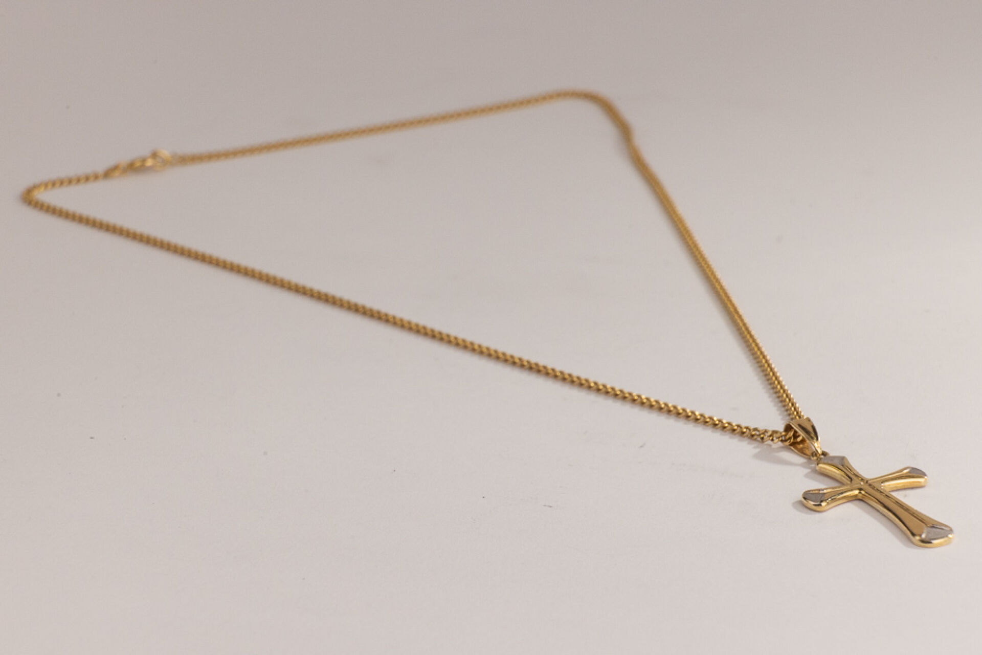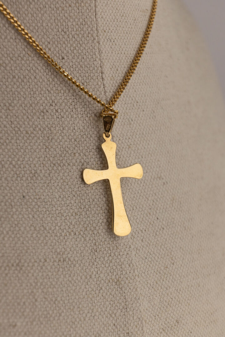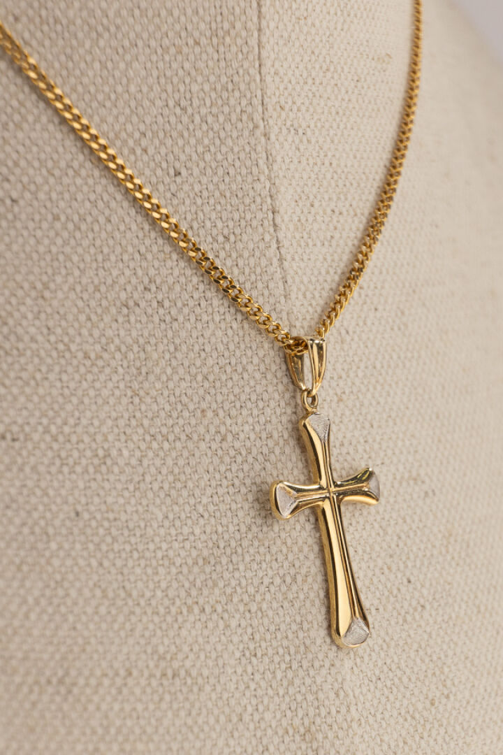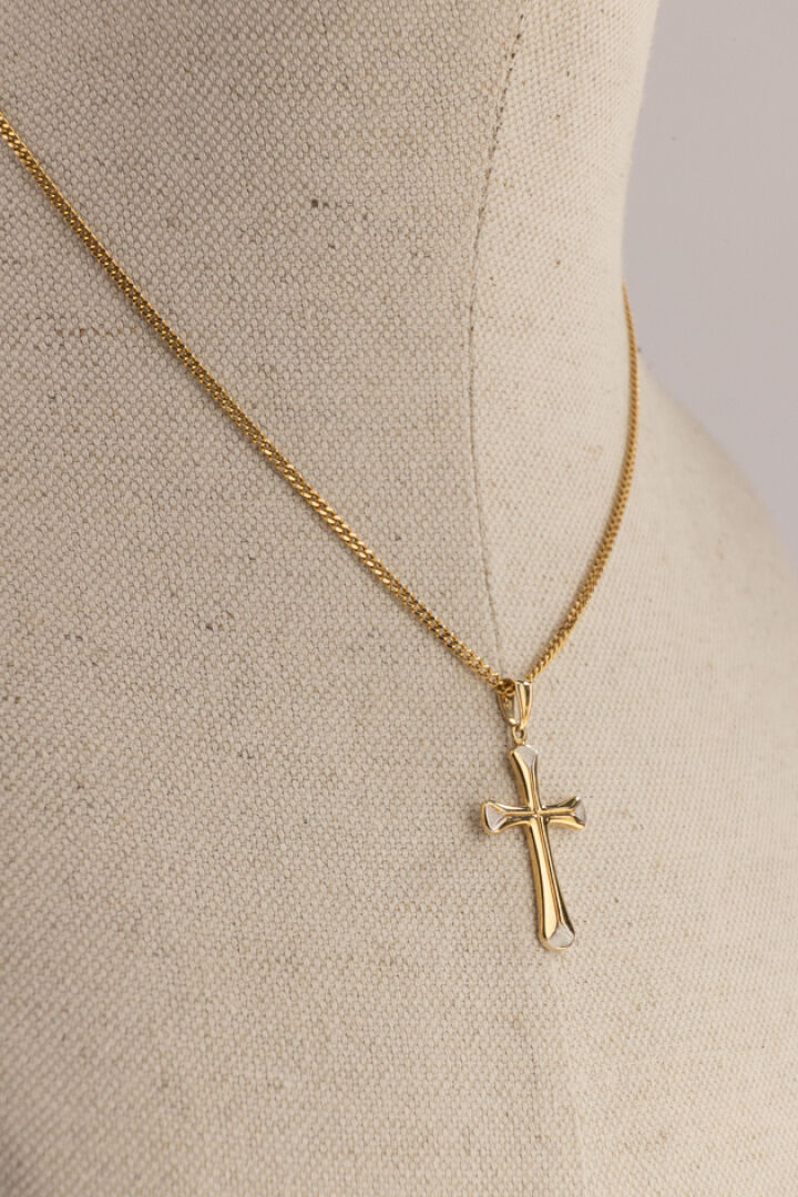 Chaine en or jaune 18k (750 millièmes), maille gourmette, retenant une croix stylisée en or jaune et or gris 18k (750 millièmes). Poids : 7,65 gr - Long. De la chaine : 42 cm - Haut de la croix (sans la bélière) : 2,8 cm