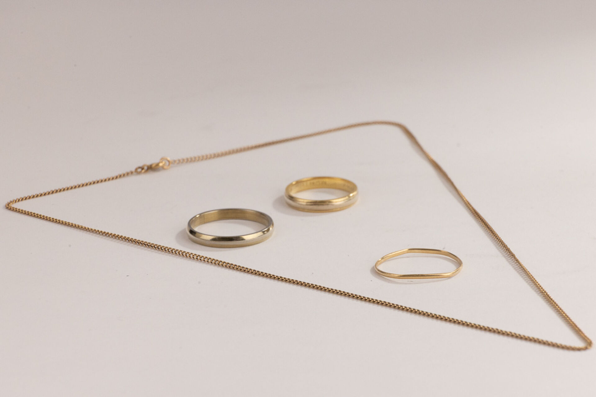Ensemble comprenant une chaine maille gourmette en or jaune 18k (750 millièmes) et trois alliances en or jaune 18k (750 millièmes). Poids : 9,19 gr - Long. De la chaine : 47 cm - Tours de doigt 54, 61 et 63 (une alliance déformée)