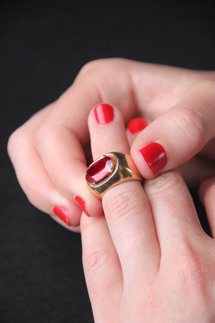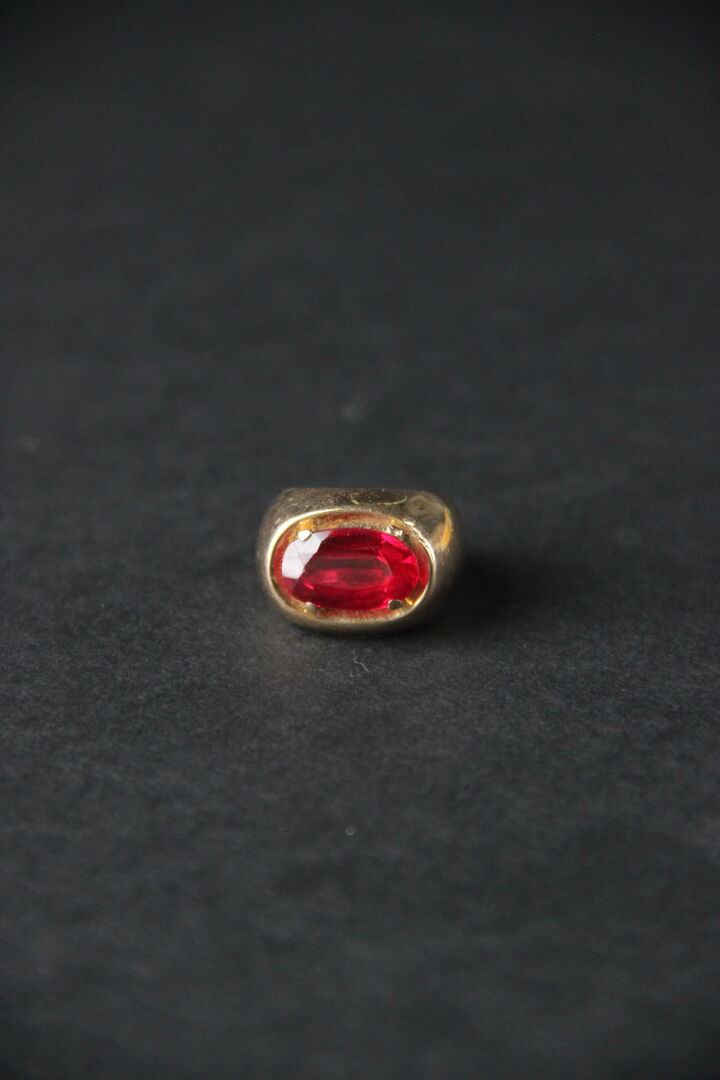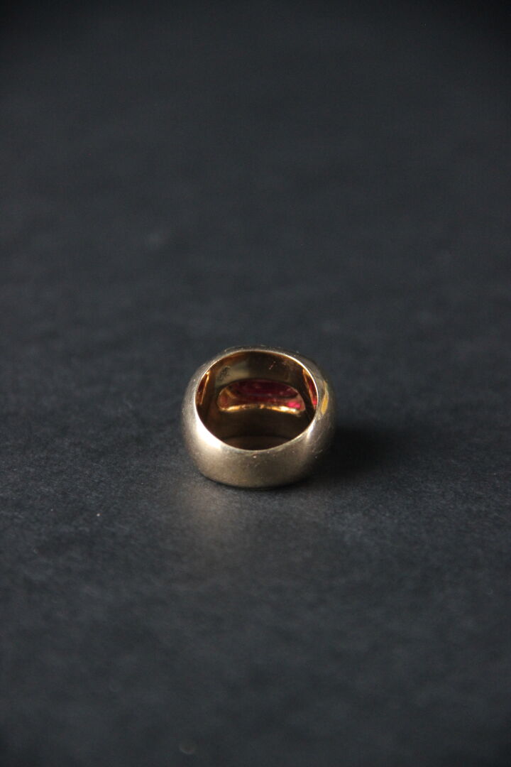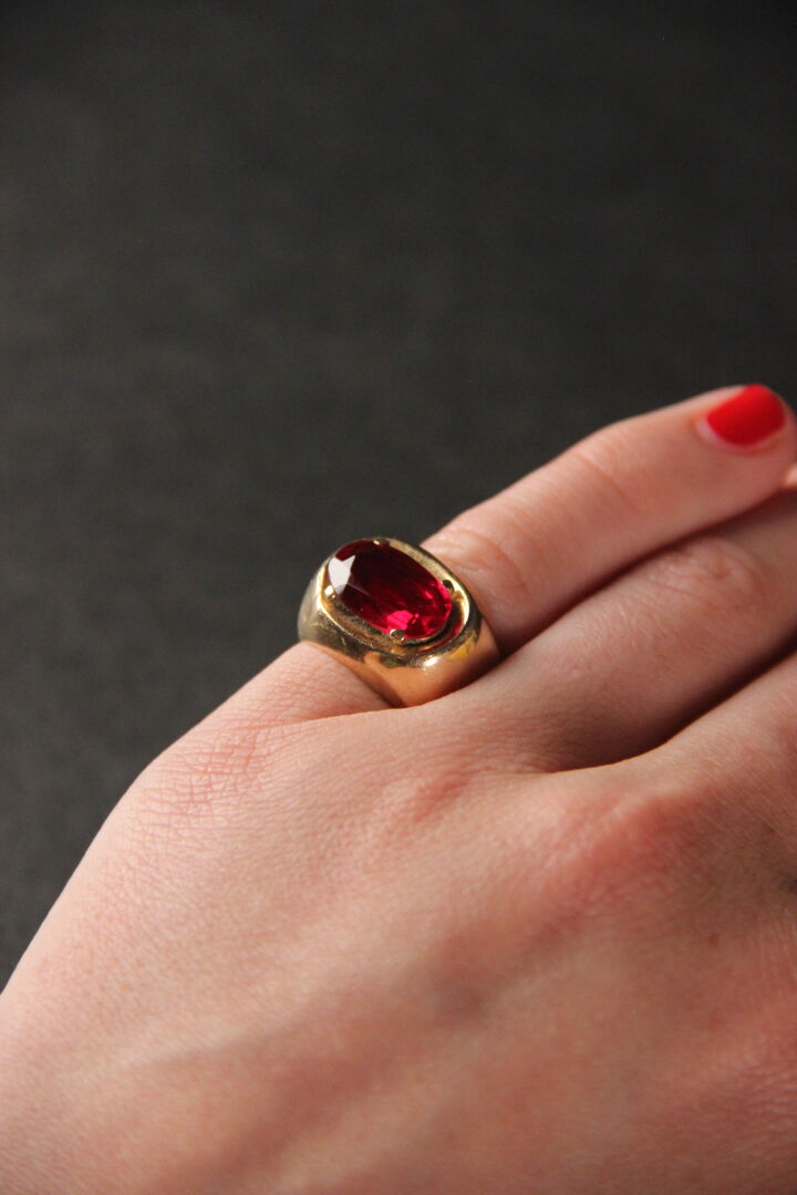Bague en or jaune 18k (750 millièmes), cabochon pierre de synthèse rouge. Poids brut : 10.71 gr - Tour de doigt 51