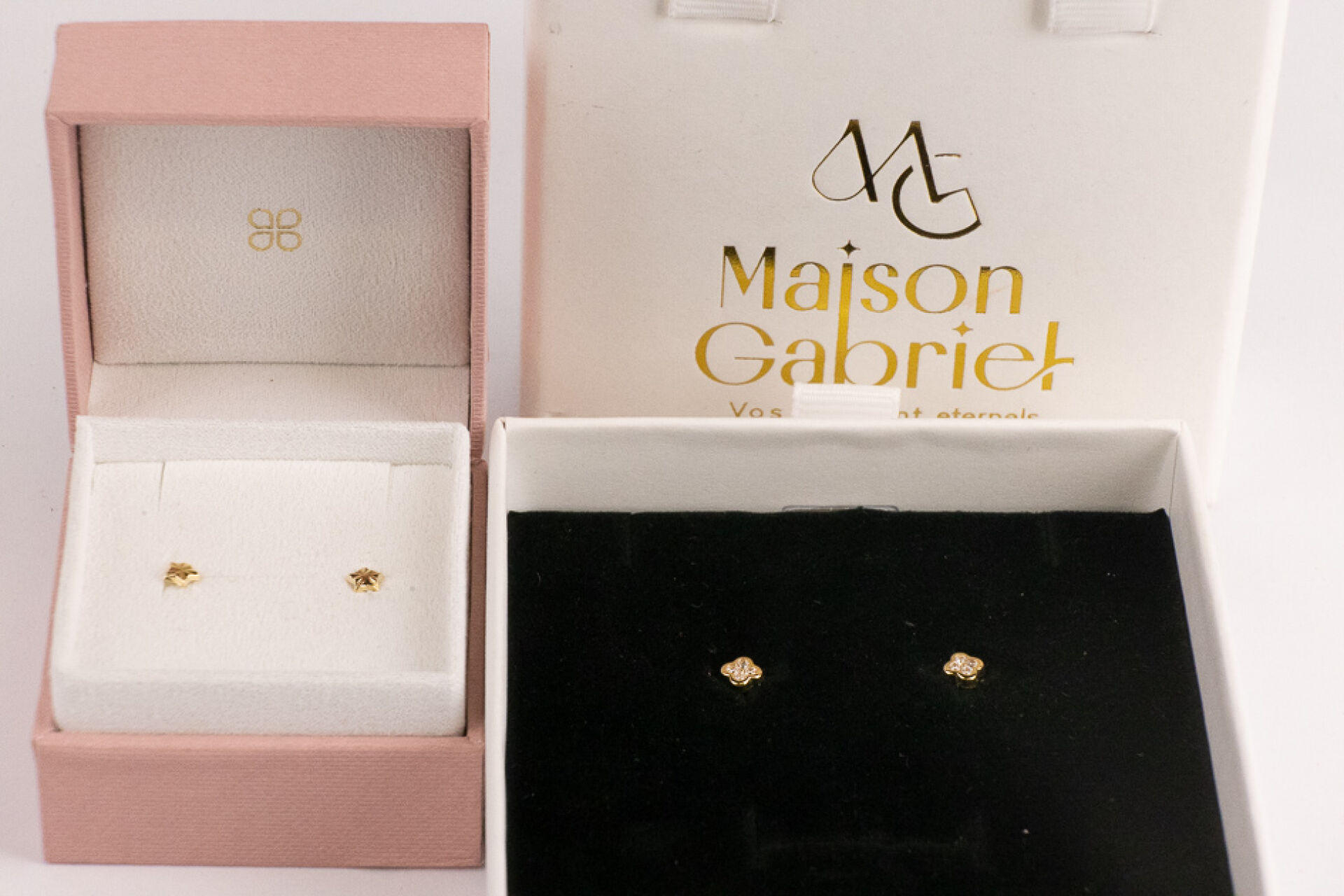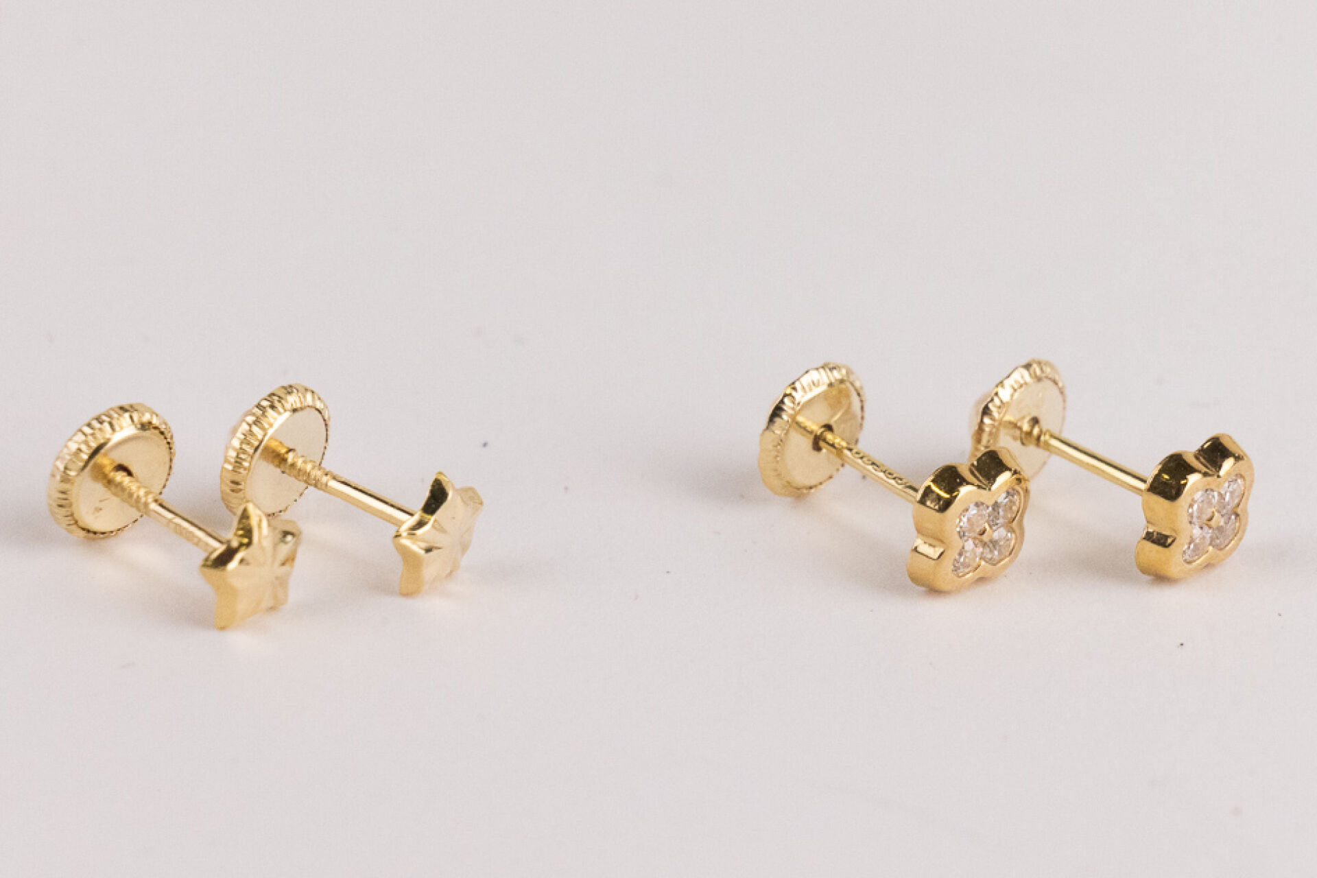 Ensemble de deux paires de clous d'oreille en or jaune 18k (750 millièmes) formant des étoiles. Poids brut : 0,76 gr