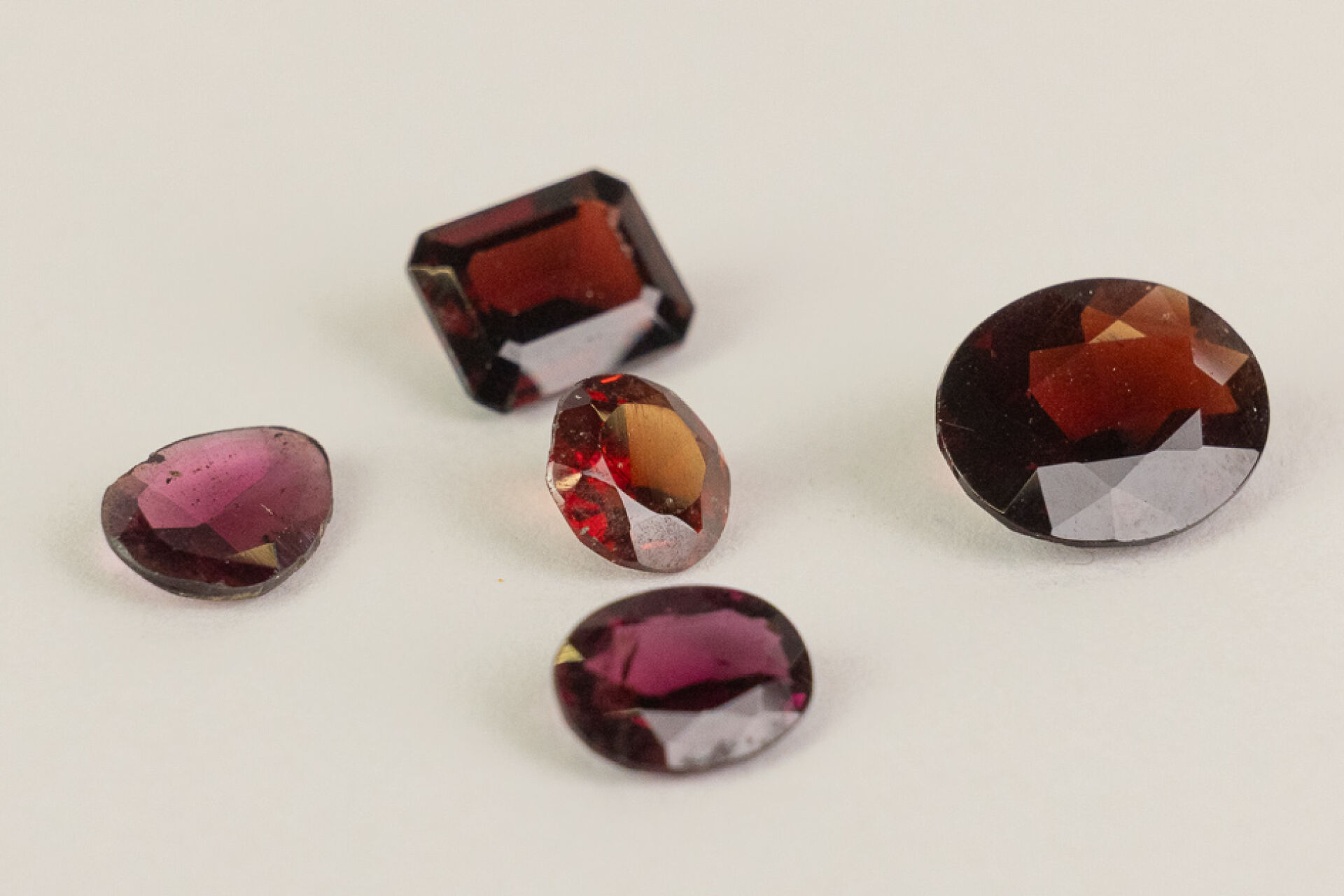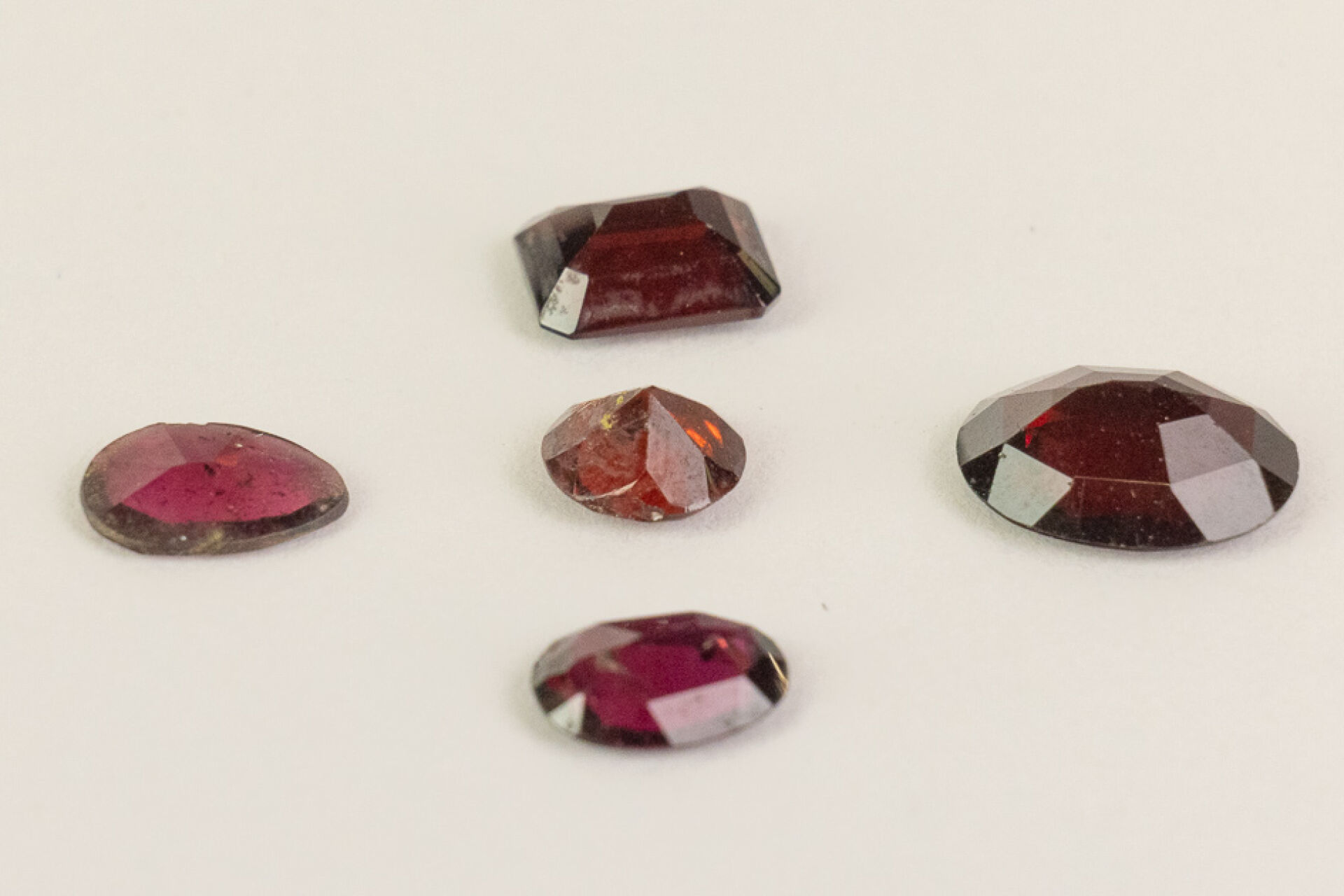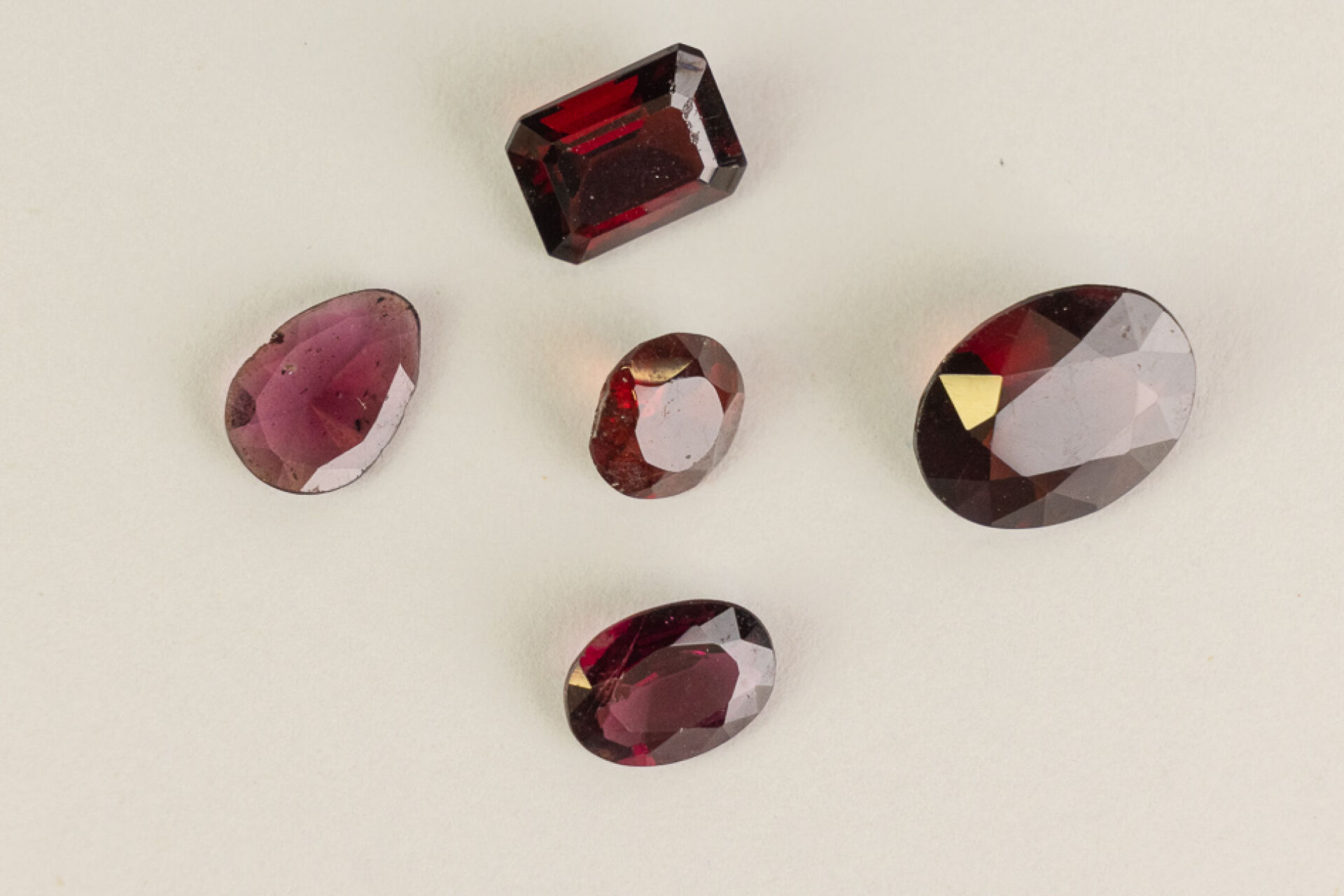 Lot composé de cinq pierres supposées grenats sur papier de formes différentes. Poids total : 10,15 carats environ (égrisures sur l'un) Conditions de vente spécifiques : Les gemmes, pierres et perles peuvent avoir fait l'objet de pratiques d'embellissement (huilage pour les émeraudes, traitement thermique pour les saphirs ou les rubis, blanchiment pour les perles). Ces améliorations sont considérées comme traditionnelles et sont admises par le commerce international des pierres gemmes et des perles. Par conséquent, ces traitements ne sont pas mentionnés au catalogue. De plus, les pierres n'ayant pas été desserties pour fait l'objet d'un examen approfondi en laboratoire, leur poids en carats vous est fourni à titre indicatif et précédé de la mention « environ ».
