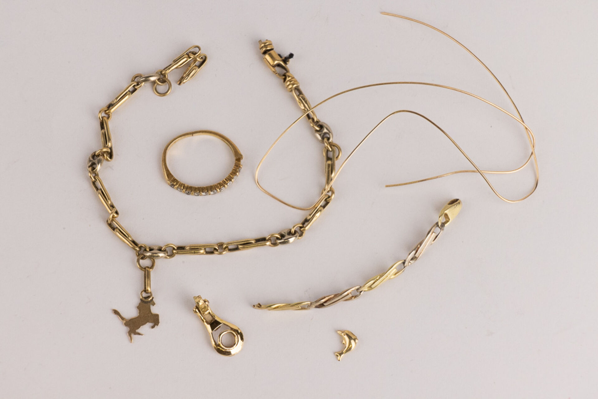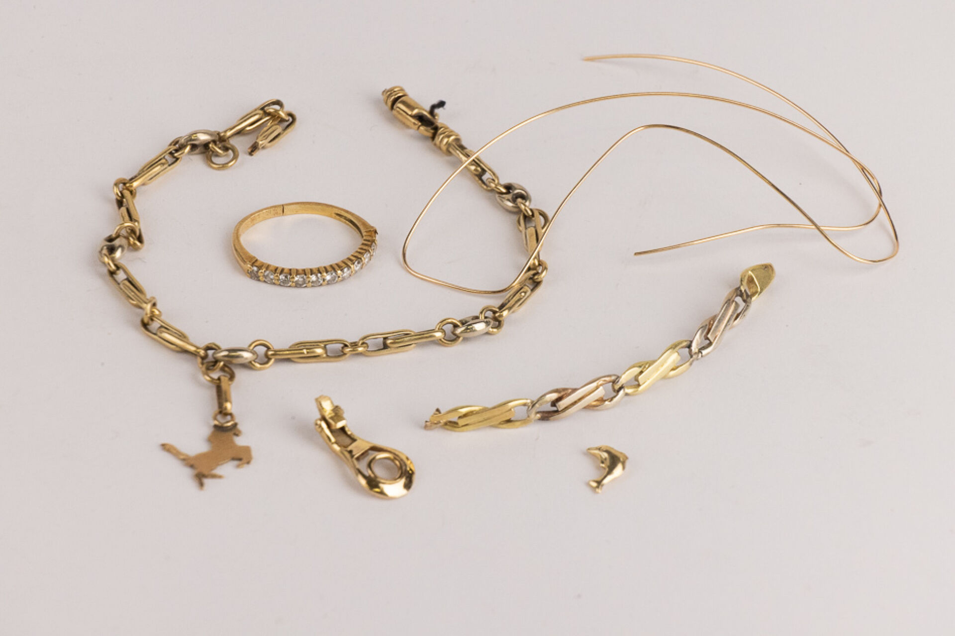 Débris d'or jaune 18k (750 millièmes) comprenant une bague accidentée, un morceau de bracelet, un bracelet accidenté et une tige. Poids brut : 13,70 gr