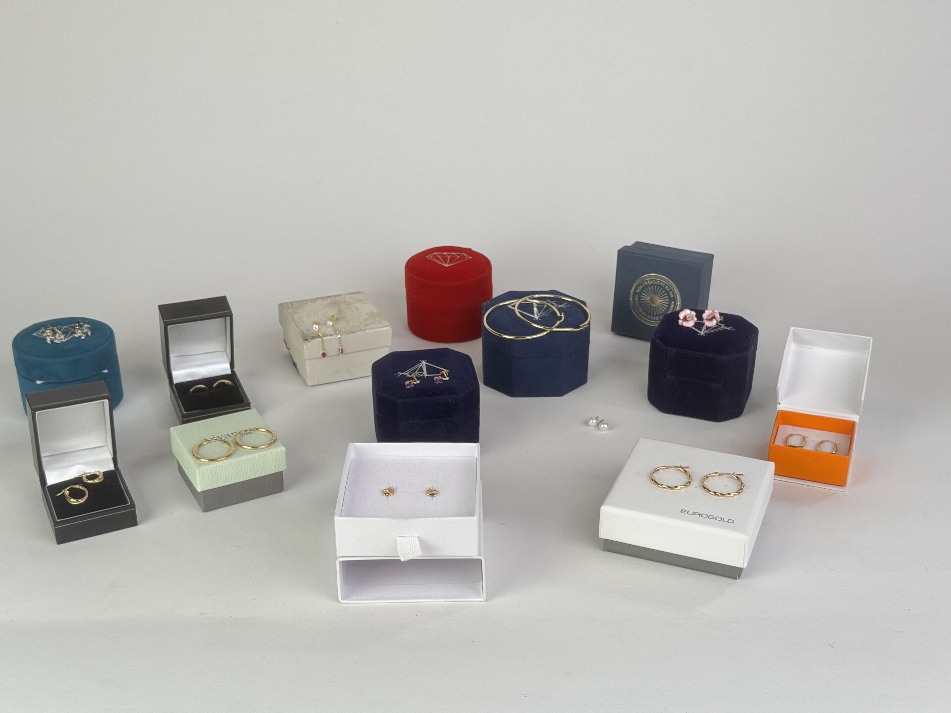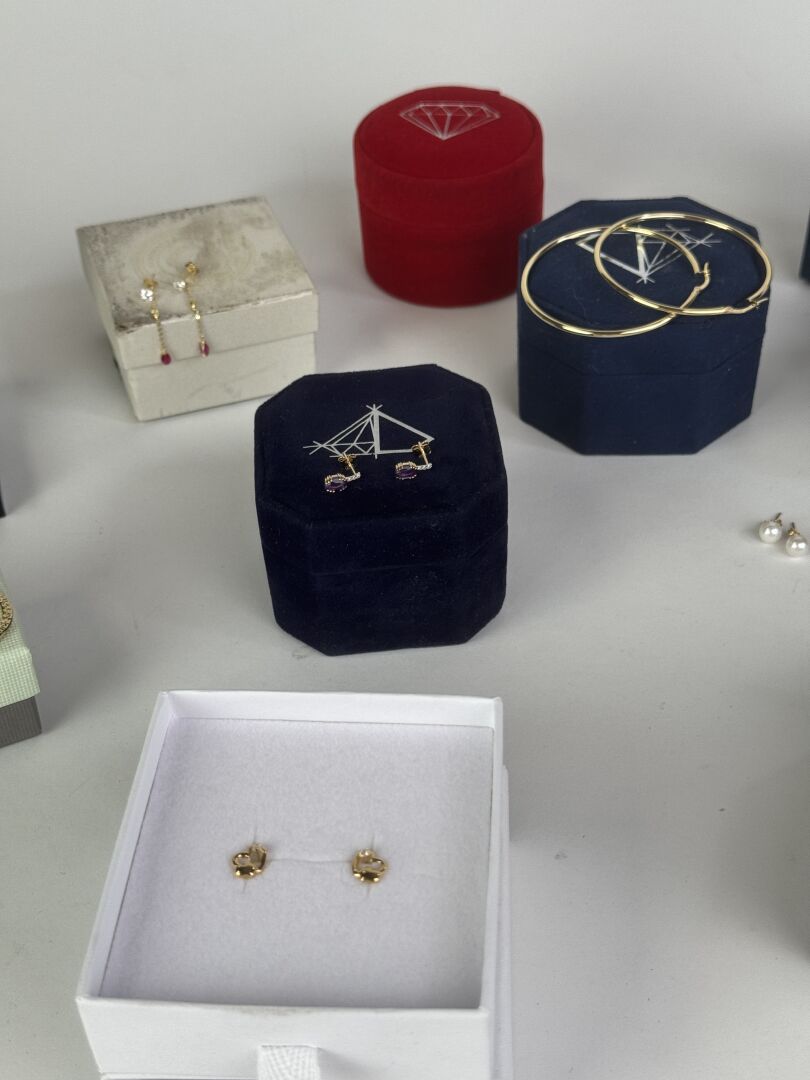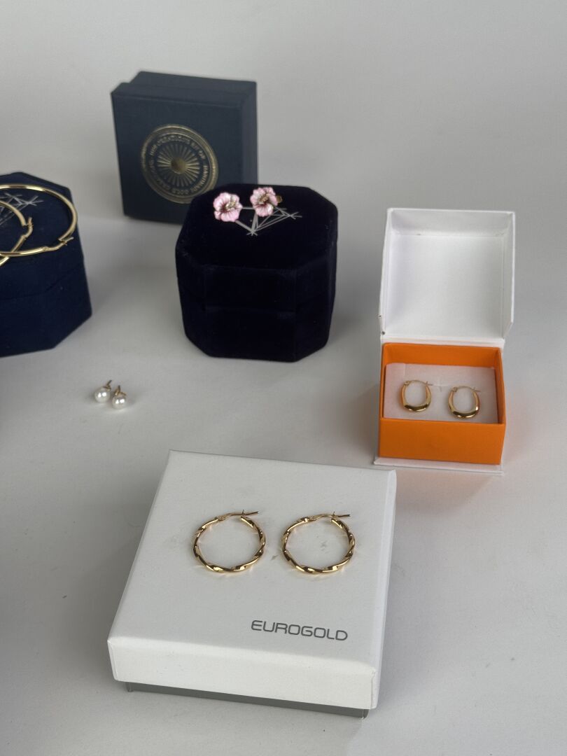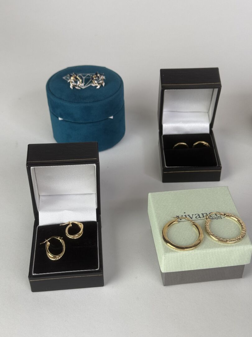 Ensemble d'environ dix paires de boucles d'oreilles en or jaune et or gris 9k (375 millièmes), écrins. Diverses marques dont LA MAISON DE LA JOAILLERIE, LE COMPTOIR DU DIAMANT, PREMIER CADEAU,… Poids brut : 16,38 gr