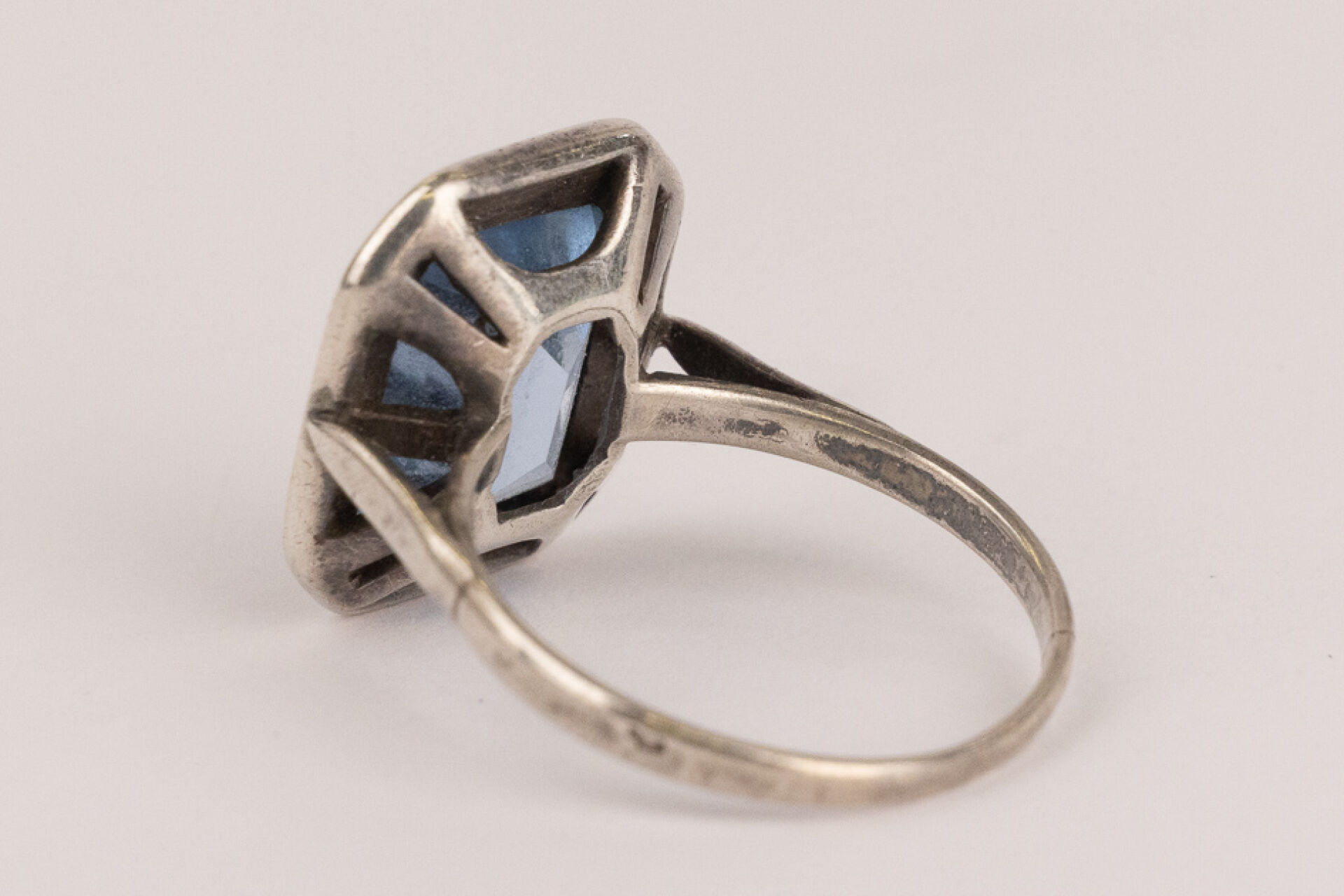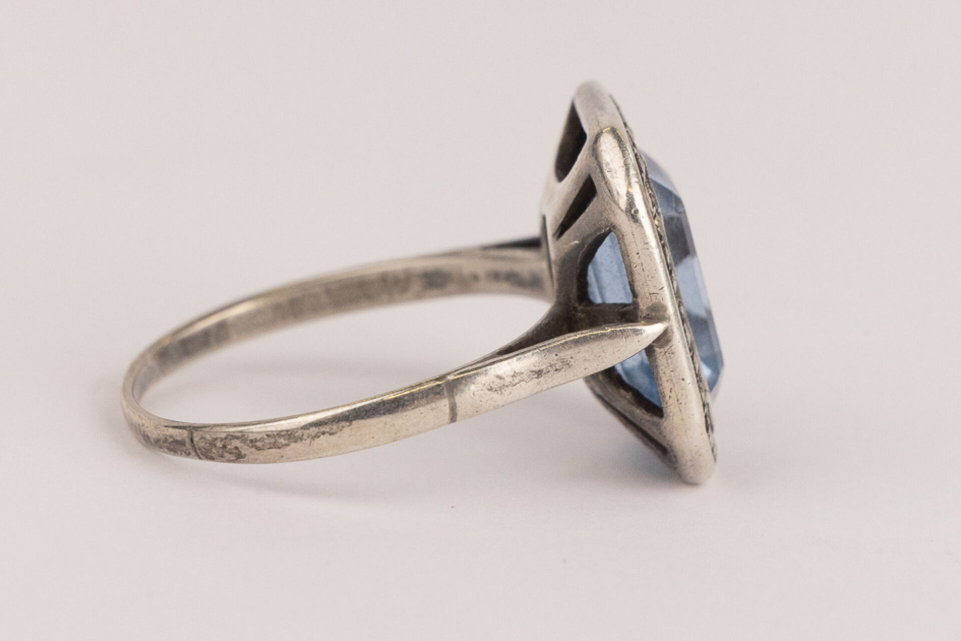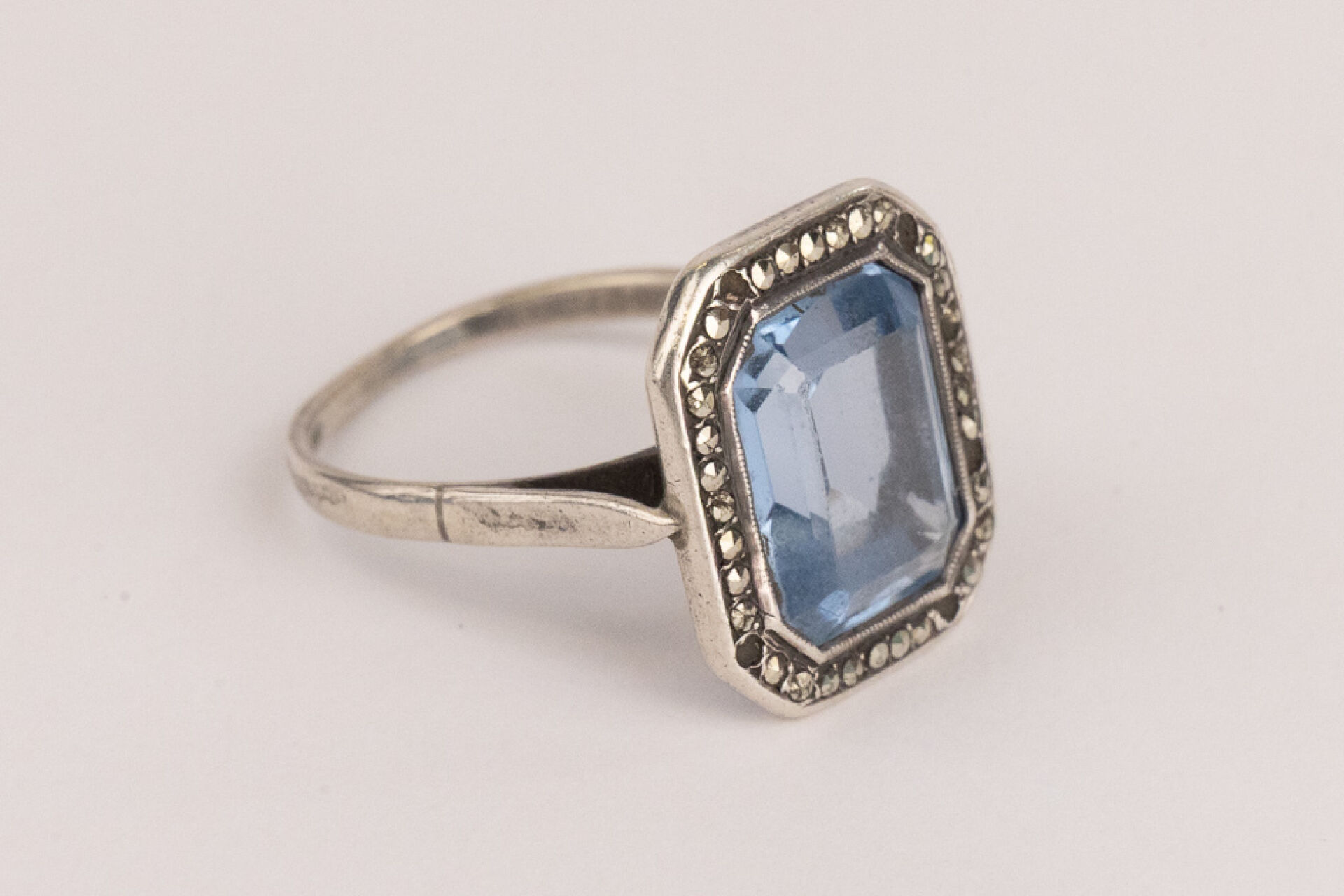 Bague en argent 925 millièmes sertie d'une pierre bleue probablement une aigue marine rectangulaire à pans coupés dans un entourage de brillant serti clos. Style Art déco Poids brut : 5,89 gr - Tour de doigt 61 (manque certains brillants)