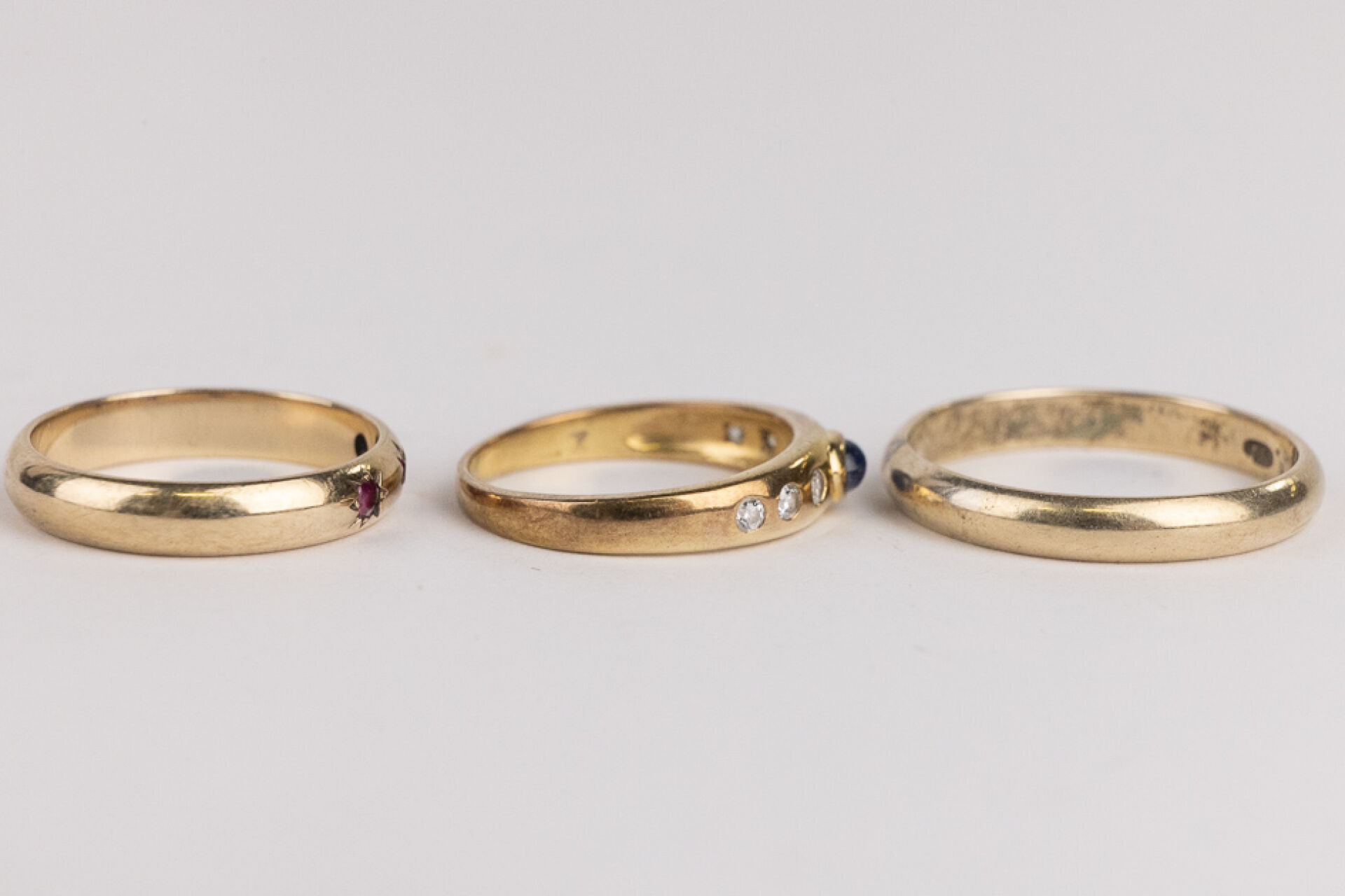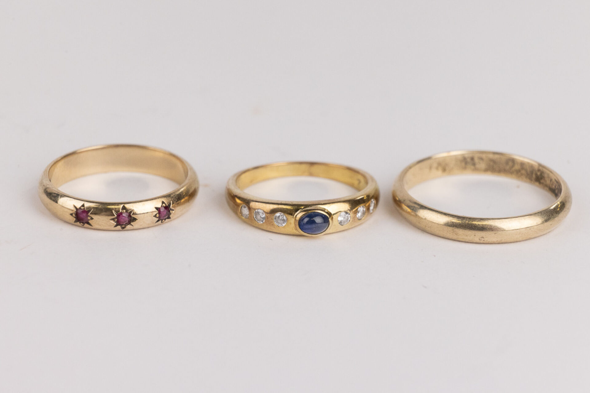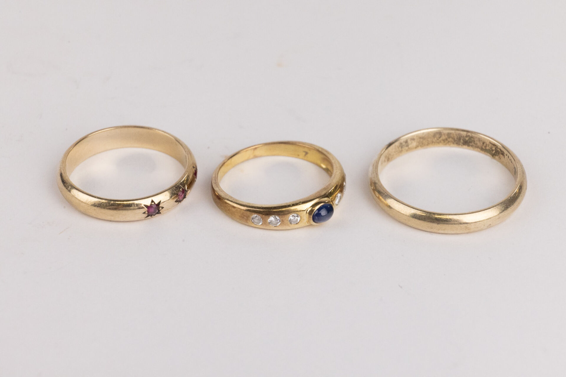 Ensemble de trois bagues et alliances en or jaune 333 millièmes. Poids brut : 9,88 gr - Tours de doigt 56, 59 et 67