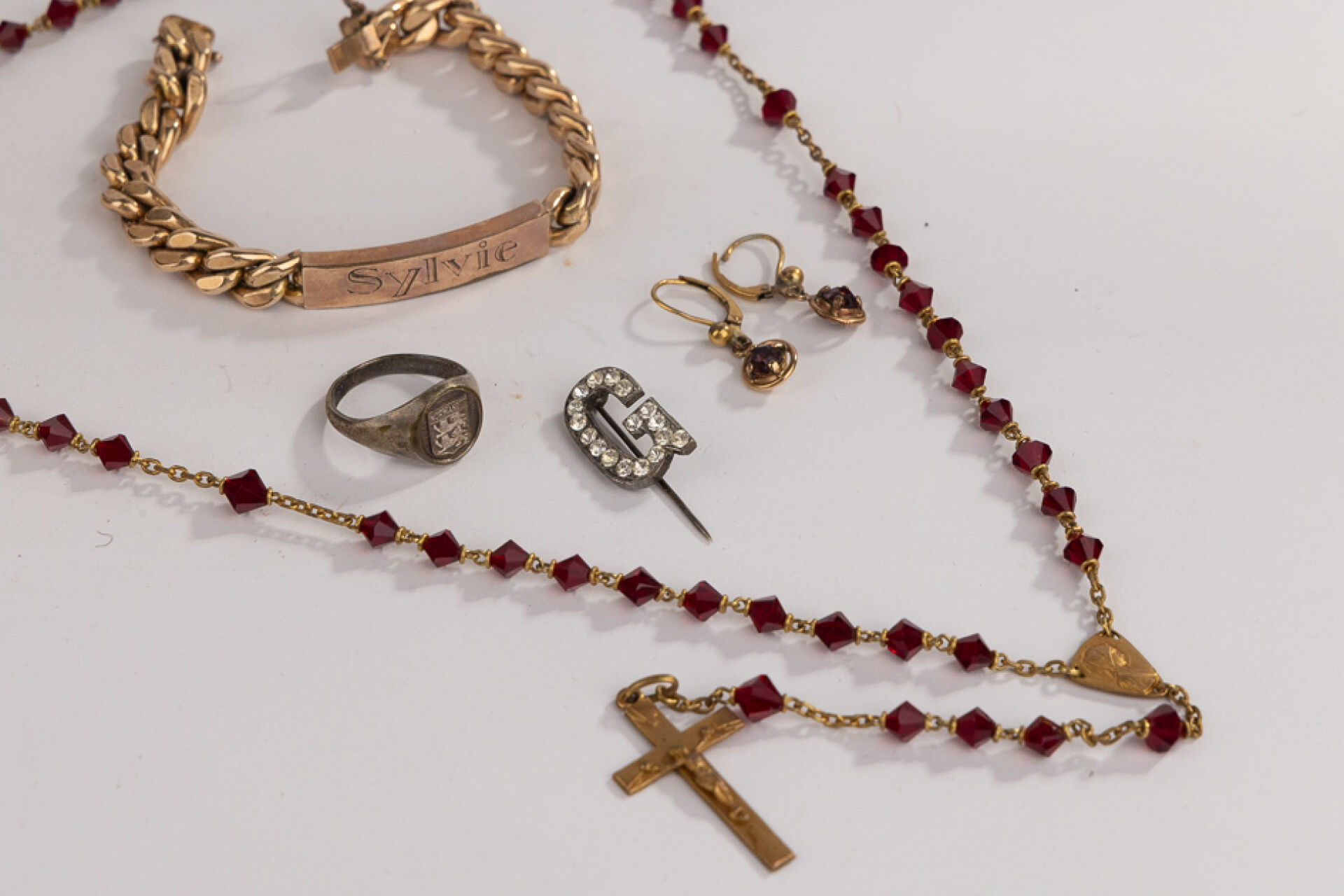Lot comprenant : un chapelet en métal doré et perles facettées rouges, une gourmette gravée "Sylvie" en métal doré, une broche formant un "G" en métal argenté à décor de strass, une paire de pendants d'oreille en métal doré et pierres violettes et une chevalière en métal argenté gravée "Normandie" avec le blason de la région. En l'état