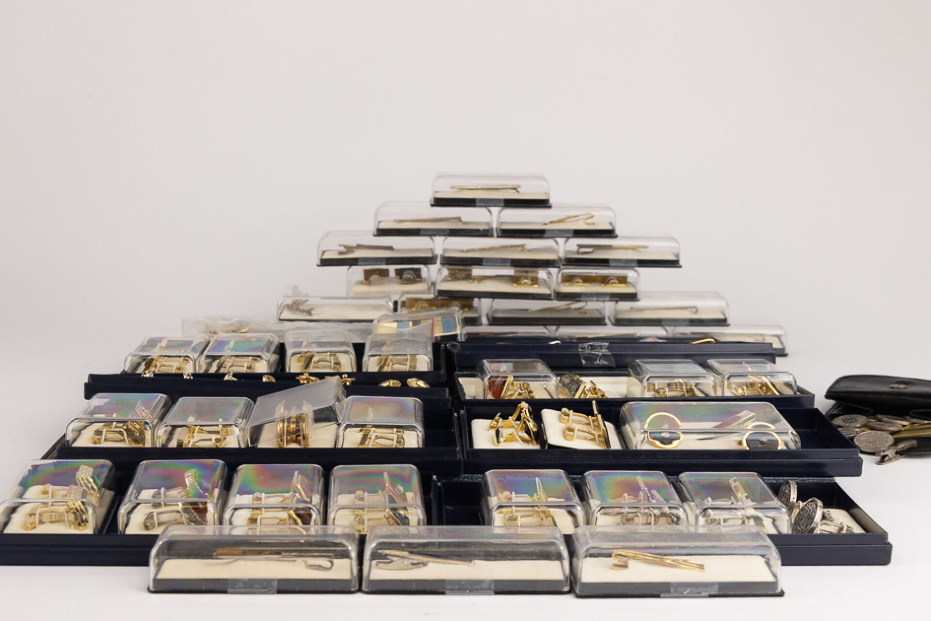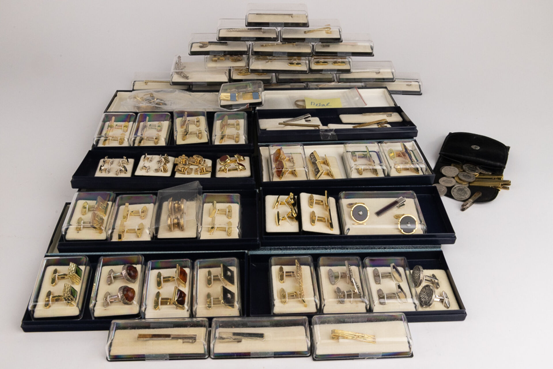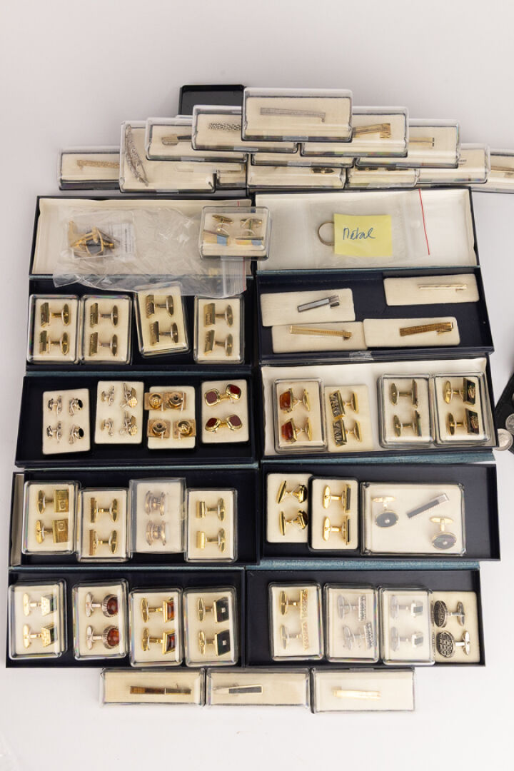 Fort ensemble comprenant des paires de boutons de manchette et des pinces à cravate. Métal doré et argenté. En l'état
