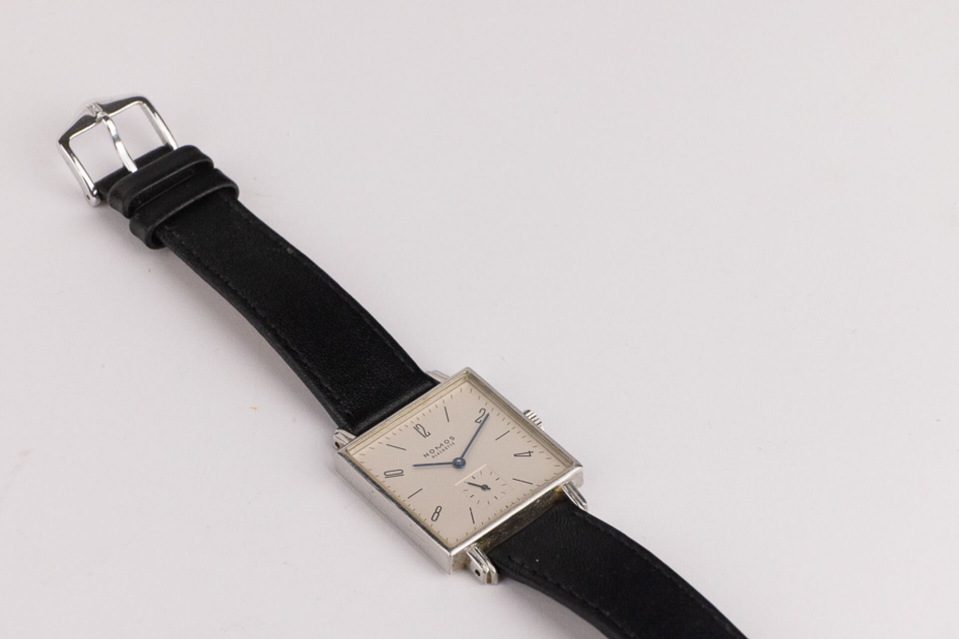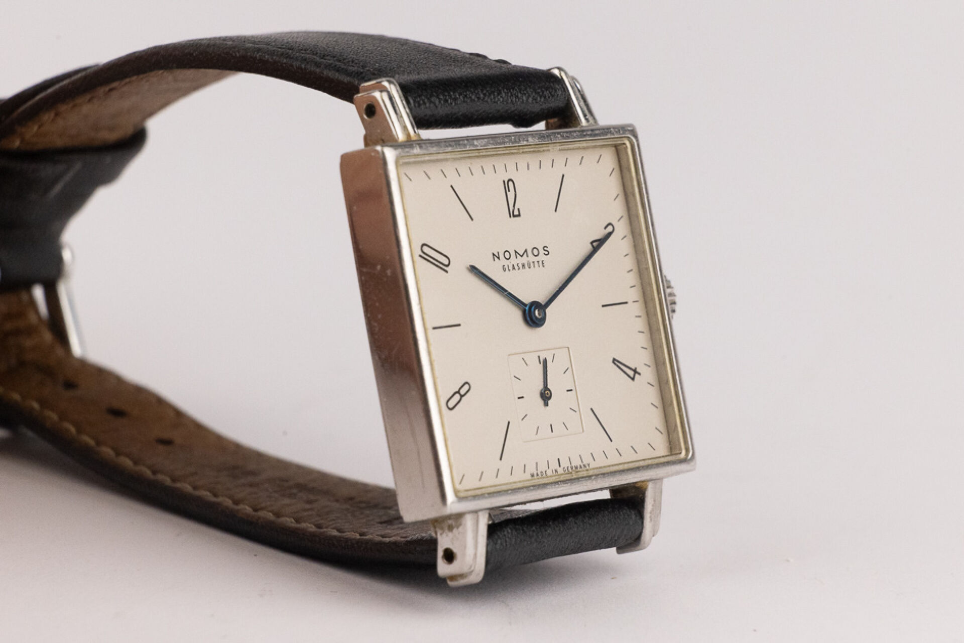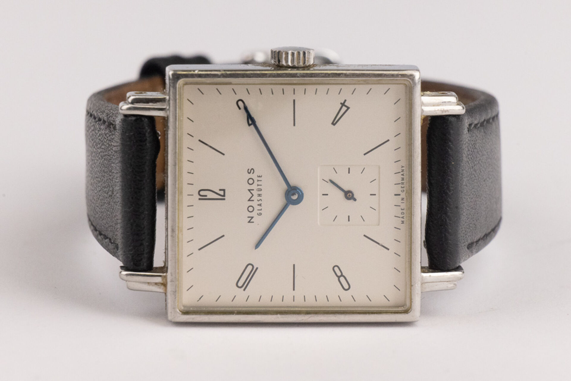 NOMOS Glashütte - NOMOS TETRA 29. Mouvement automatique manuel DUW 4001 à 21600 alt/h doté d'une réserve de marche de 53H. Boîtier acier de 29,5mm, bracelet cuir, verre saphir, étanchéité 3 ATM. Conditions de vente spécifiques : Veuillez noter que toutes les montres sont vendues en l'état. Aucune garantie n'est faite sur l'état de marche, une révision est donc conseillée. Certaines montres ont été ouvertes pour identifier le type et la qualité du mouvement, y compris les montres résistantes à l'eau, il est donc conseillé à l'acheteur de consulter un horloger pour revoir l'étanchéité de la montre.