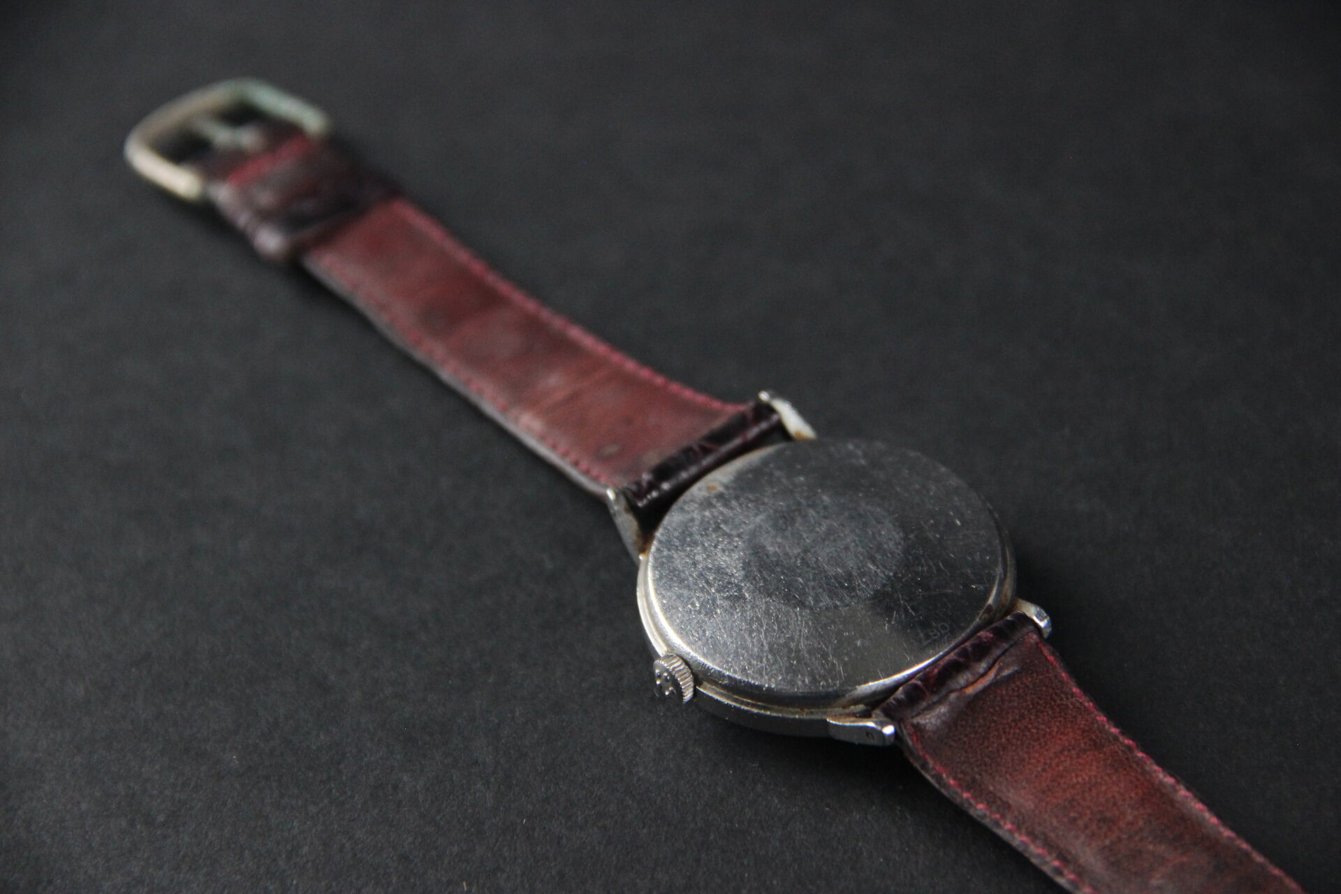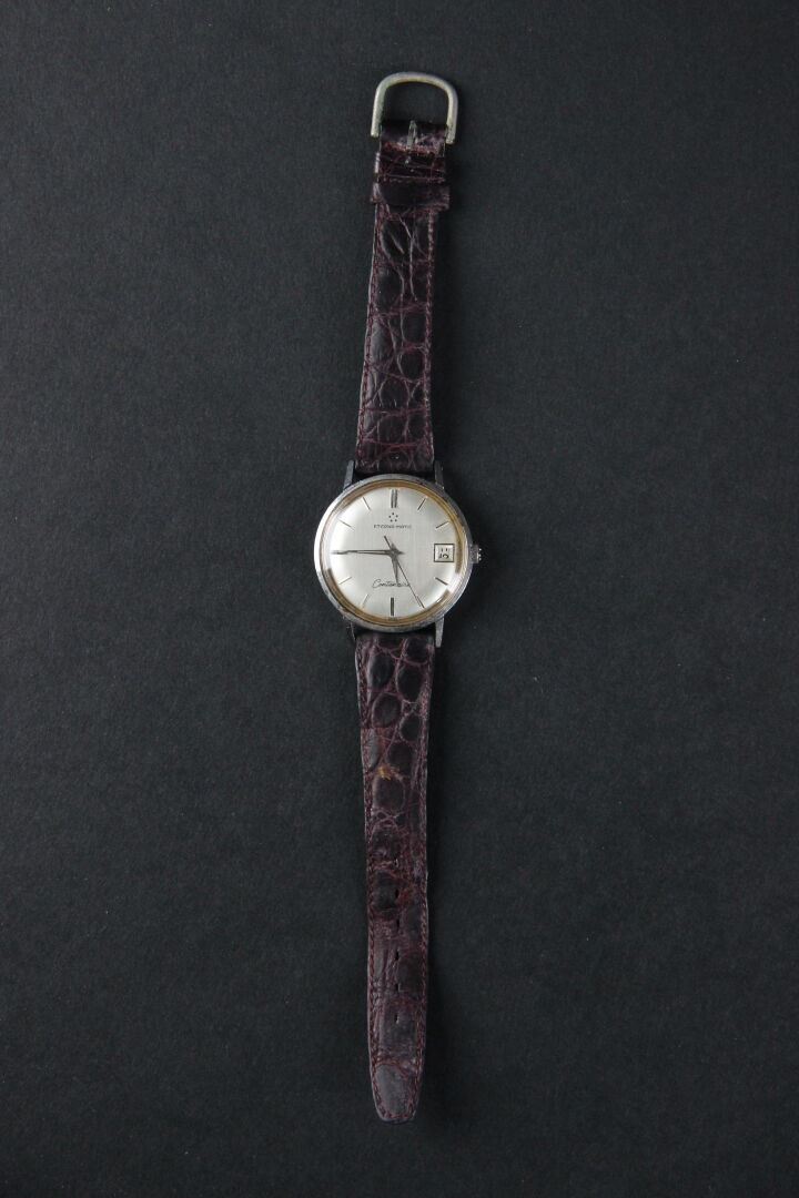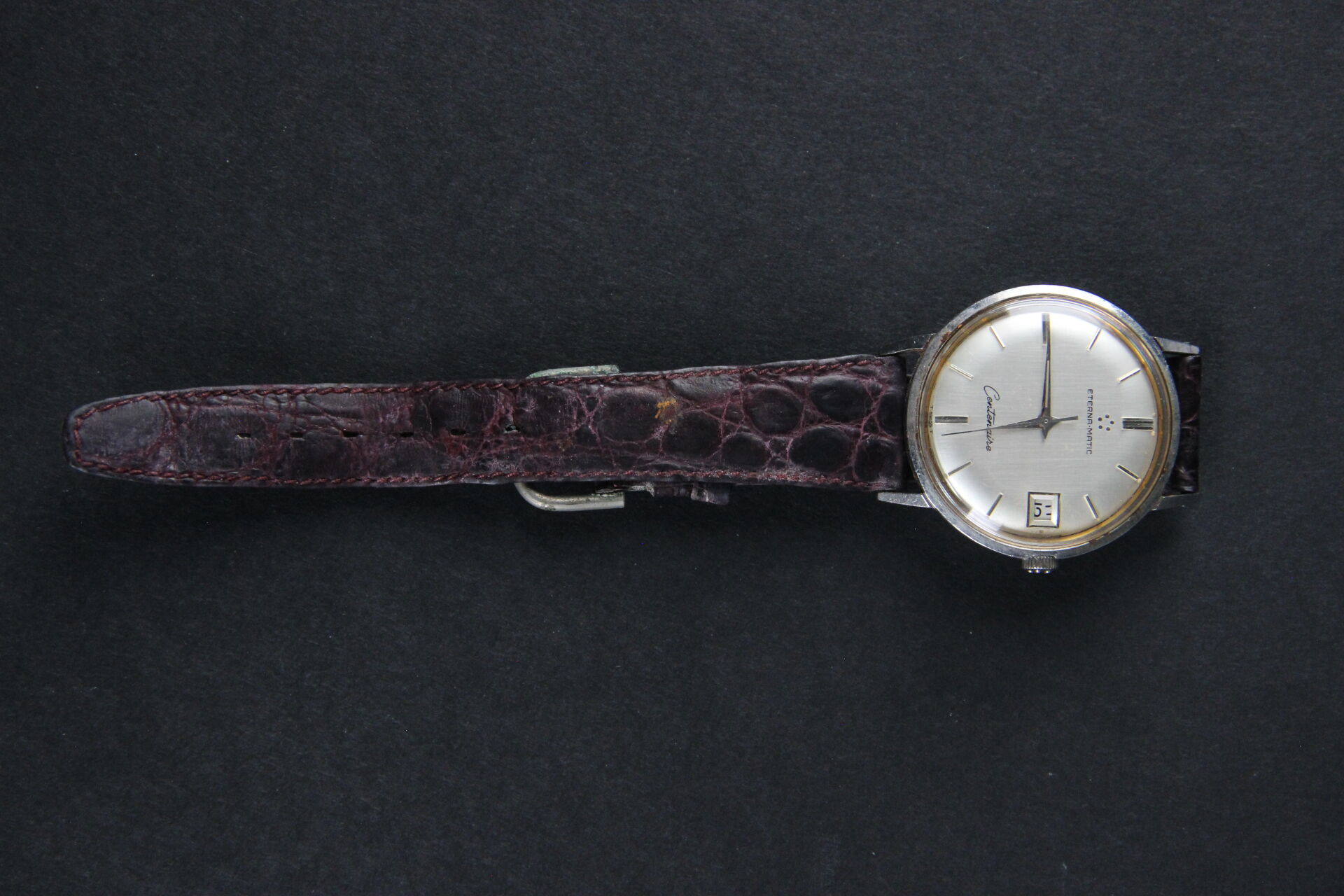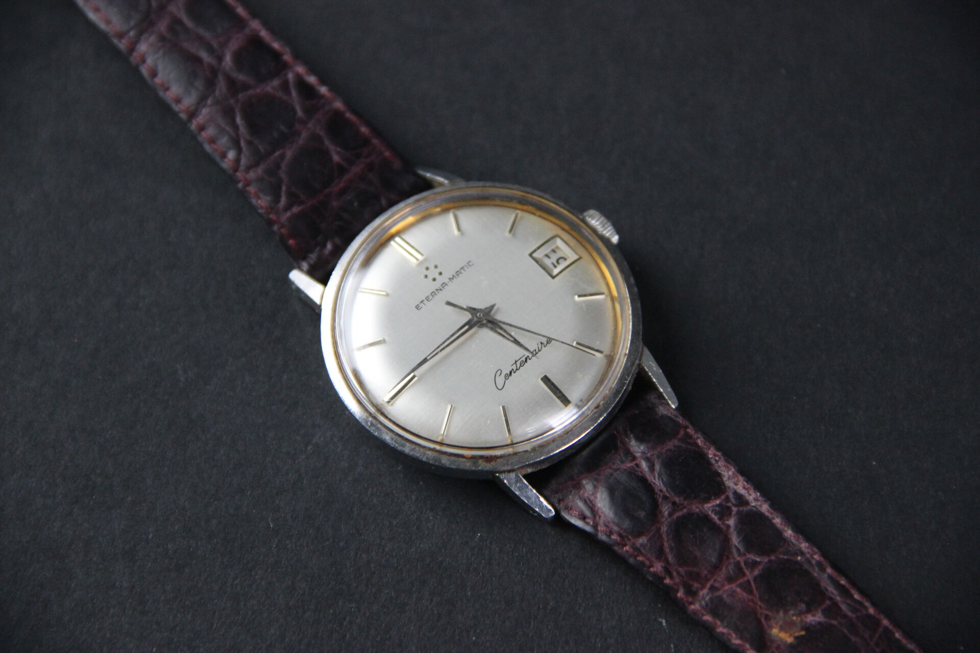 ETERNA-MATIC - Modèle "Centenaire" Montre bracelet à boitier en acier. Cadran circulaire, index bâton, date par guichet et grande trotteuse seconde. Bracelet en cuir marron/bordeaux, boucle en métal. Diam. : 3,4 cm (rayures et usures au bracelet) Conditions de vente spécifiques : Veuillez noter que toutes les montres sont vendues en l'état. Aucune garantie n'est faite sur l'état de marche, une révision est donc conseillée. Certaines montres ont été ouvertes pour identifier le type et la qualité du mouvement, y compris les montres résistantes à l'eau, il est donc conseillé à l'acheteur de consulter un horloger pour revoir l'étanchéité de la montre.