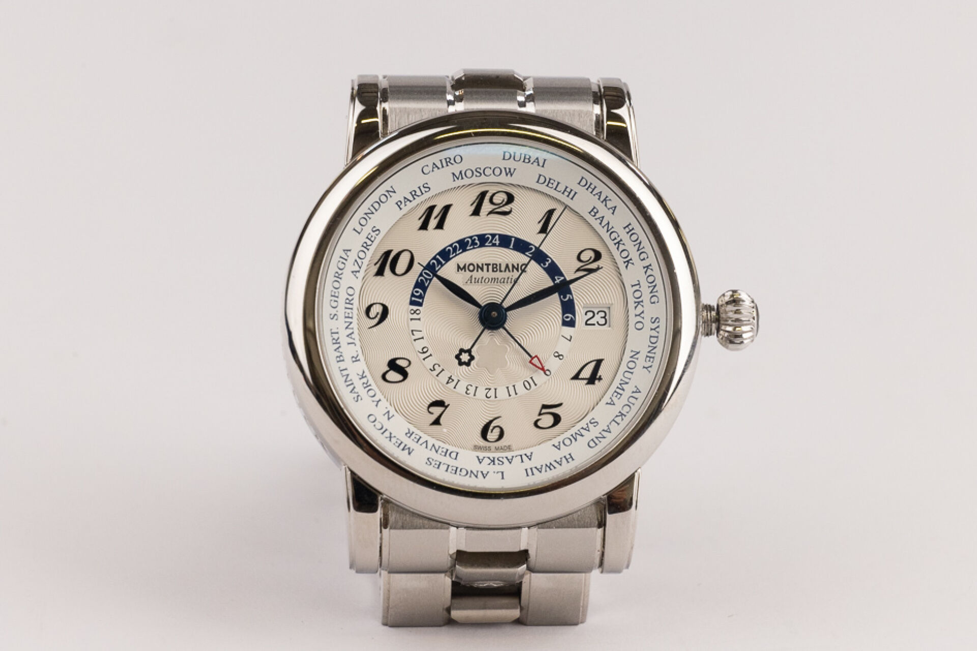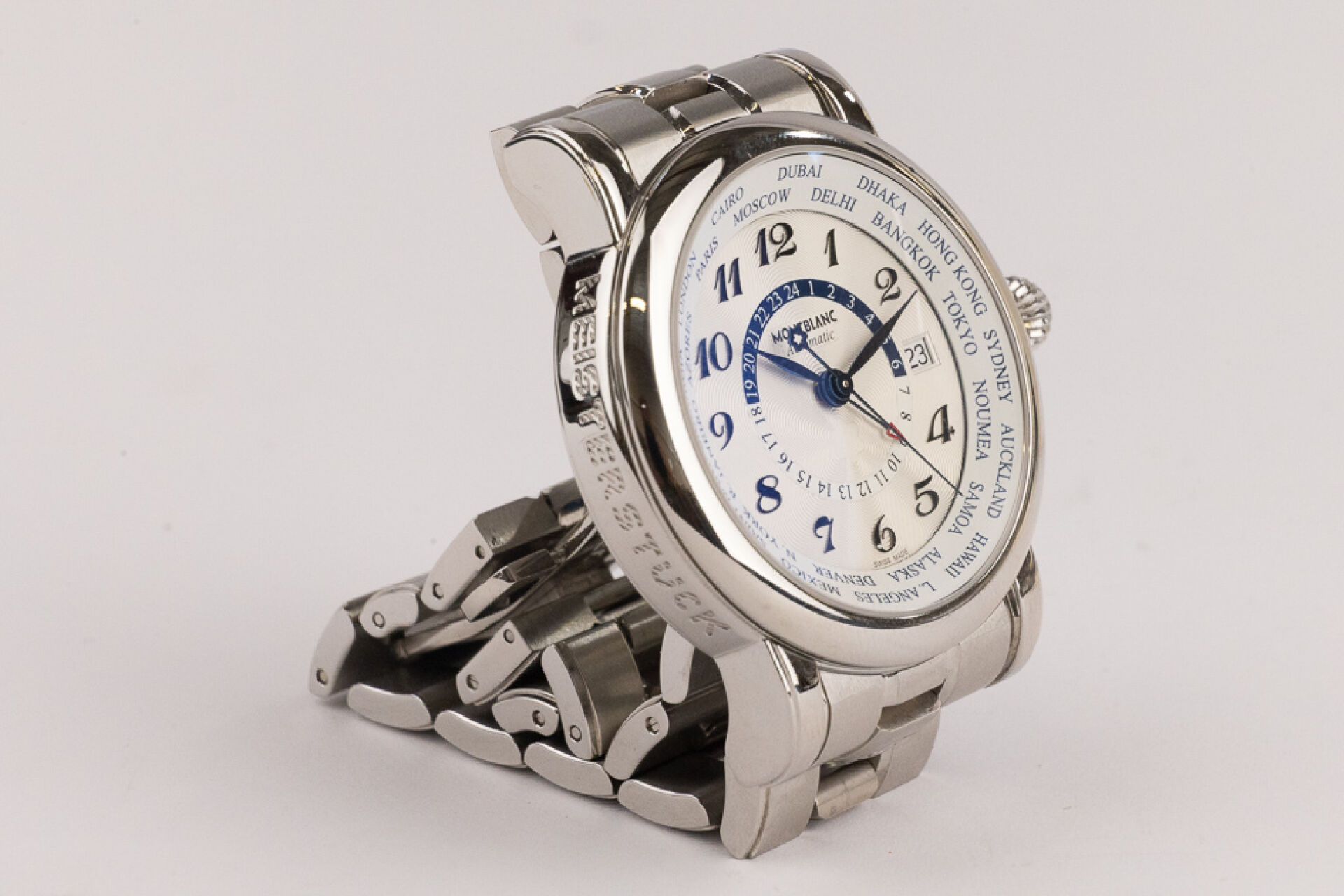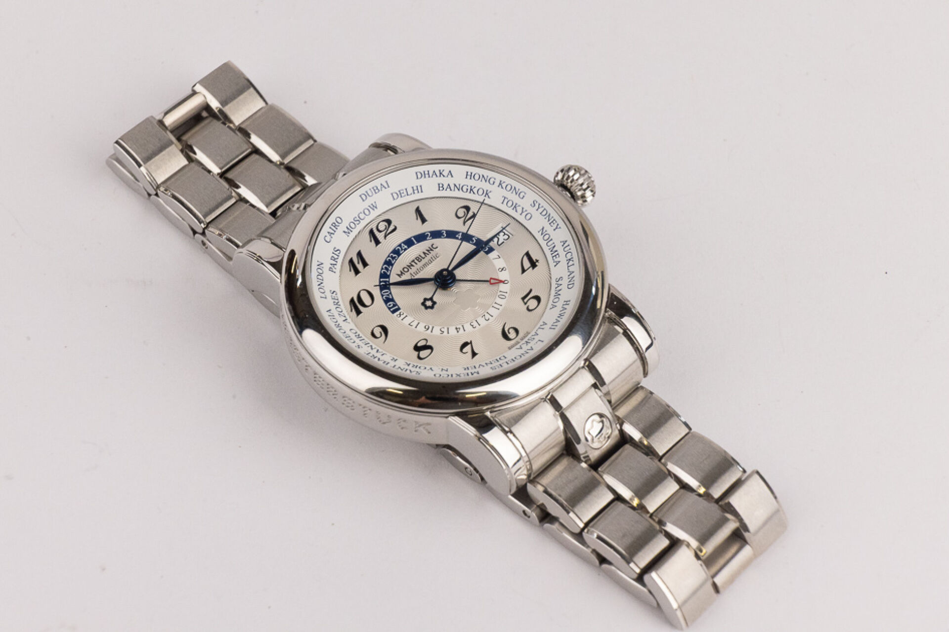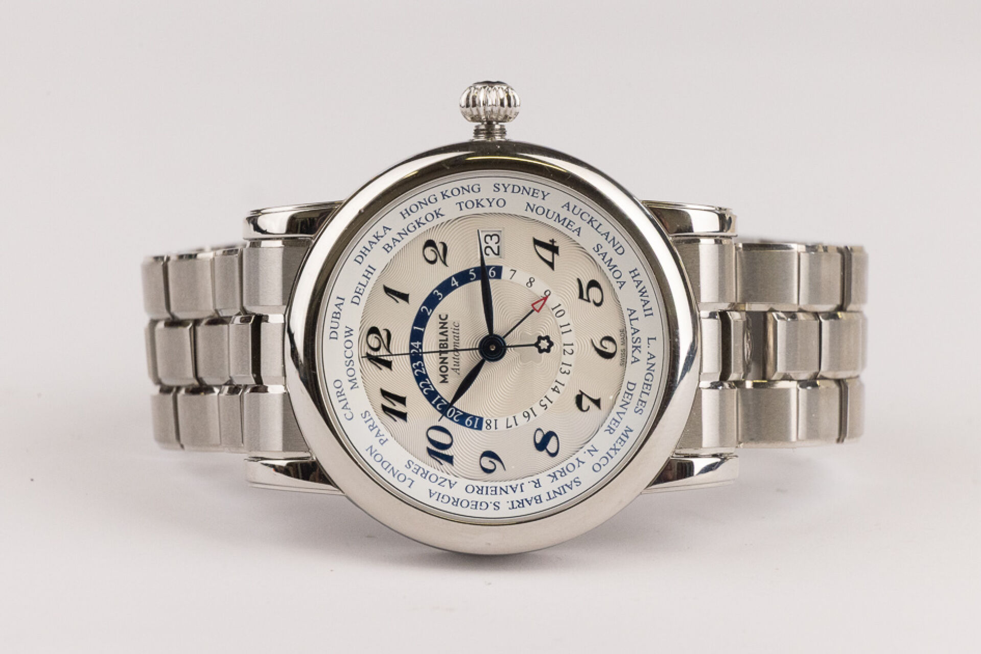 MONTBLANC - Montre Montblanc Star World-Time GMT. Mouvement GMT calibre MB 4810/405 (base ETA/Valjoux 7753) à 28800 alt/h doté d'une réserve de marche de 42H. Boîtier acier de 42mm, bracelet acier, verre saphir, étanchéité 3 ATM. Montre mesurée avec une dérive moyenne de -1s/jour. Conditions de vente spécifiques : Veuillez noter que toutes les montres sont vendues en l'état. Aucune garantie n'est faite sur l'état de marche, une révision est donc conseillée. Certaines montres ont été ouvertes pour identifier le type et la qualité du mouvement, y compris les montres résistantes à l'eau, il est donc conseillé à l'acheteur de consulter un horloger pour revoir l'étanchéité de la montre. Montre vendue avec sa boîte et ses papiers. A noter une rayure sur le verre. Montre vendue avec sa boîte et ses papiers.