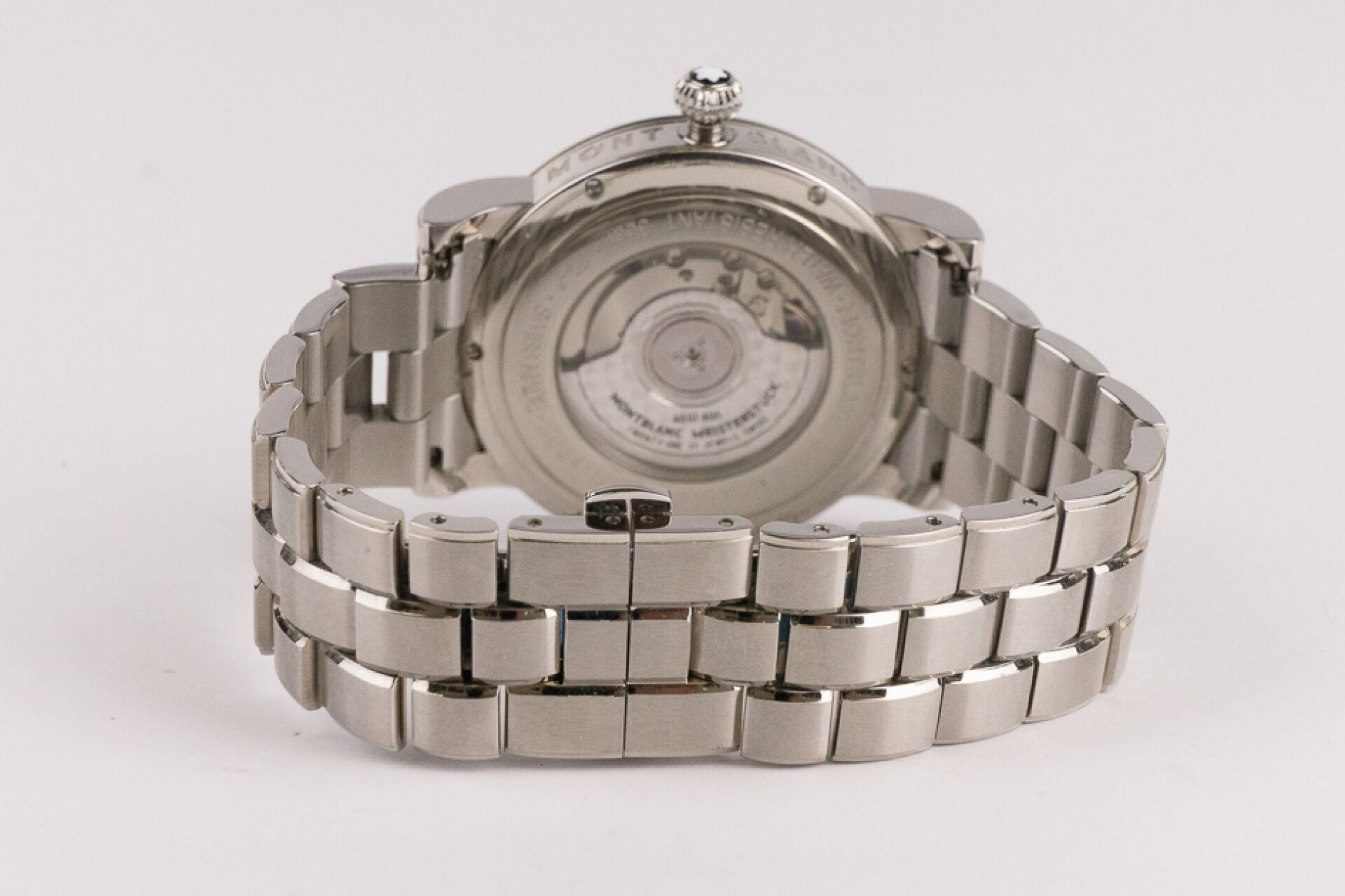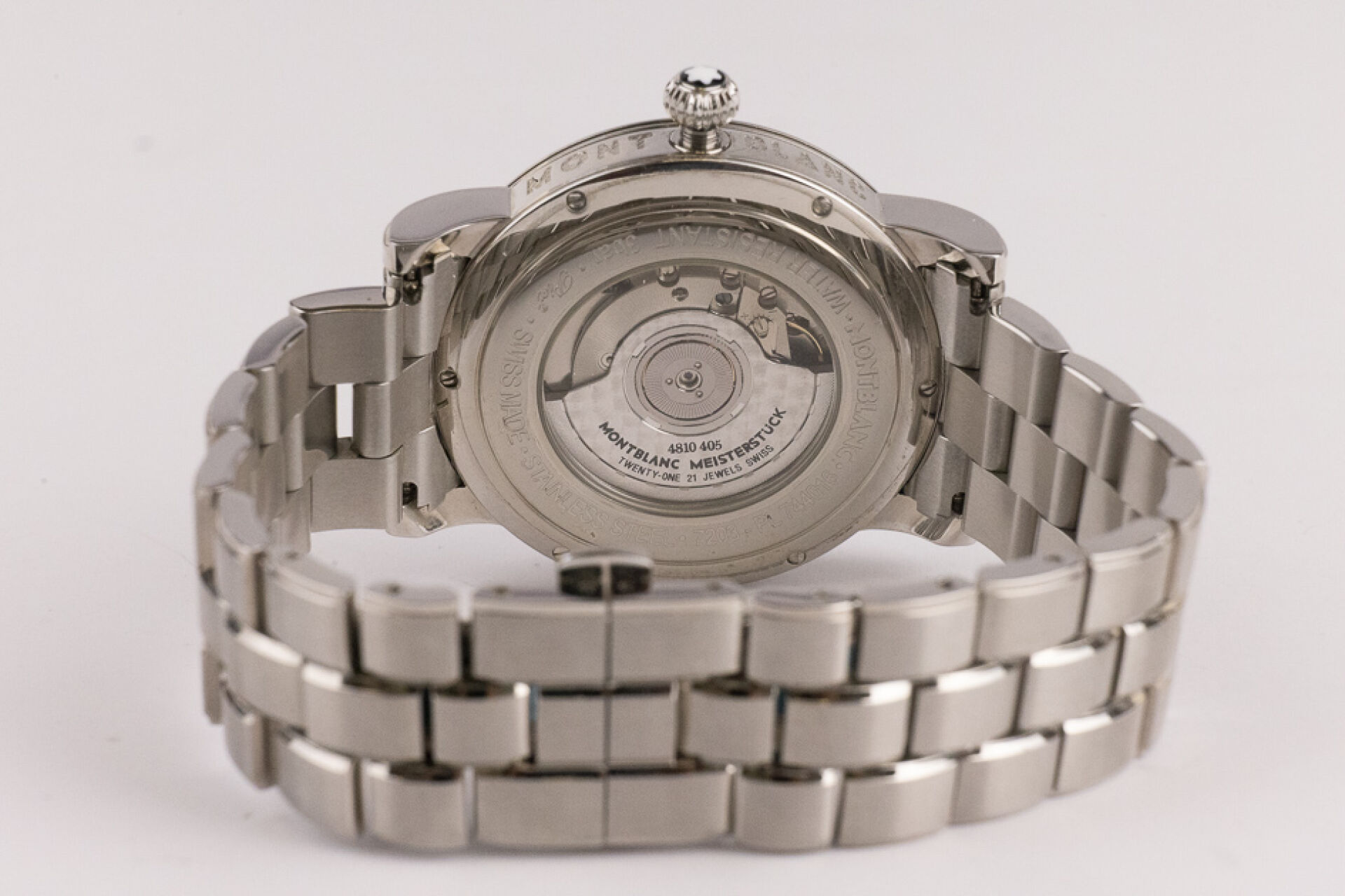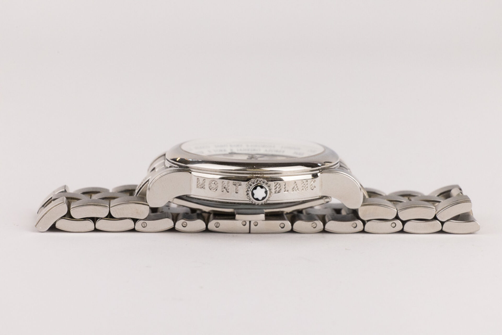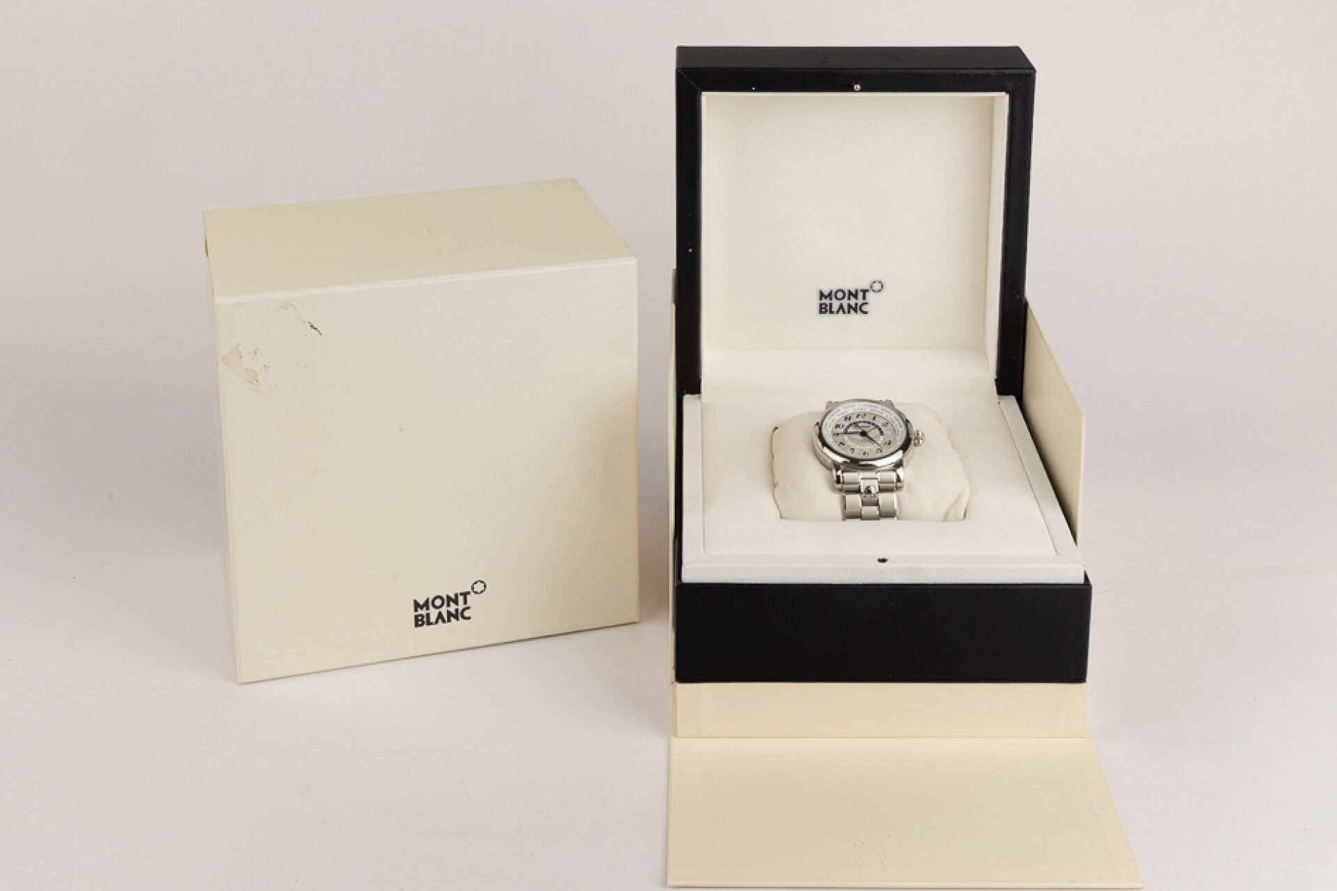 MONTBLANC - Montre Montblanc Star World-Time GMT. Mouvement GMT calibre MB 4810/405 (base ETA/Valjoux 7753) à 28800 alt/h doté d'une réserve de marche de 42H. Boîtier acier de 42mm, bracelet acier, verre saphir, étanchéité 3 ATM. Montre mesurée avec une dérive moyenne de -1s/jour. Conditions de vente spécifiques : Veuillez noter que toutes les montres sont vendues en l'état. Aucune garantie n'est faite sur l'état de marche, une révision est donc conseillée. Certaines montres ont été ouvertes pour identifier le type et la qualité du mouvement, y compris les montres résistantes à l'eau, il est donc conseillé à l'acheteur de consulter un horloger pour revoir l'étanchéité de la montre. Montre vendue avec sa boîte et ses papiers. A noter une rayure sur le verre. Montre vendue avec sa boîte et ses papiers.