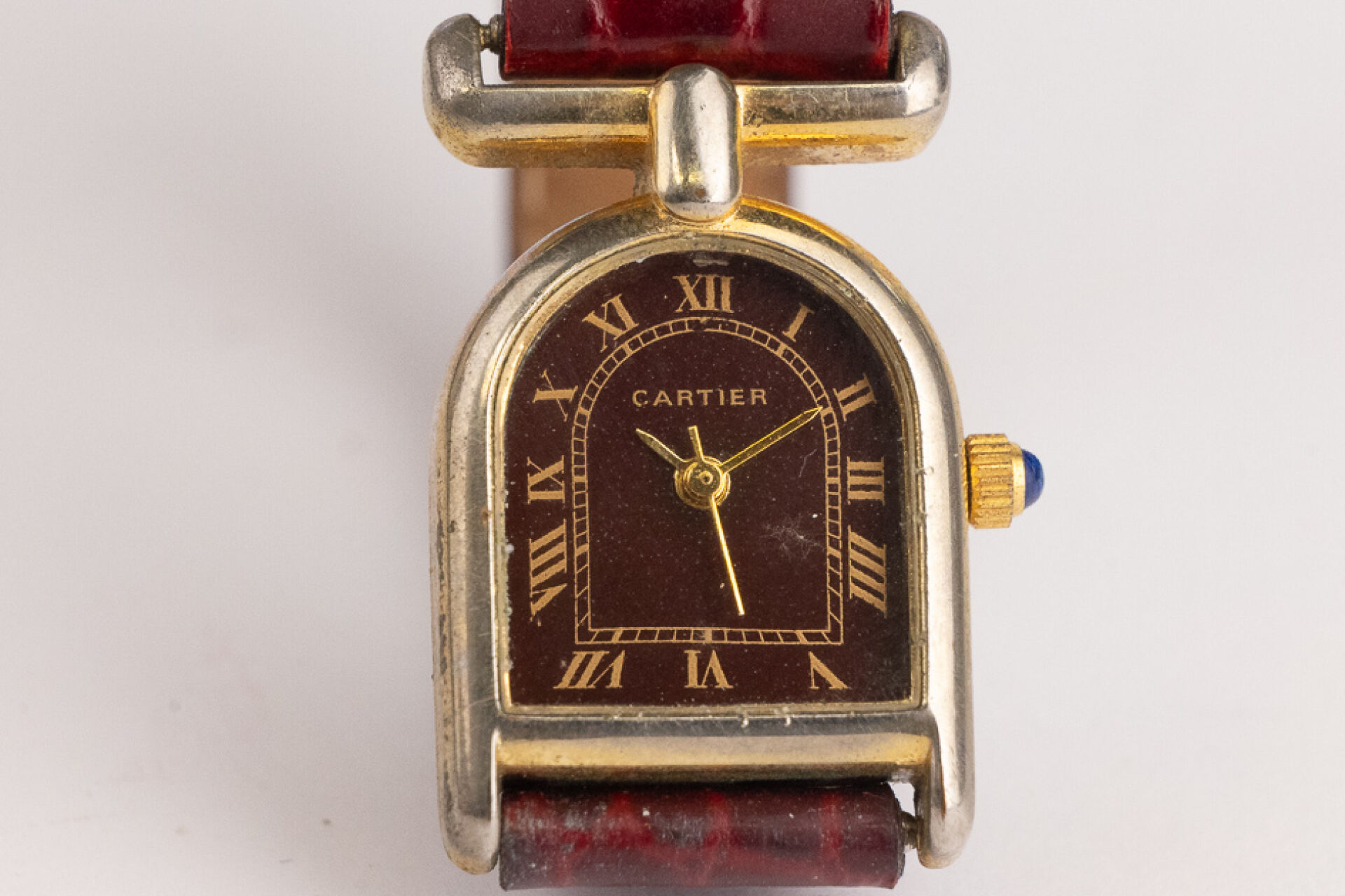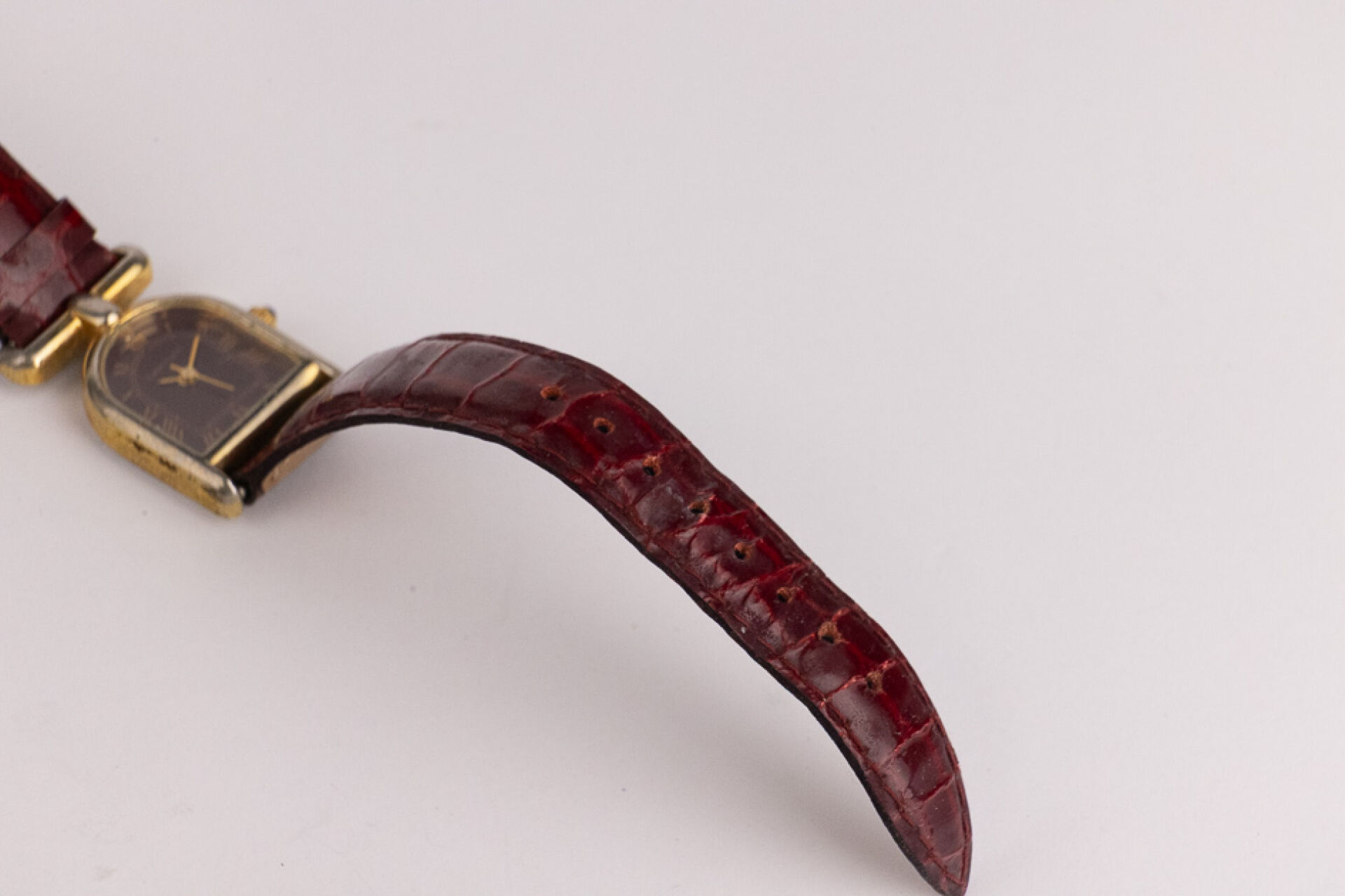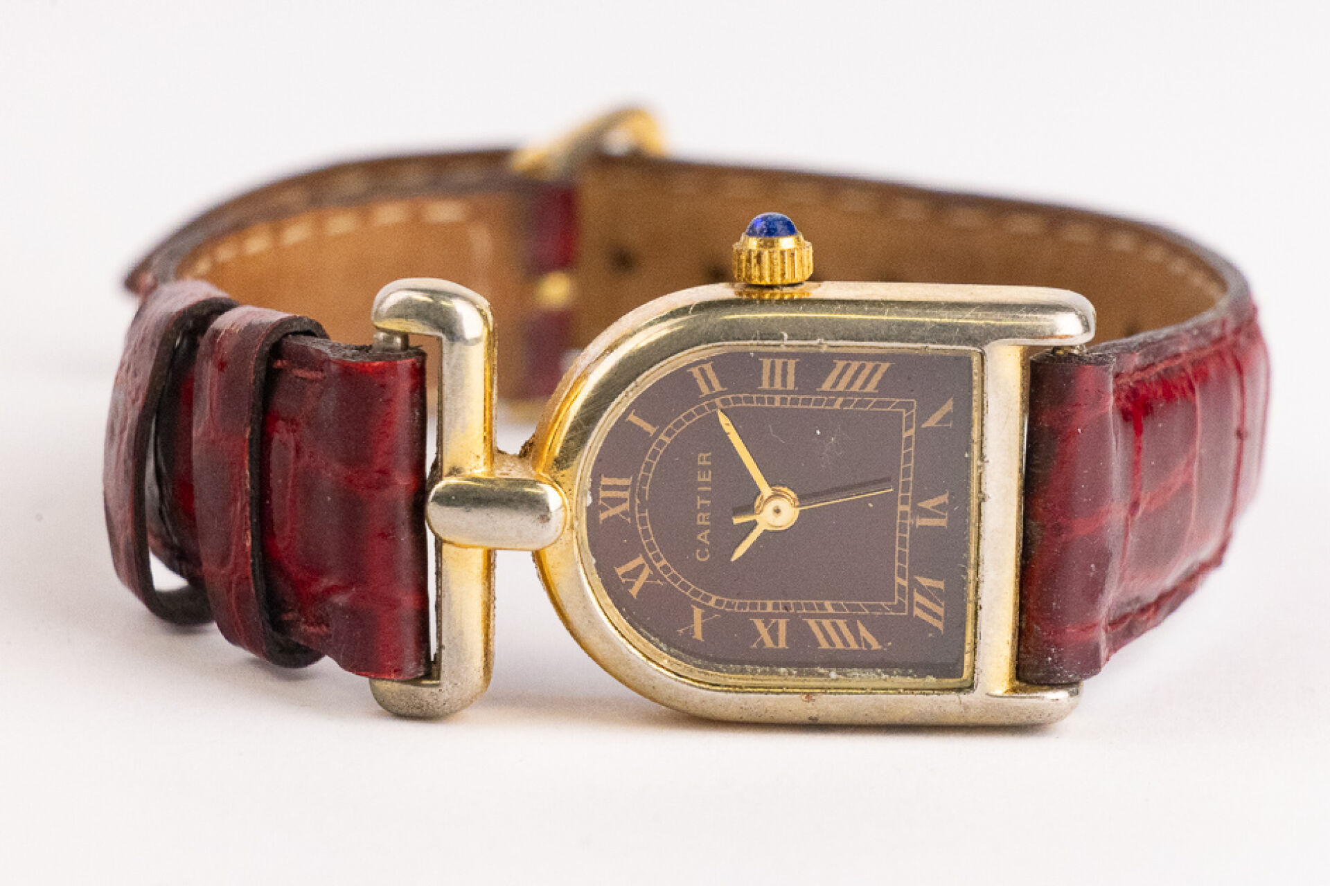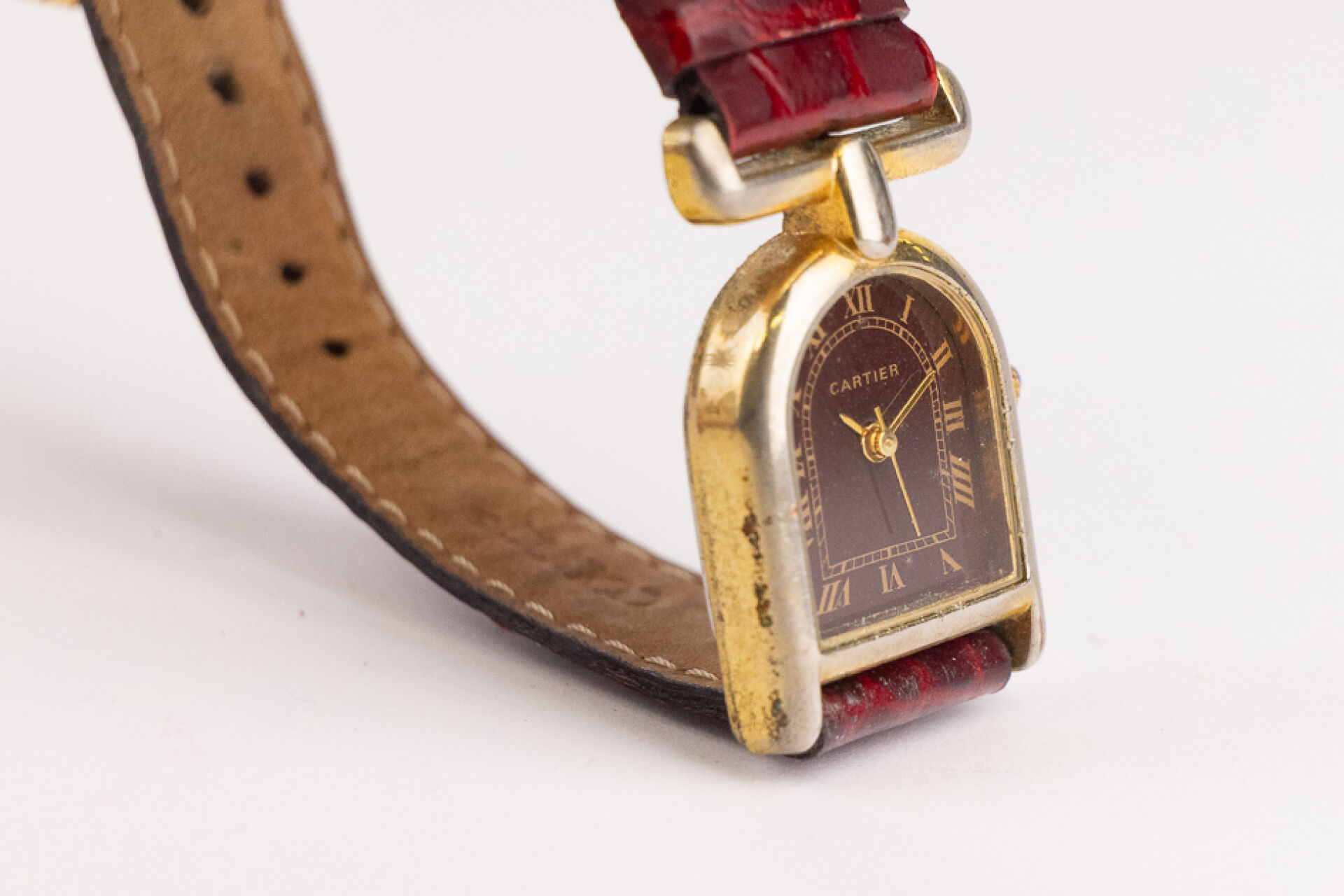CARTIER - Montre de femme, modèle "Calandre" cadran forme d'étrier en métal doré, fond du cadran bordeaux, chiffres romains, bracelet en cuir imitation crocodile bordeaux (non d'origine), boucle ardillon métal doré. Dans un écrin rouge (usures, manques à la dorure) Conditions de vente spécifiques : Veuillez noter que toutes les montres sont vendues en l'état. Aucune garantie n'est faite sur l'état de marche, une révision est donc conseillée. Certaines montres ont été ouvertes pour identifier le type et la qualité du mouvement, y compris les montres résistantes à l'eau, il est donc conseillé à l'acheteur de consulter un horloger pour revoir l'étanchéité de la montre.