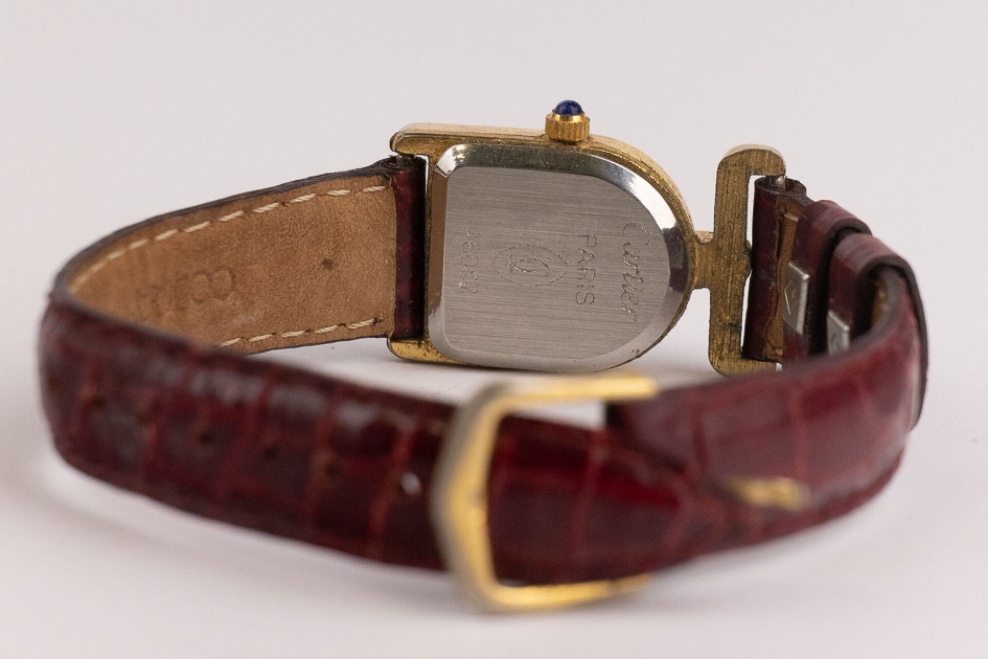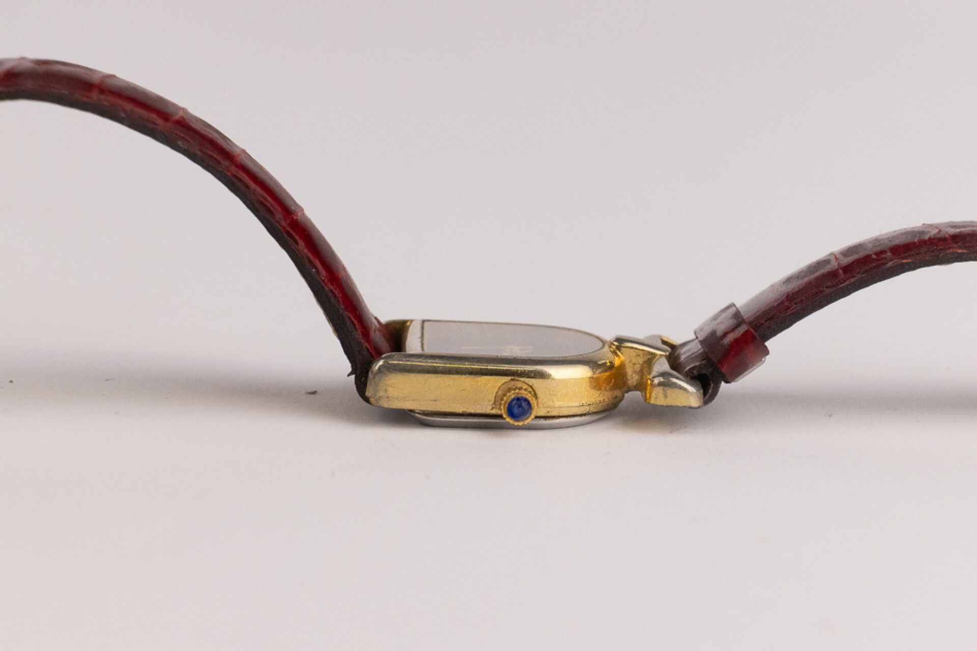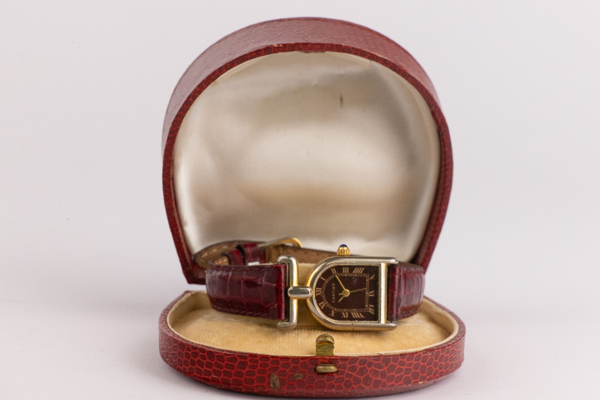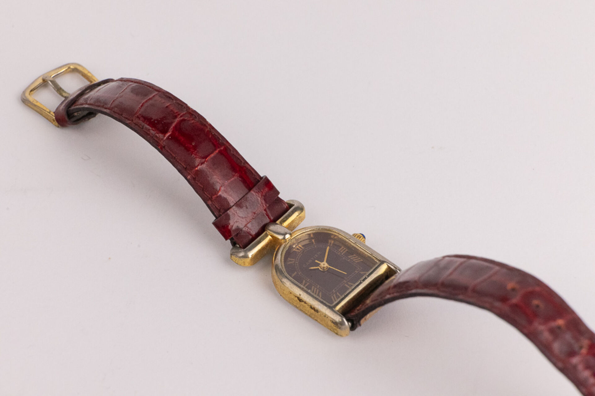 CARTIER - Montre de femme, modèle "Calandre" cadran forme d'étrier en métal doré, fond du cadran bordeaux, chiffres romains, bracelet en cuir imitation crocodile bordeaux (non d'origine), boucle ardillon métal doré. Dans un écrin rouge (usures, manques à la dorure) Conditions de vente spécifiques : Veuillez noter que toutes les montres sont vendues en l'état. Aucune garantie n'est faite sur l'état de marche, une révision est donc conseillée. Certaines montres ont été ouvertes pour identifier le type et la qualité du mouvement, y compris les montres résistantes à l'eau, il est donc conseillé à l'acheteur de consulter un horloger pour revoir l'étanchéité de la montre.