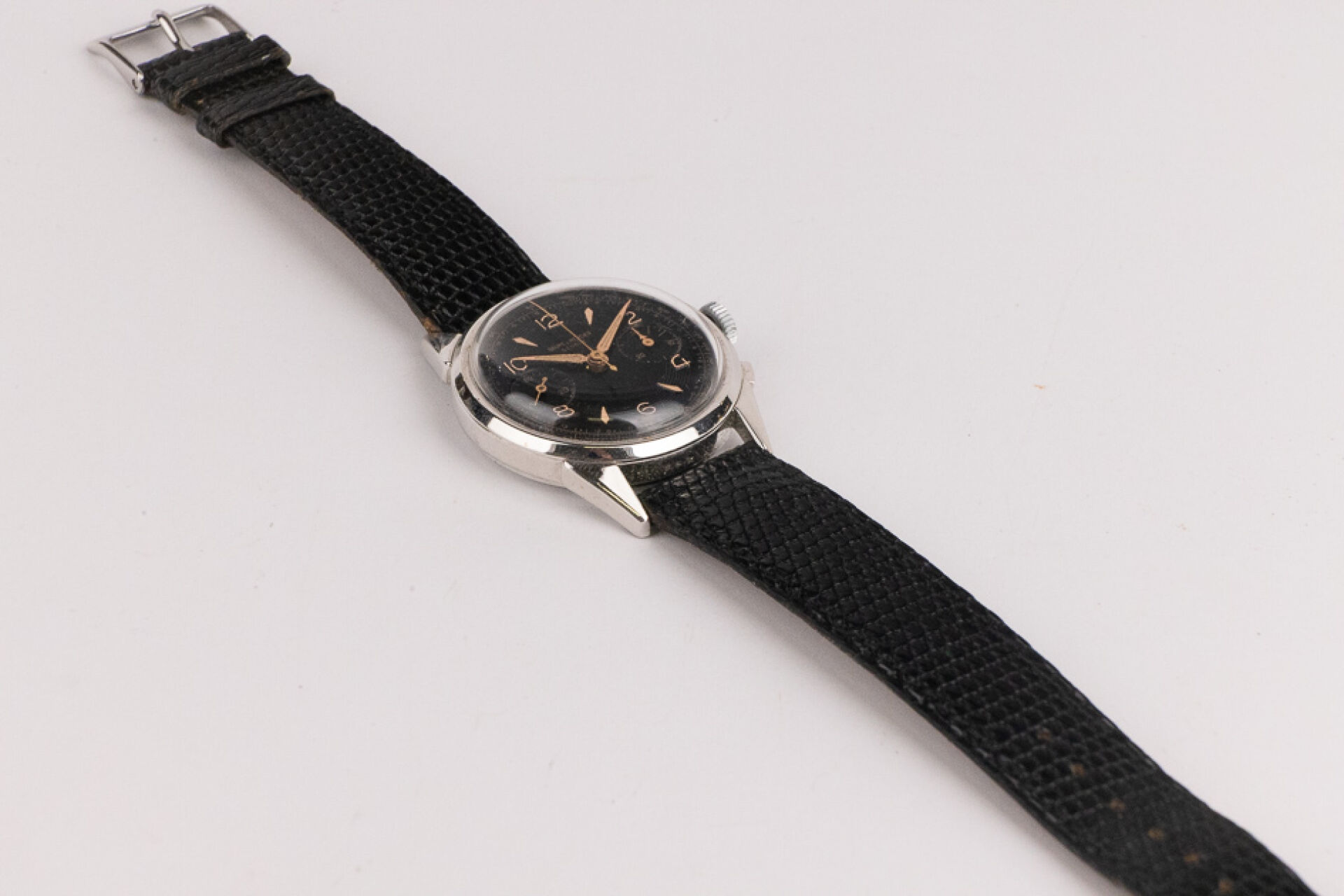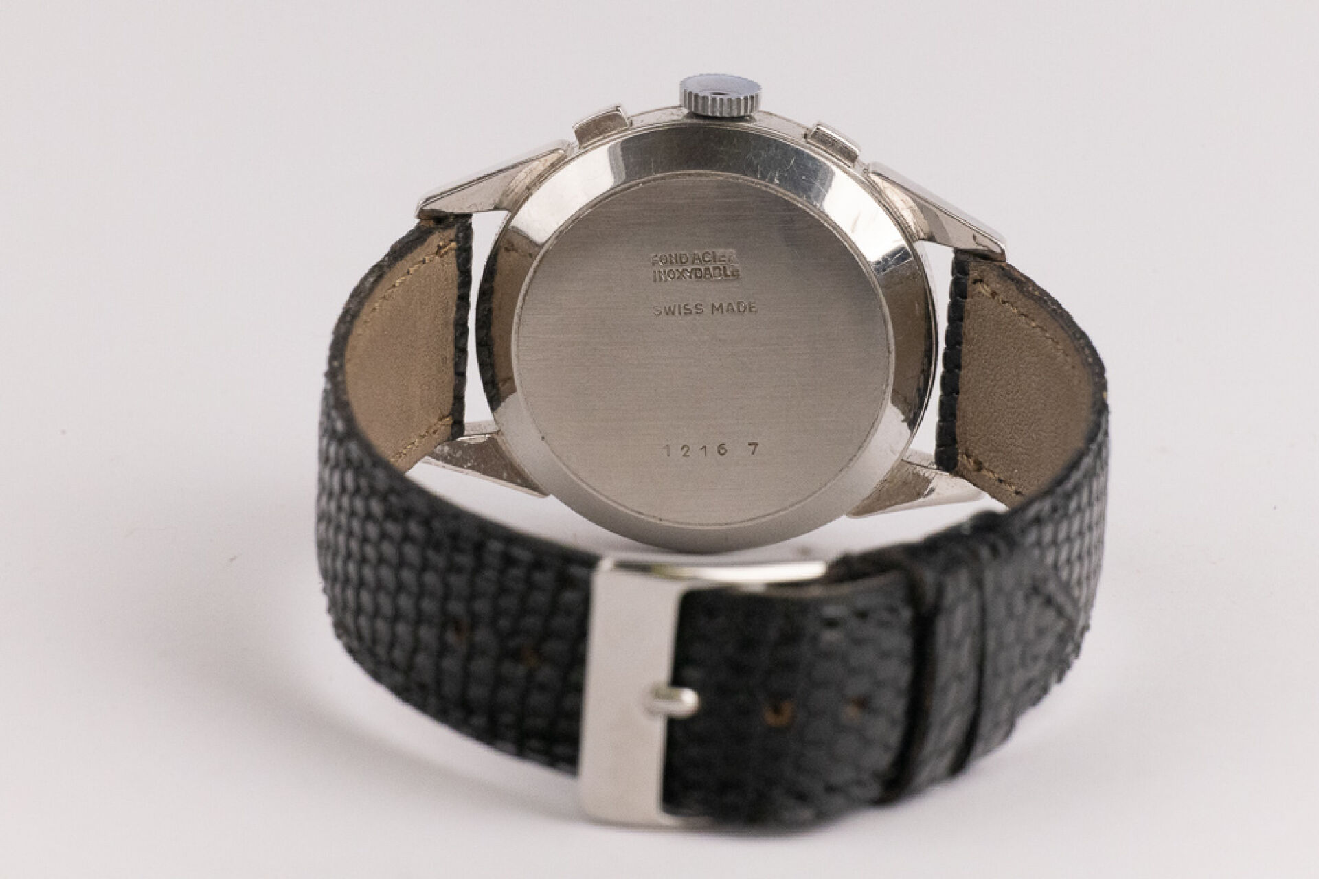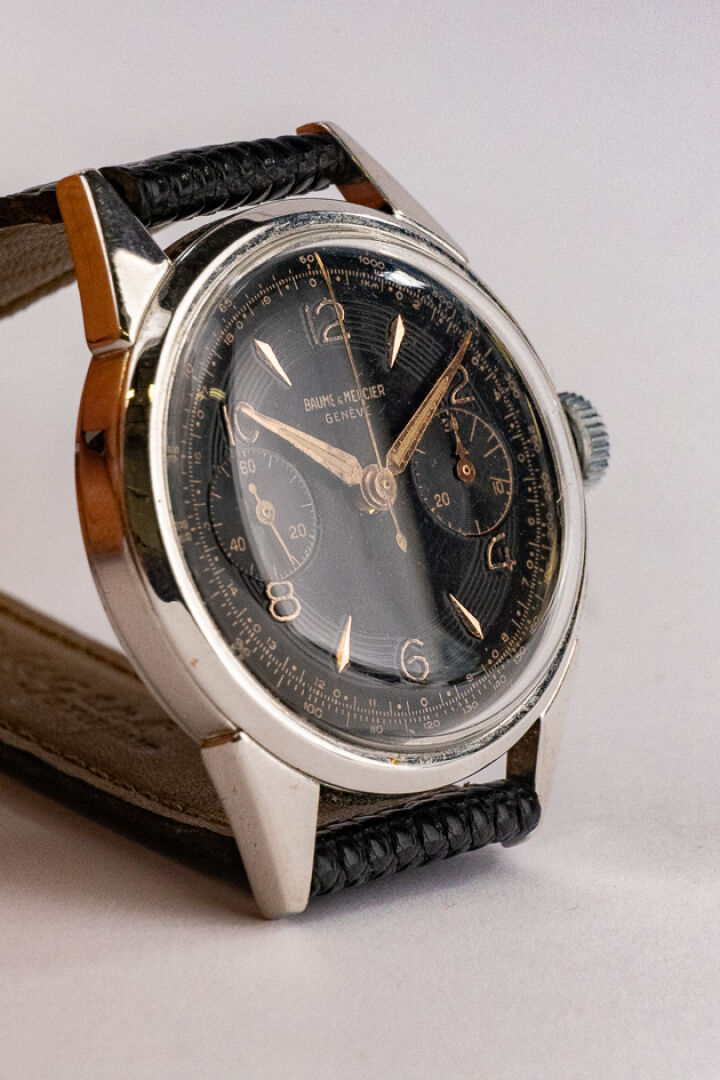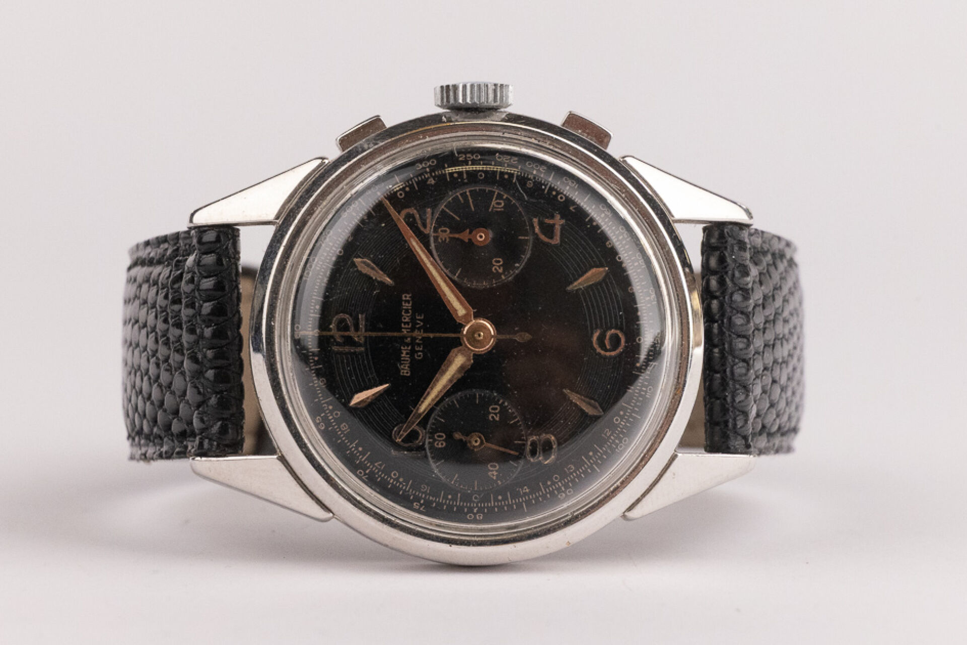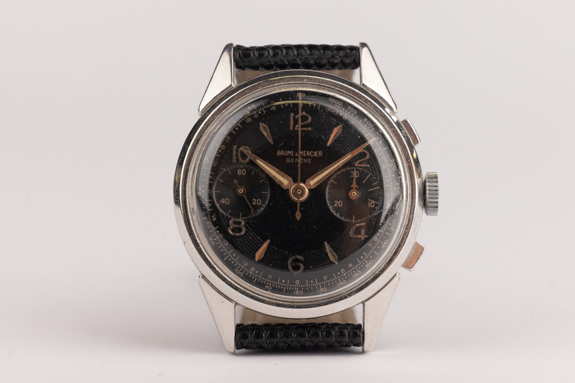 BAUME & MERCIER - Montre BAUME & MERCIER Chronographe. Mouvement chronographe Landeron 48 à 18000 alt/h doté d'une réserve de marche de 36H. Boîtier acier de 36mm par 12,5mm d'épaisseur, verre plexi, bracelet cuir noir. Conditions de vente spécifiques : Veuillez noter que toutes les montres sont vendues en l'état. Aucune garantie n'est faite sur l'état de marche, une révision est donc conseillée. Certaines montres ont été ouvertes pour identifier le type et la qualité du mouvement, y compris les montres résistantes à l'eau, il est donc conseillé à l'acheteur de consulter un horloger pour revoir l'étanchéité de la montre. Montre vendue avec sa boîte et ses papiers. A noter une rayure sur le verre.
