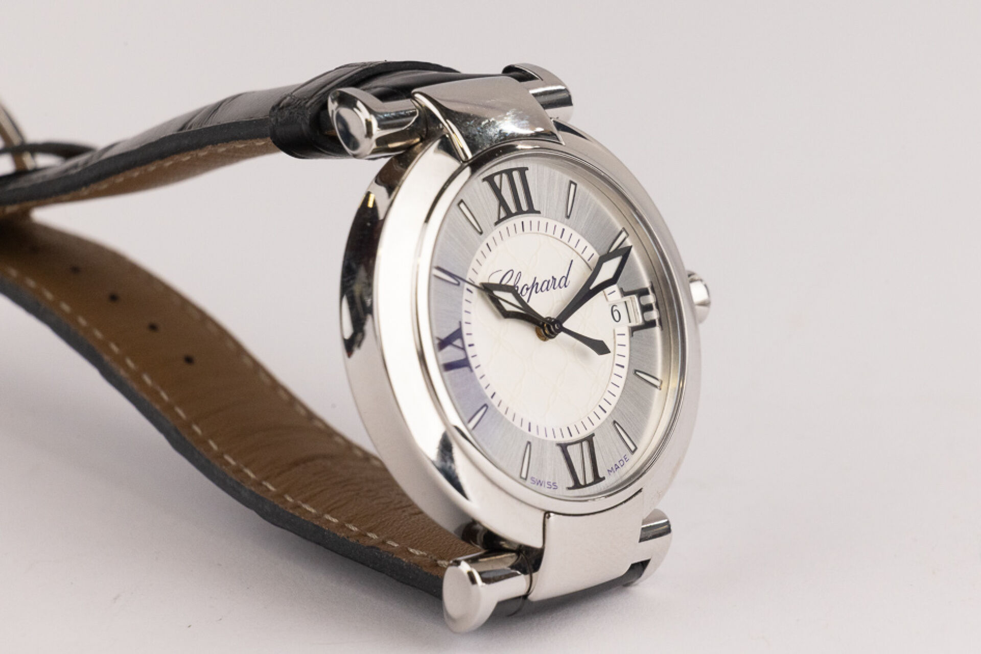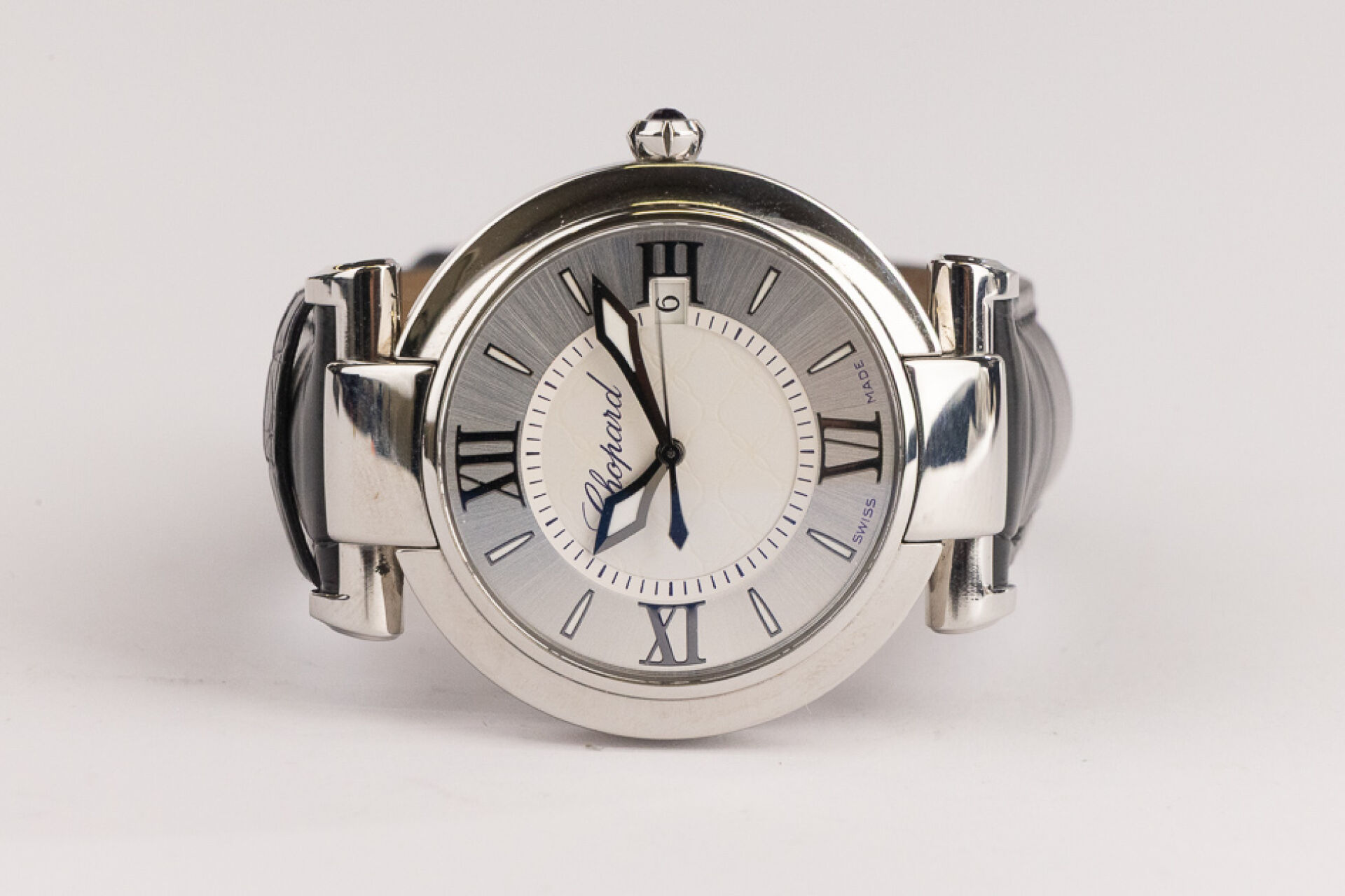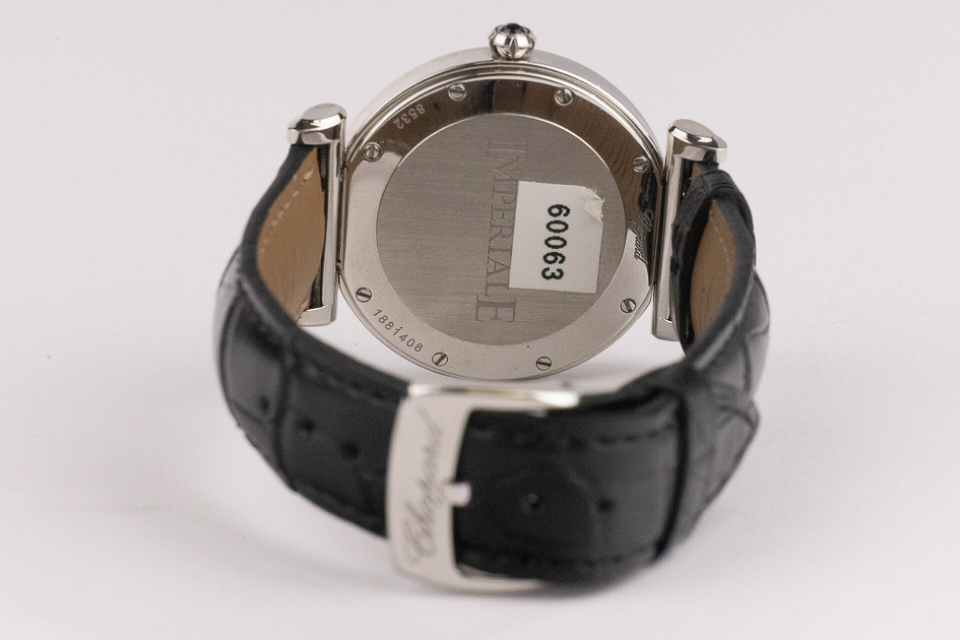 CHOPARD - CHOPARD IMPERIALE 8532. Mouvement quartz (calibre ETA 955.412). Boîtier acier 36mm, verre saphir, étanchéité 3 ATM, bracelet cuir (montre fournie avec un deuxième bracelet cuir). Conditions de vente spécifiques : Veuillez noter que toutes les montres sont vendues en l'état. Aucune garantie n'est faite sur l'état de marche, une révision est donc conseillée. Certaines montres ont été ouvertes pour identifier le type et la qualité du mouvement, y compris les montres résistantes à l'eau, il est donc conseillé à l'acheteur de consulter un horloger pour revoir l'étanchéité de la montre.