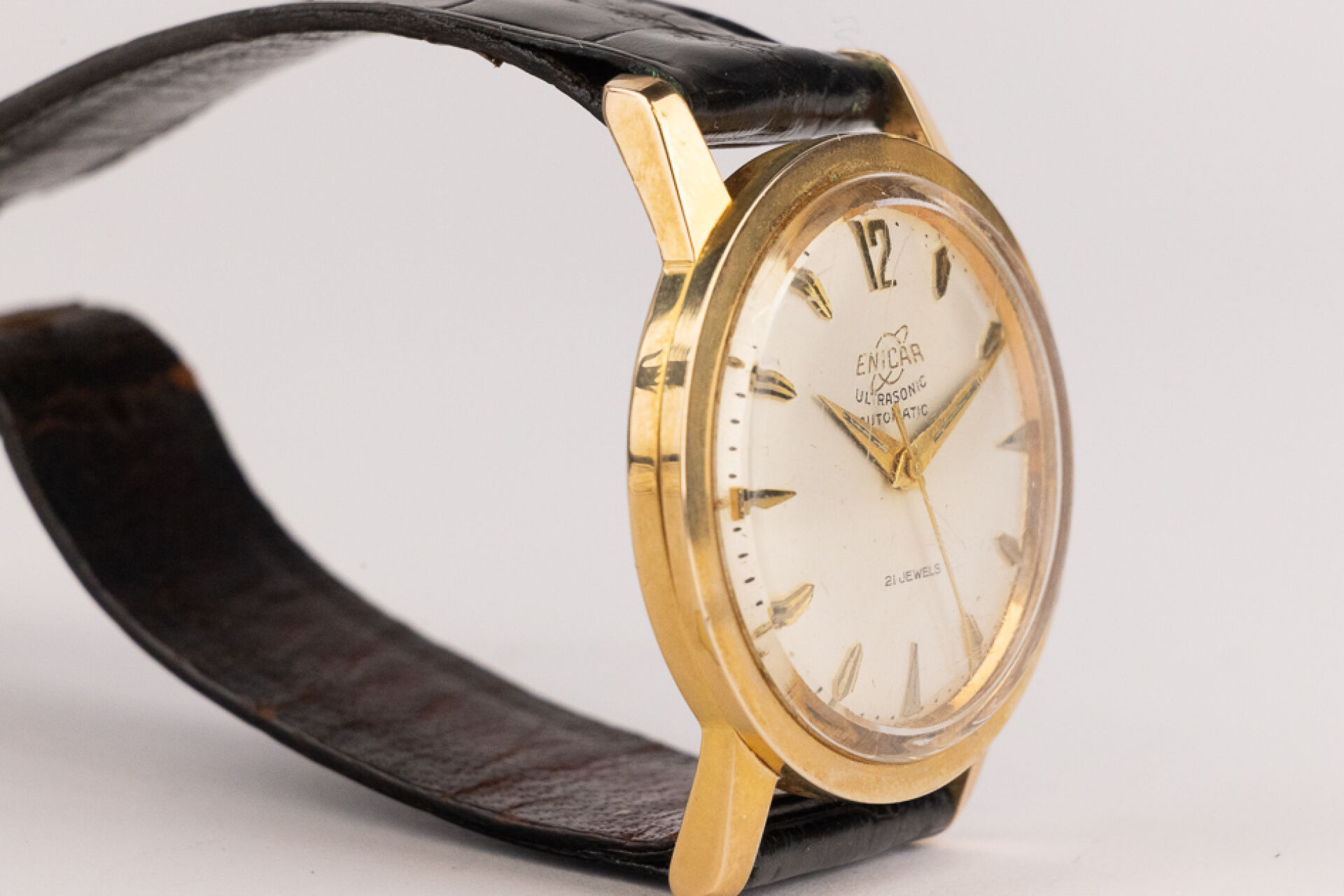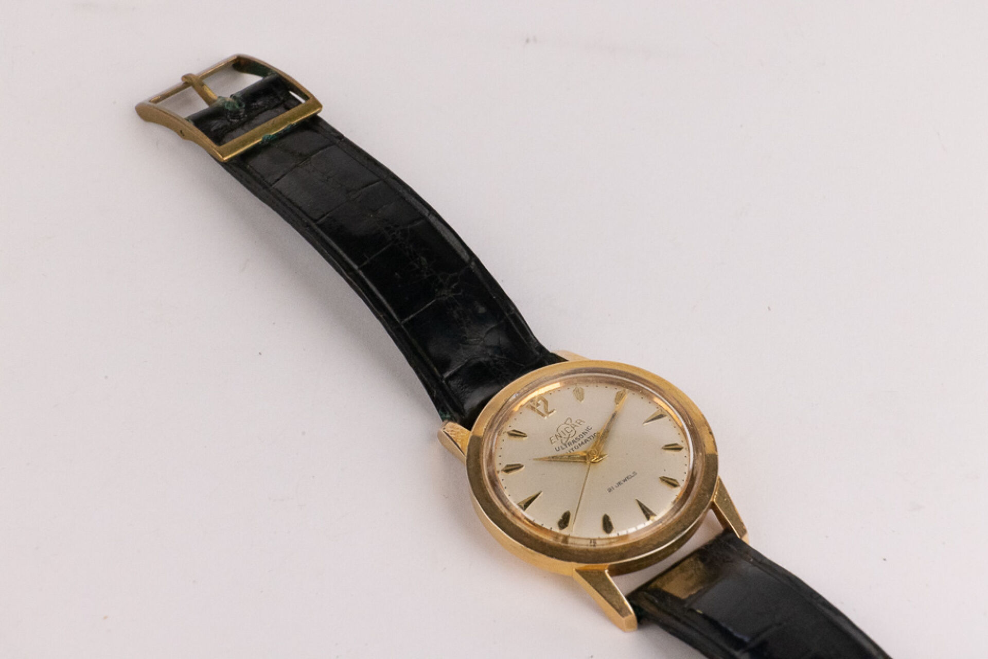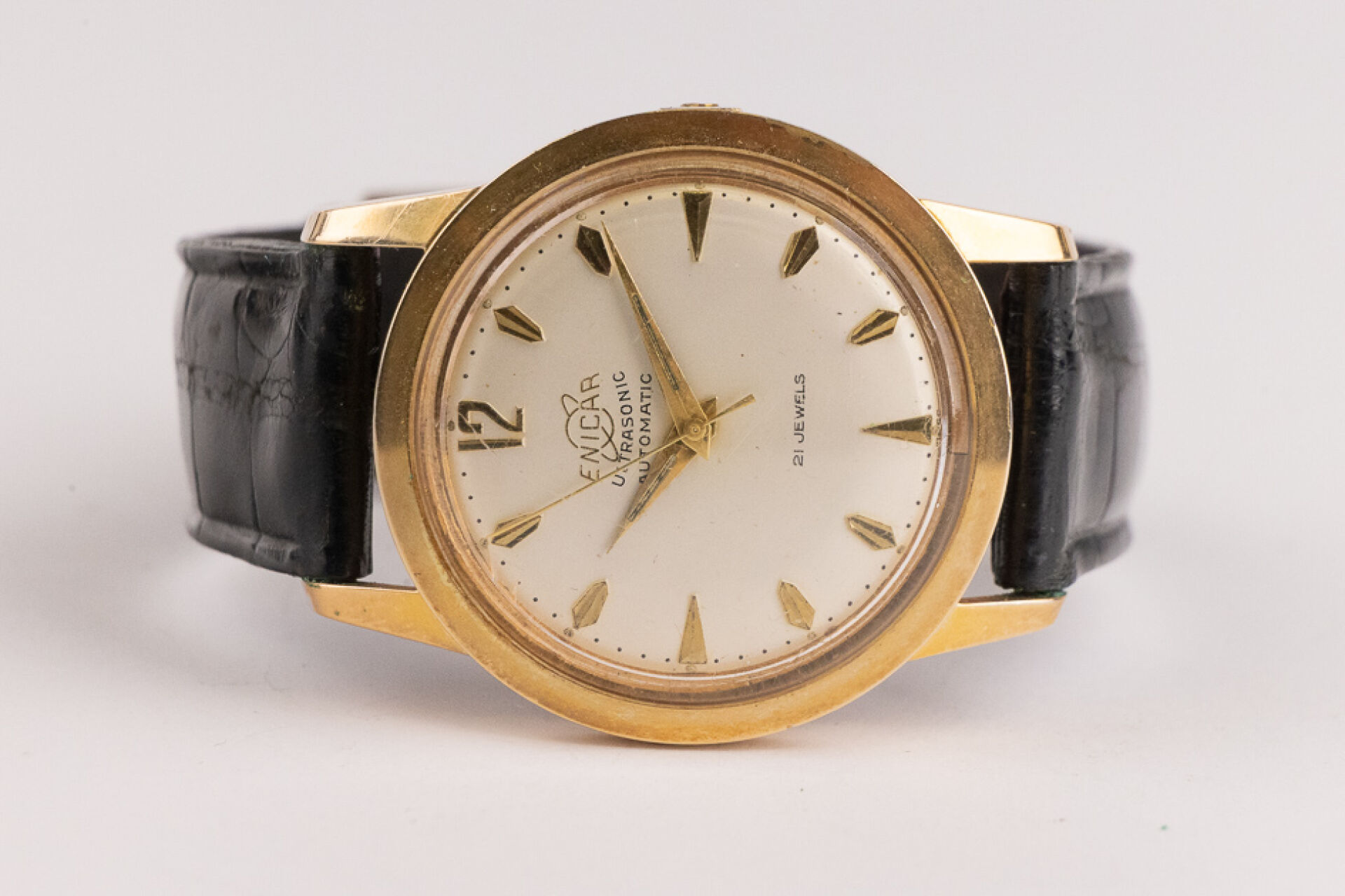 ENICAR Ultrasonic Automatic - Montre boitier rond plaqué or, cadran écru, indes bâtons, bracelet cuir imitation croco noir, boucle ardillon. Diam. : 3,4 cm (traces d'oxydation à la boucle) Conditions de vente spécifiques : Veuillez noter que toutes les montres sont vendues en l'état. Aucune garantie n'est faite sur l'état de marche, une révision est donc conseillée. Certaines montres ont été ouvertes pour identifier le type et la qualité du mouvement, y compris les montres résistantes à l'eau, il est donc conseillé à l'acheteur de consulter un horloger pour revoir l'étanchéité de la montre.