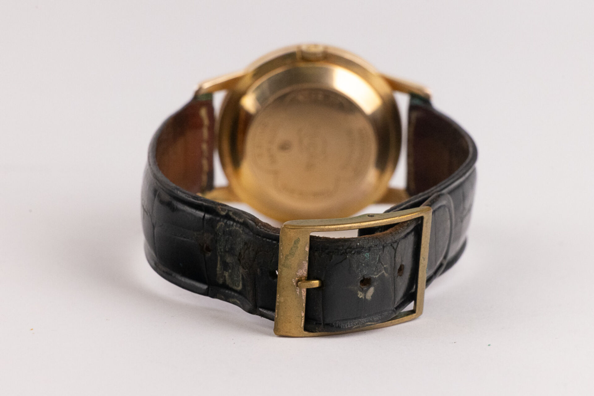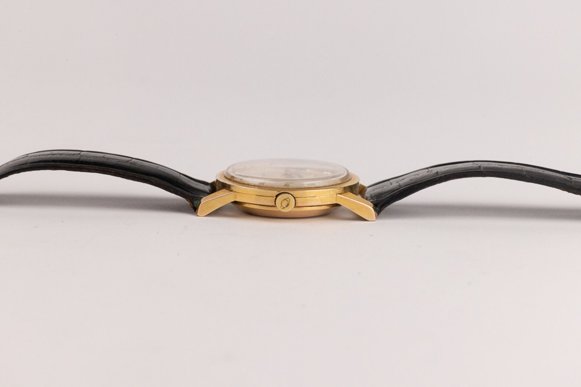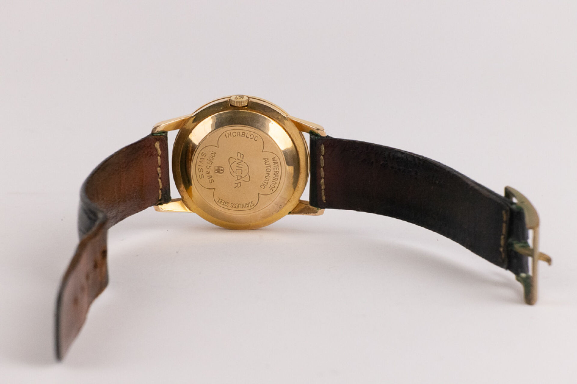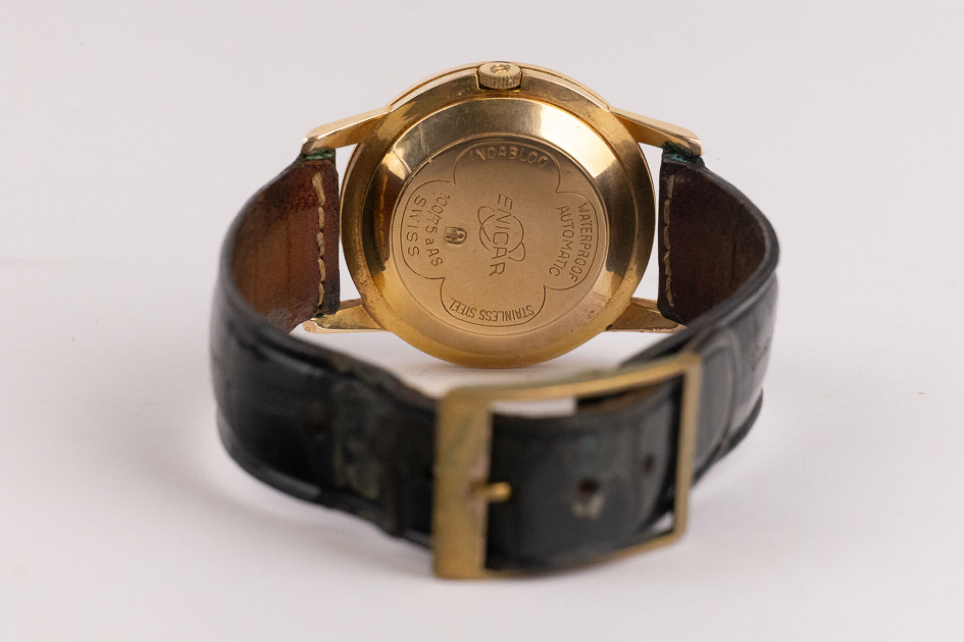 ENICAR Ultrasonic Automatic - Montre boitier rond plaqué or, cadran écru, indes bâtons, bracelet cuir imitation croco noir, boucle ardillon. Diam. : 3,4 cm (traces d'oxydation à la boucle) Conditions de vente spécifiques : Veuillez noter que toutes les montres sont vendues en l'état. Aucune garantie n'est faite sur l'état de marche, une révision est donc conseillée. Certaines montres ont été ouvertes pour identifier le type et la qualité du mouvement, y compris les montres résistantes à l'eau, il est donc conseillé à l'acheteur de consulter un horloger pour revoir l'étanchéité de la montre.