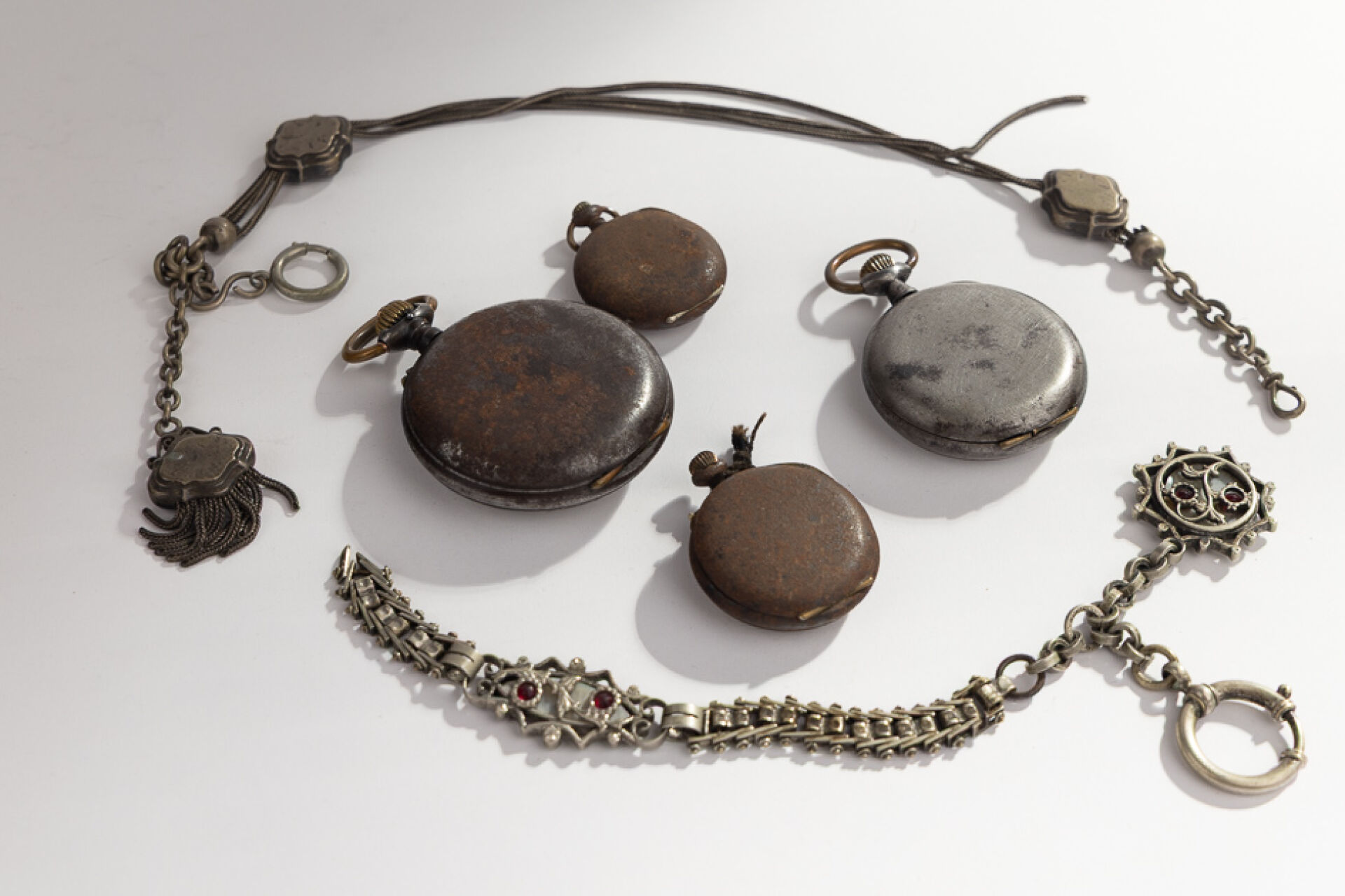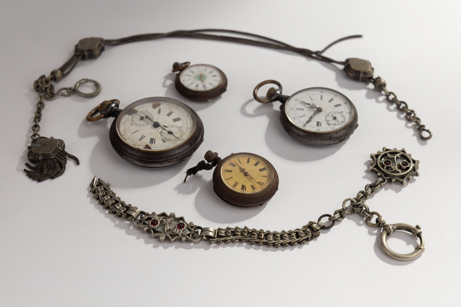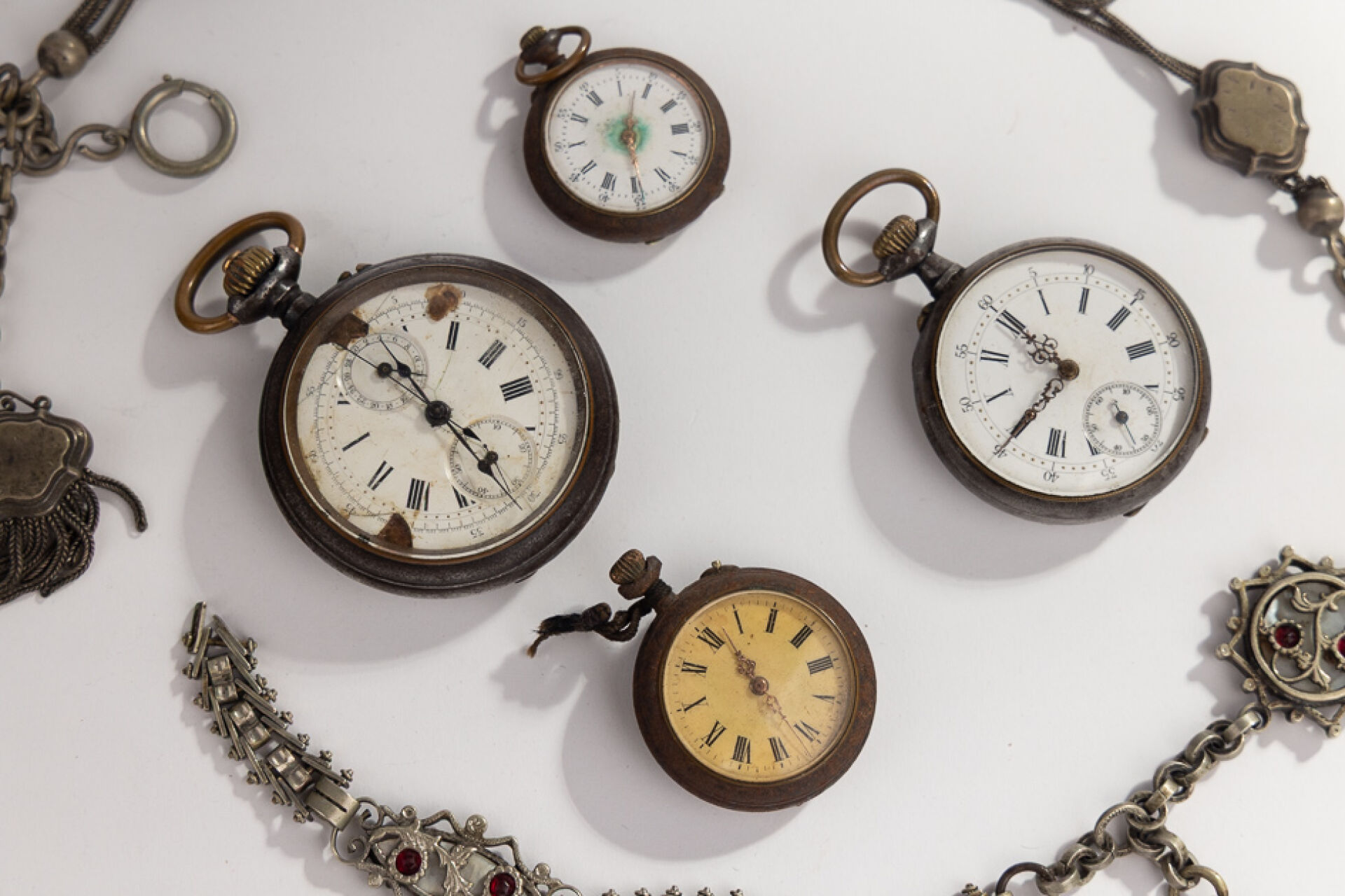 Ensemble de quatre montres à gousset en métal argenté. On joint deux chaines giletières. Conditions de vente spécifiques : Veuillez noter que toutes les montres sont vendues en l'état. Aucune garantie n'est faite sur l'état de marche, une révision est donc conseillée. Certaines montres ont été ouvertes pour identifier le type et la qualité du mouvement, y compris les montres résistantes à l'eau, il est donc conseillé à l'acheteur de consulter un horloger pour revoir l'étanchéité de la montre.