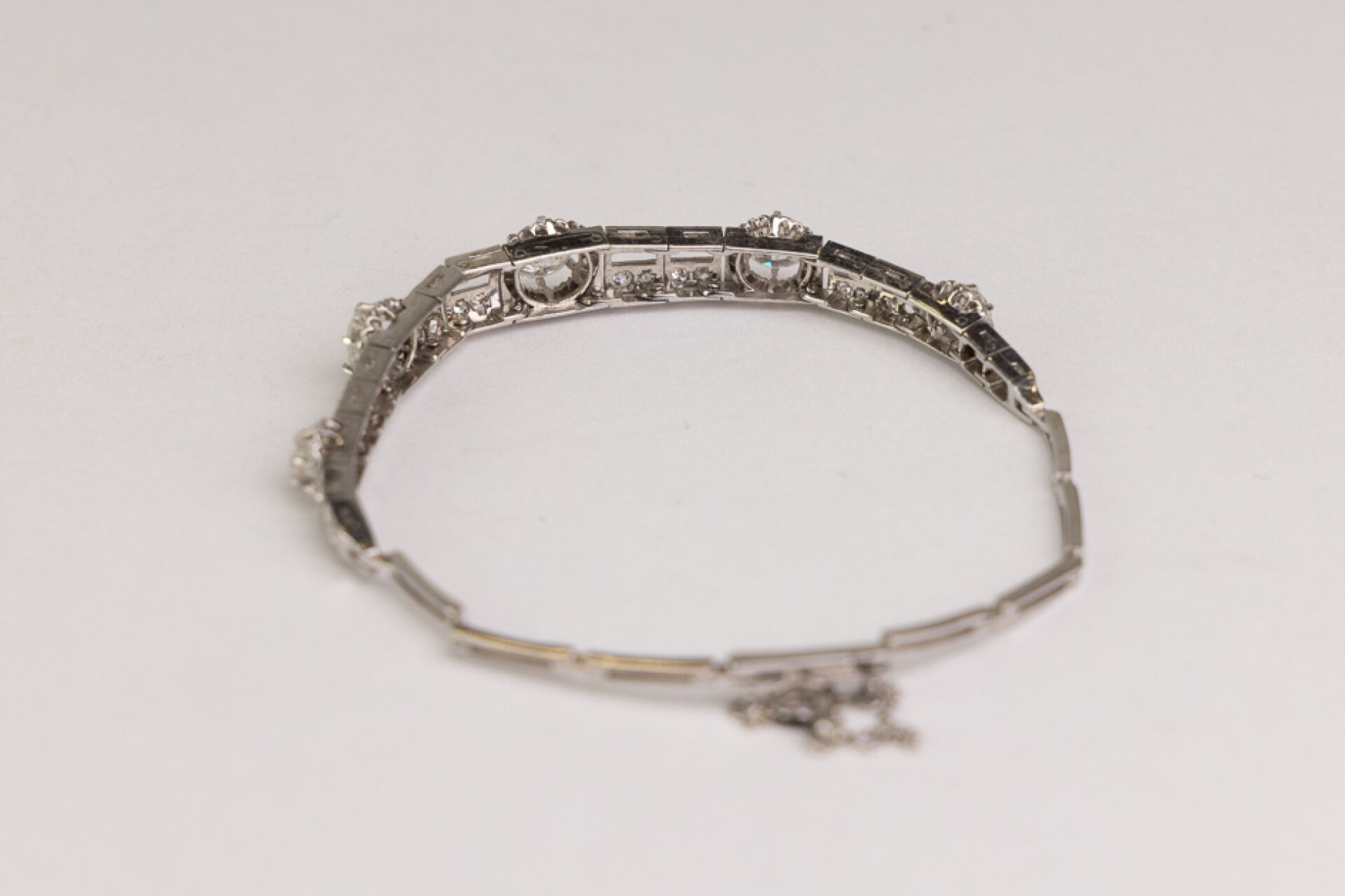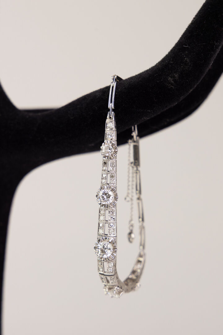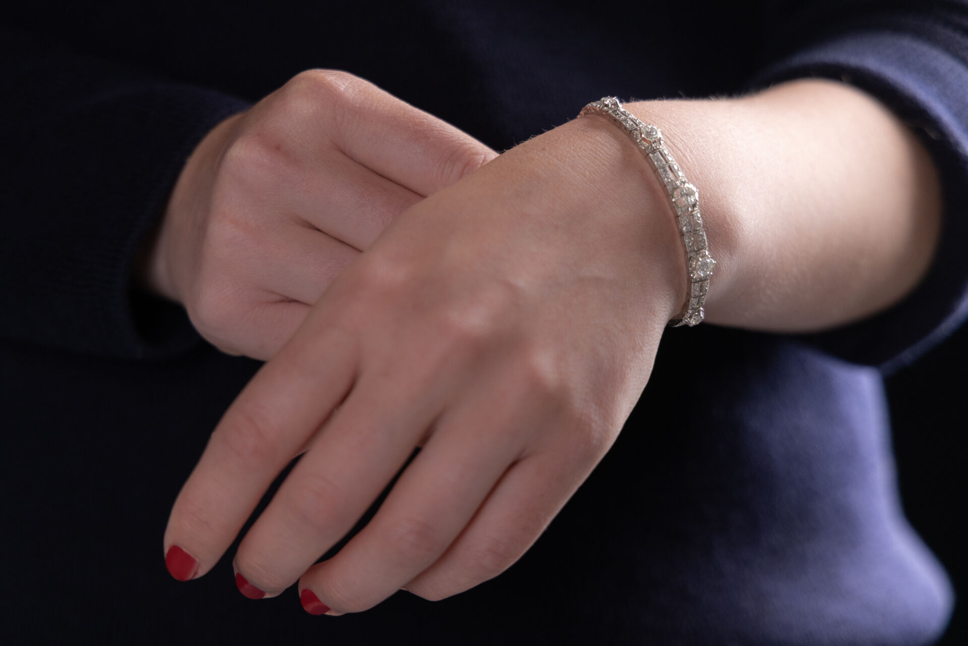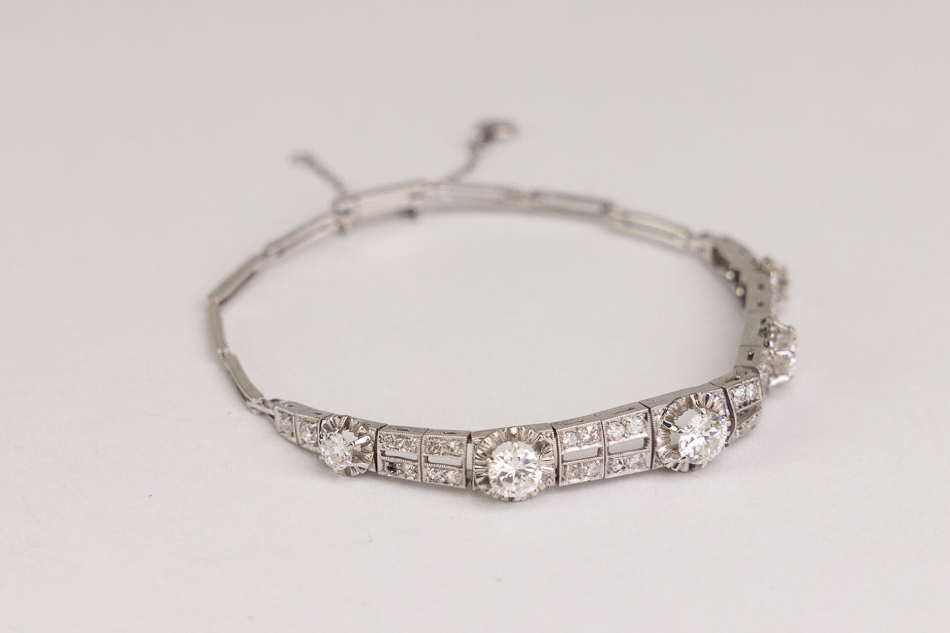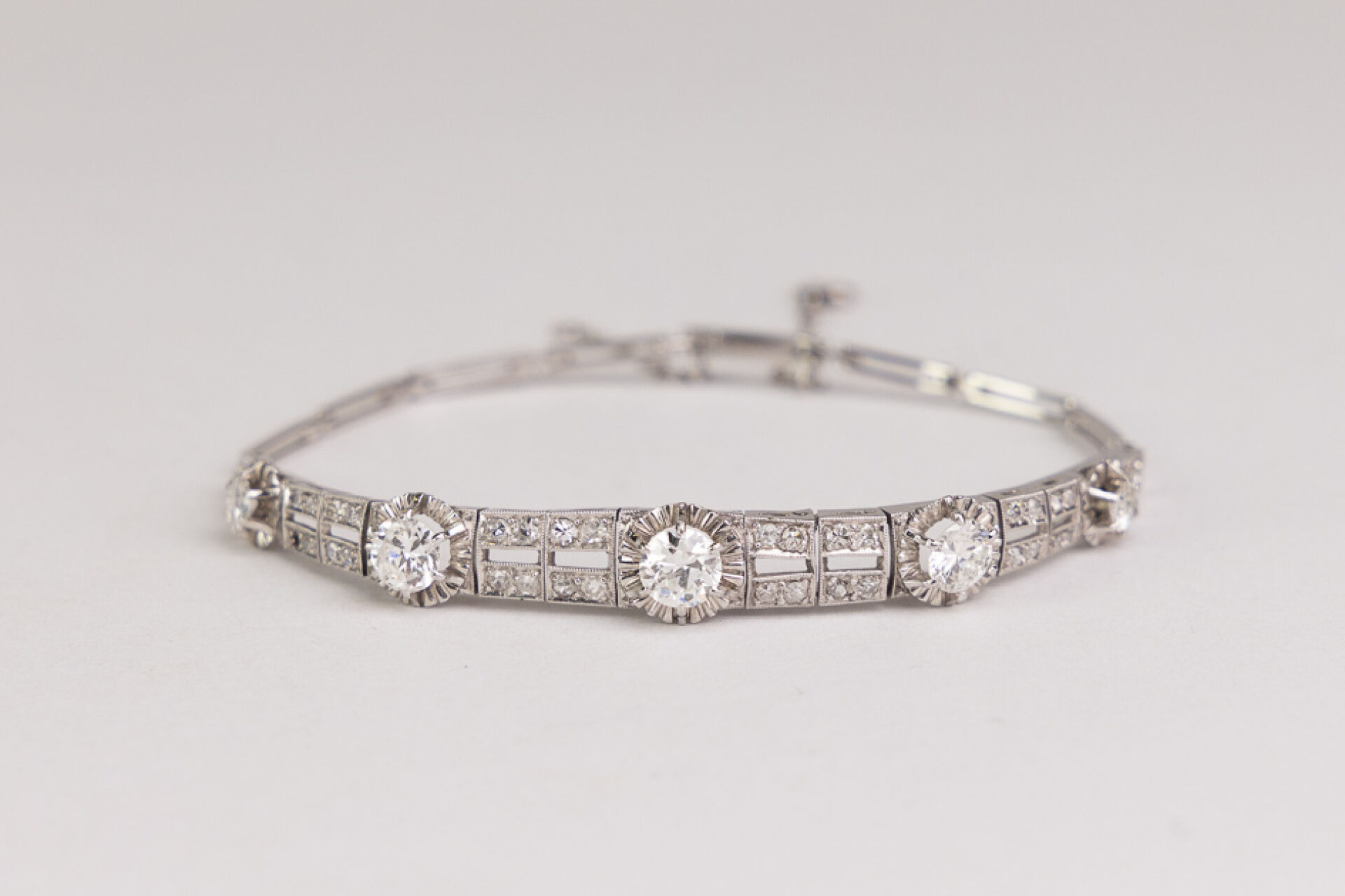 Bracelet articulé en platine 850 millièmes, ajouré et pavé de petits diamants rehaussé de cinq diamants ronds plus importants, chaine de sécurité. Style Art Déco Poids total estimé des diamants : 3,10 ct Poids brut : 13,15 gr - Long. : 18 cm (manque un petit diamant) Conditions de vente spécifiques : Les gemmes, pierres et perles peuvent avoir fait l'objet de pratiques d'embellissement (huilage pour les émeraudes, traitement thermique pour les saphirs ou les rubis, blanchiment pour les perles). Ces améliorations sont considérées comme traditionnelles et sont admises par le commerce international des pierres gemmes et des perles. Par conséquent, ces traitements ne sont pas mentionnés au catalogue. De plus, les pierres n'ayant pas été desserties pour fait l'objet d'un examen approfondi en laboratoire, leur poids en carats vous est fourni à titre indicatif et précédé de la mention « environ ».