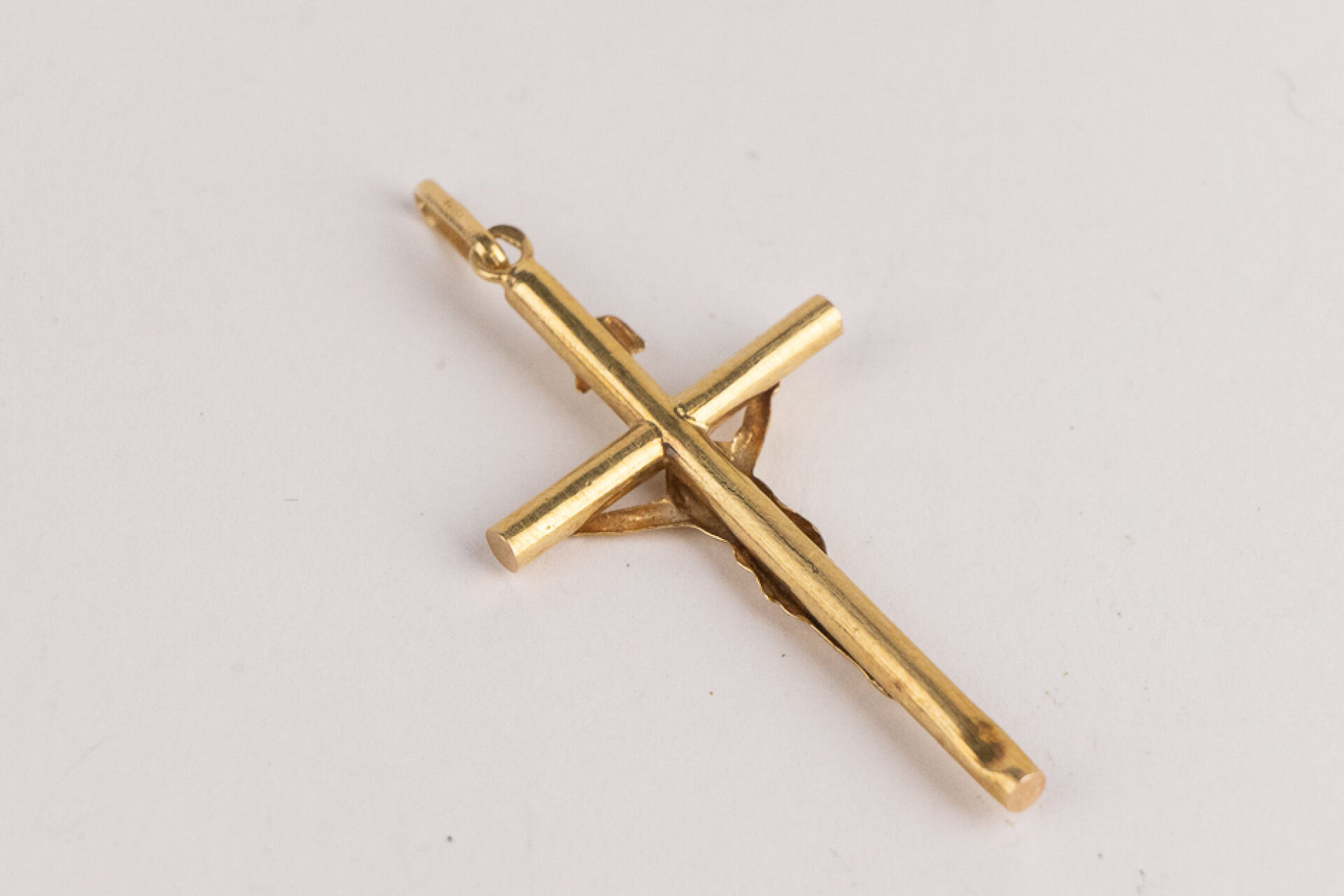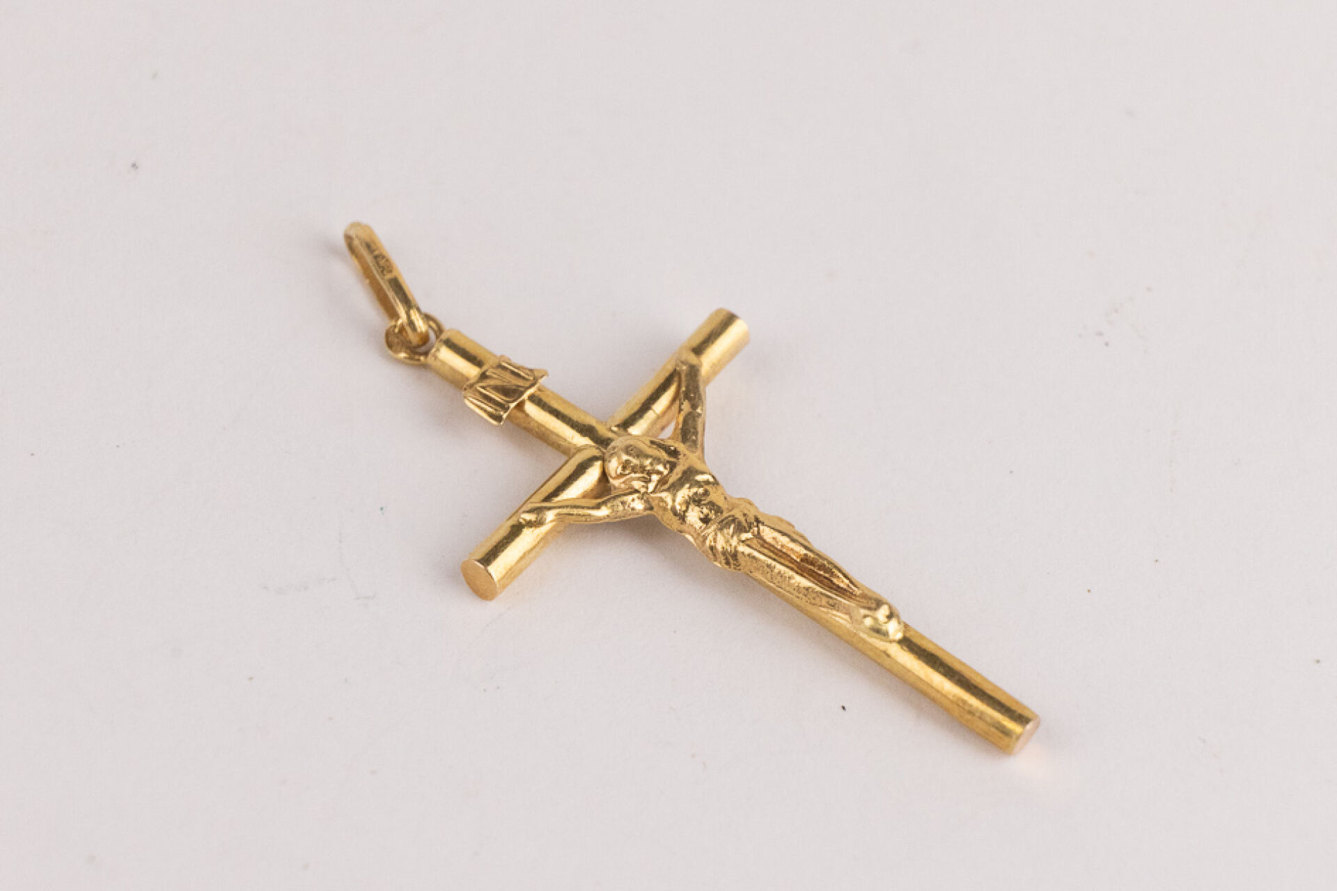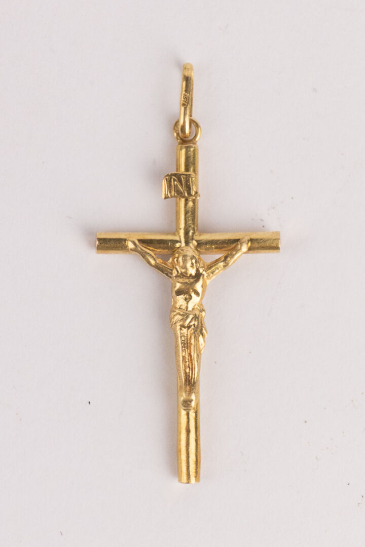 Christ en croix en or jaune 18k (750 millièmes). Poids : 0,94 gr (petit enfoncement)