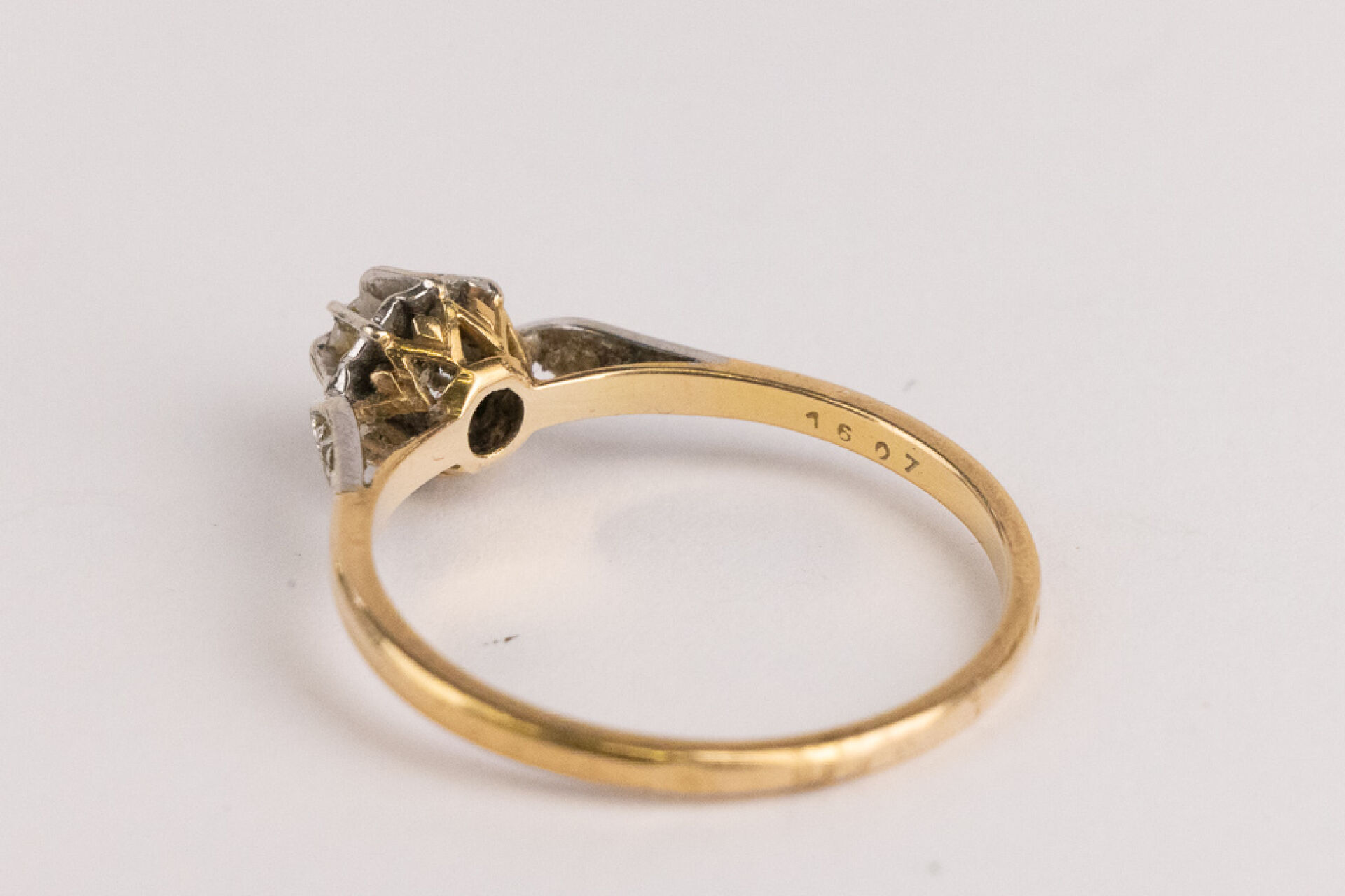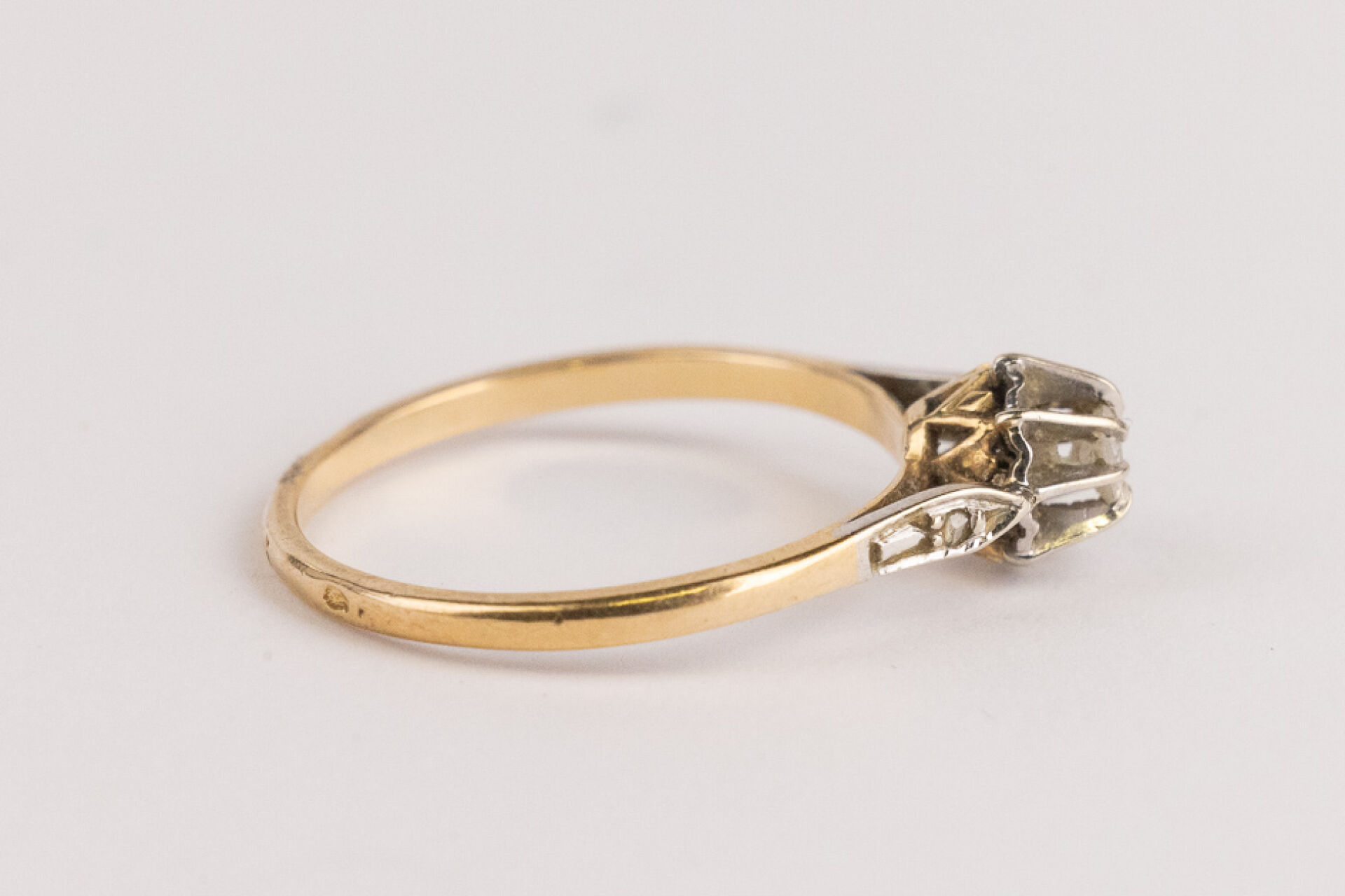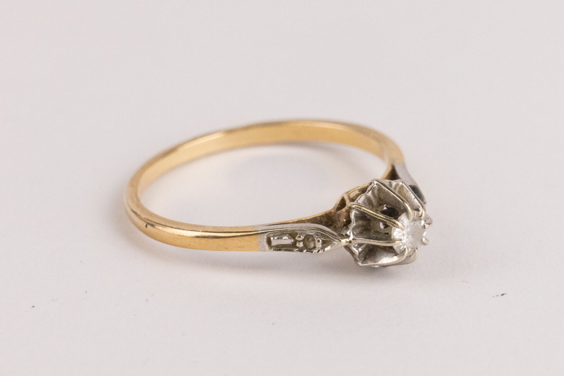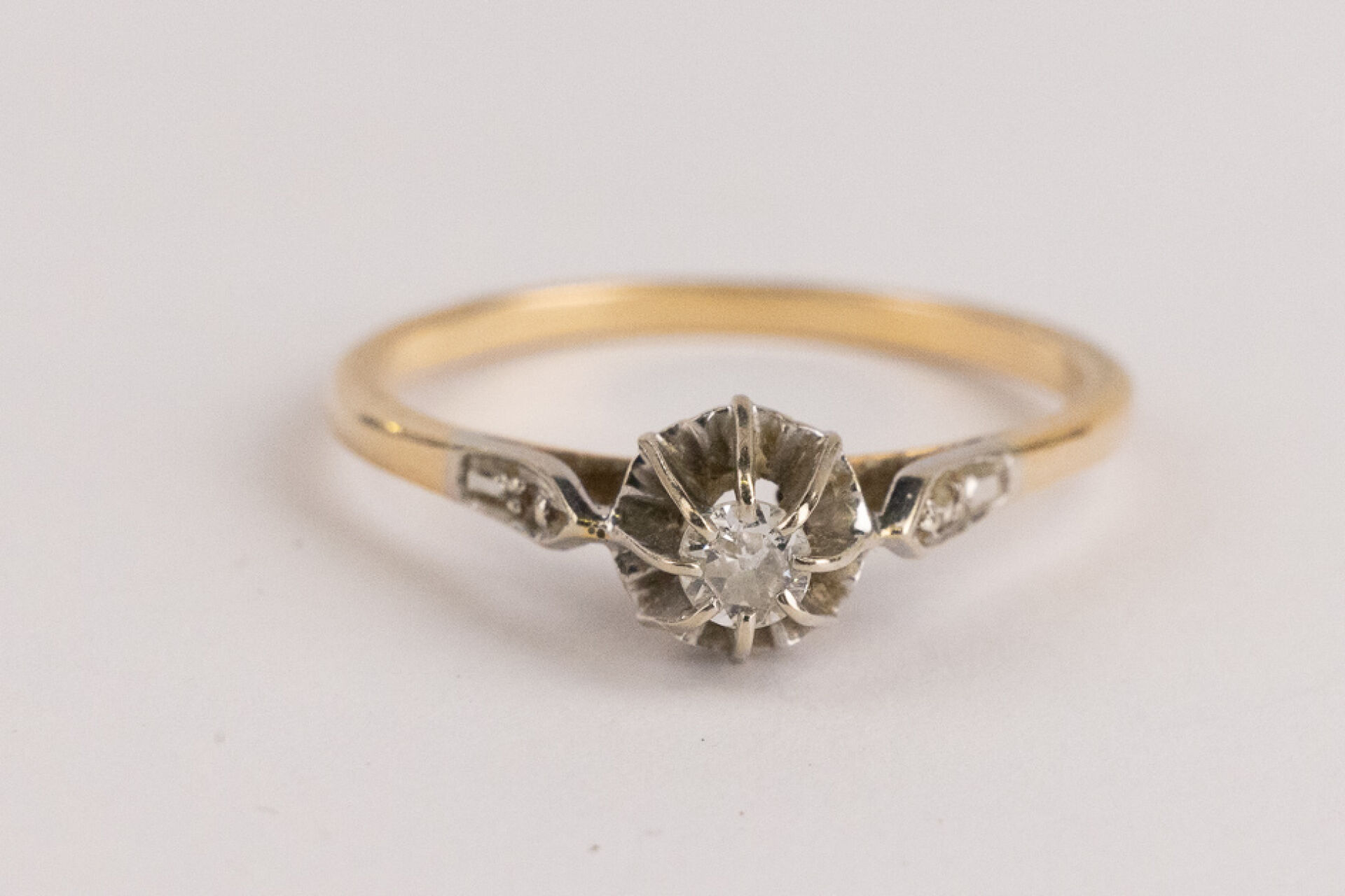 Bague solitaire en or jaune et or gris 18k (750 millièmes) serti étoilé orné d'un diamant d'environ 0.10 carat. Poids brut : 2,40 gr - Tour de doigt 59