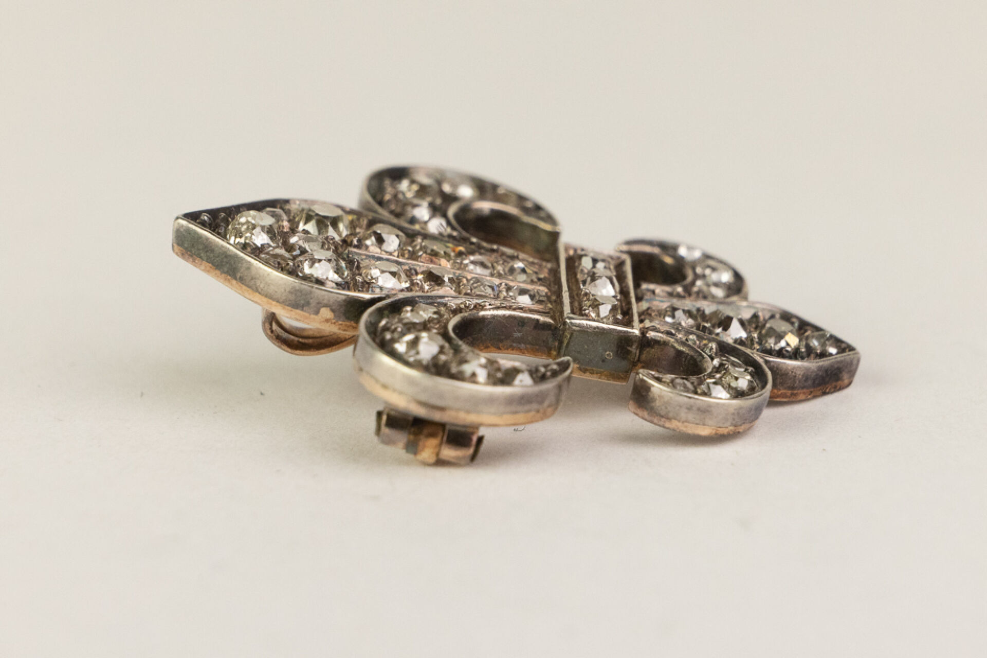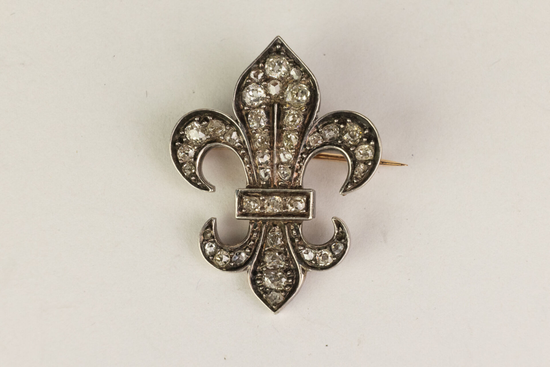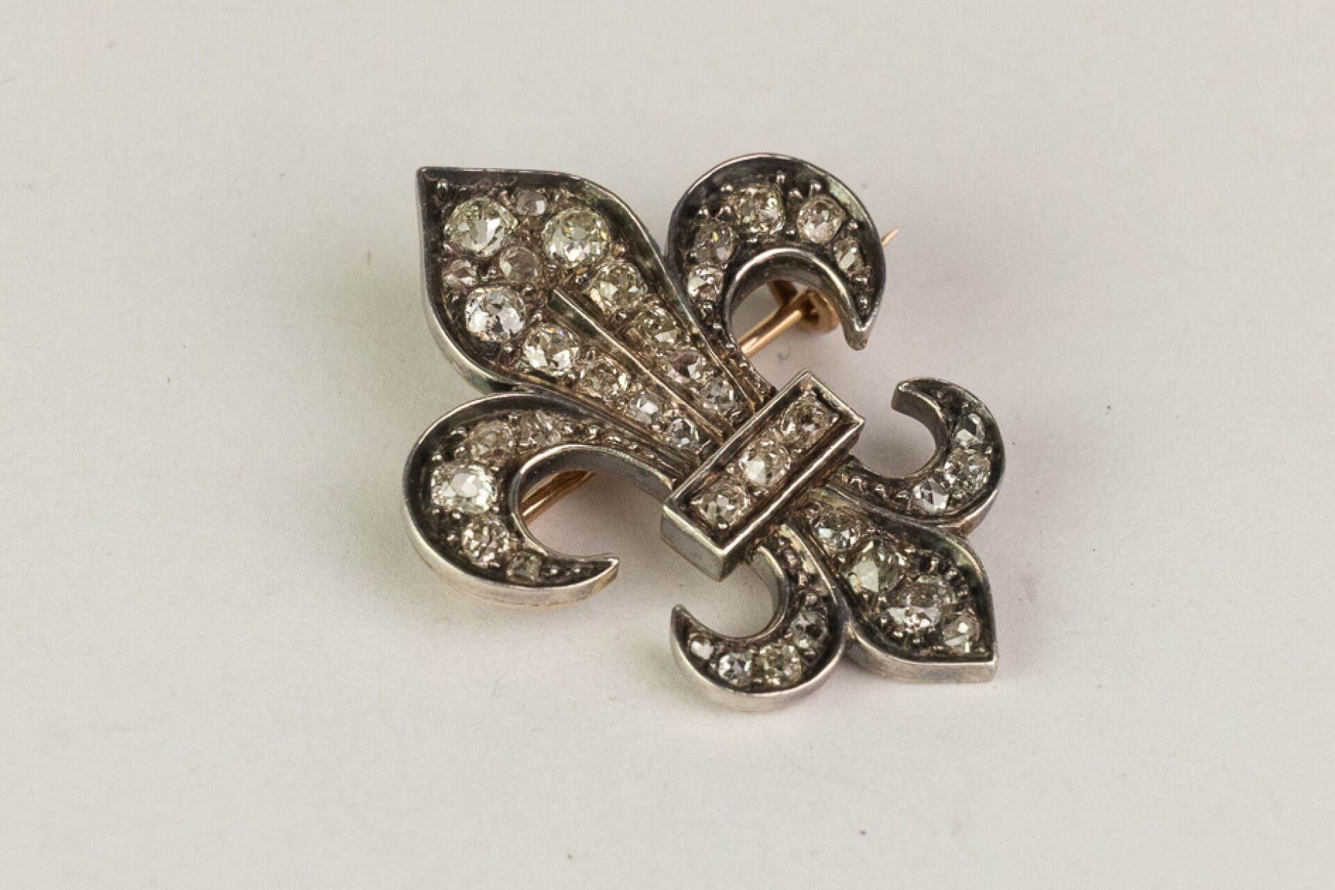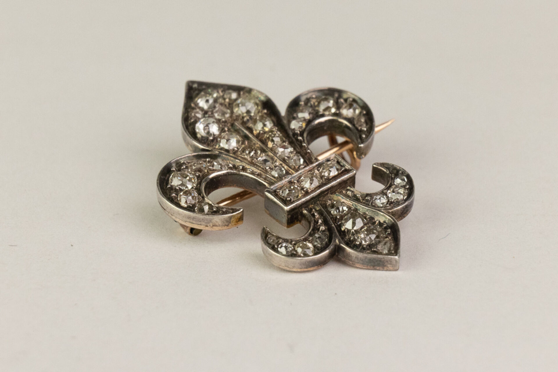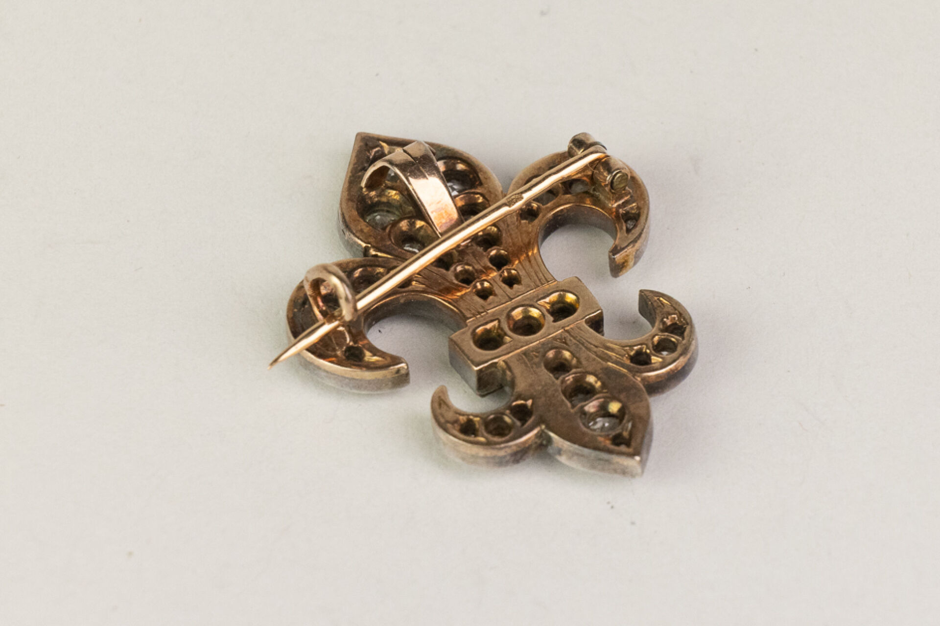 Broche montée en pendentif, monture en or rose et or gris 18 k (750 millièmes) à motif de fleur de lys ornée d'un pavage de diamants taillés en roses de diverses tailles. Poids brut : 10.94 gr Conditions de vente spécifiques : Les gemmes, pierres et perles peuvent avoir fait l'objet de pratiques d'embellissement (huilage pour les émeraudes, traitement thermique pour les saphirs ou les rubis, blanchiment pour les perles). Ces améliorations sont considérées comme traditionnelles et sont admises par le commerce international des pierres gemmes et des perles. Par conséquent, ces traitements ne sont pas mentionnés au catalogue. De plus, les pierres n'ayant pas été desserties pour fait l'objet d'un examen approfondi en laboratoire, leur poids en carats vous est fourni à titre indicatif et précédé de la mention « environ ».