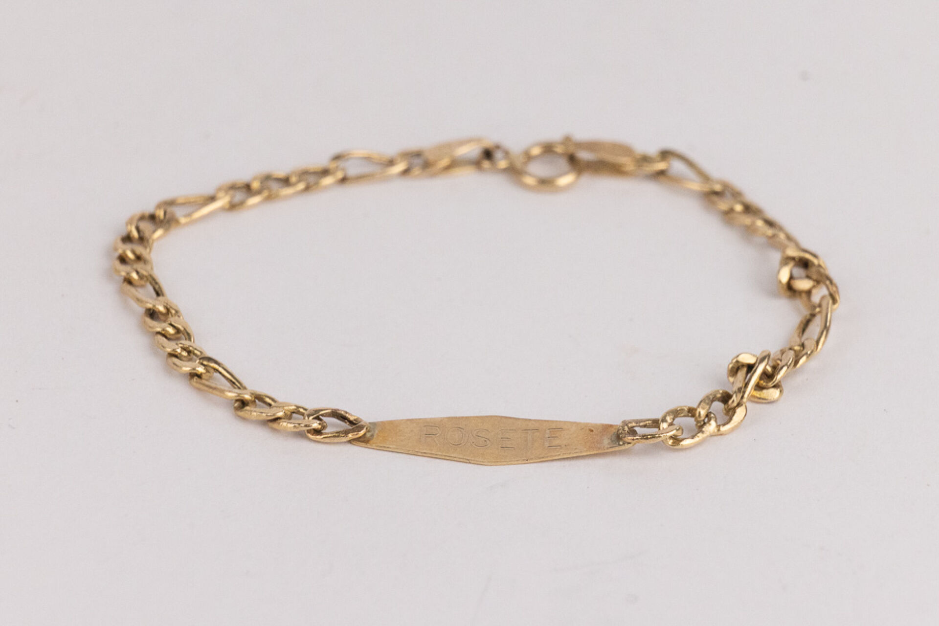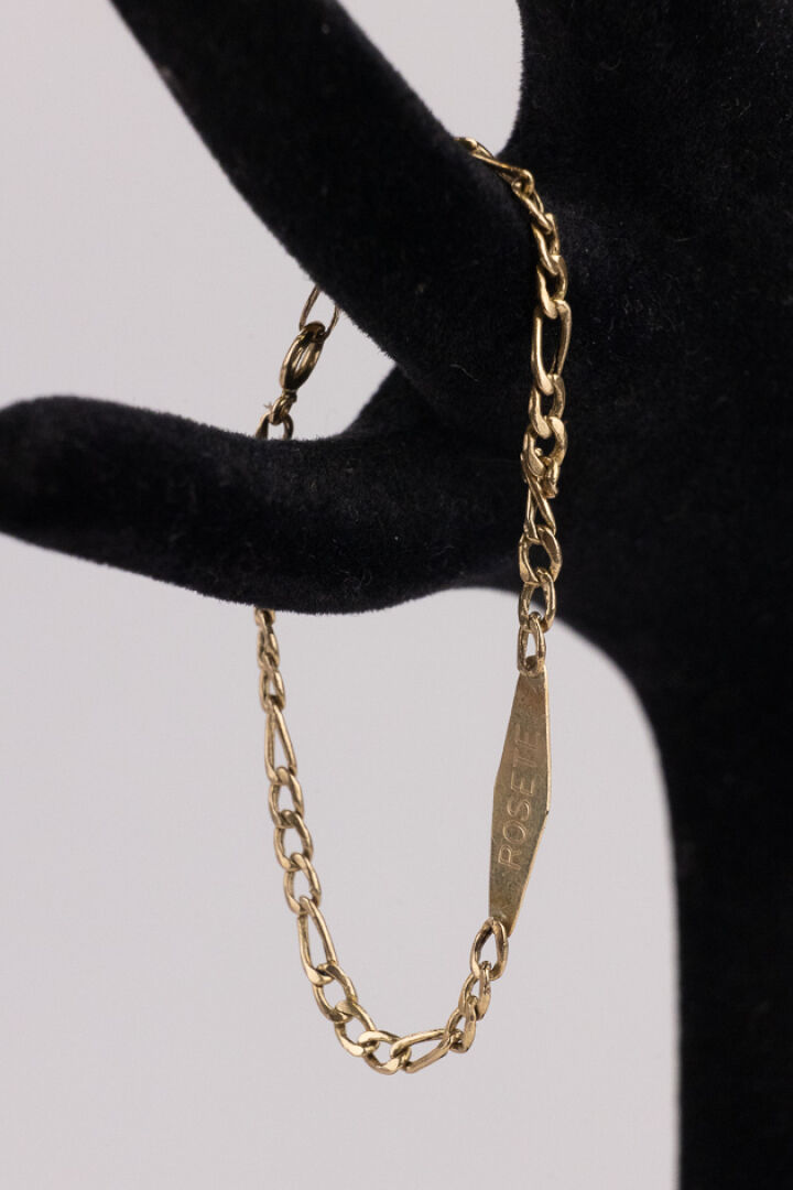 Gourmette en or jaune 14k (585 millièmes), maille figaro, gravée "Laura" et "Rosete" au verso. Poids : 1,92 gr - Long. : 14,5 cm (rayures et petite usures)