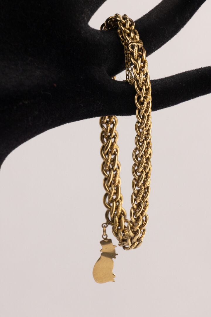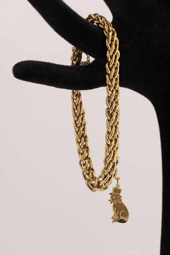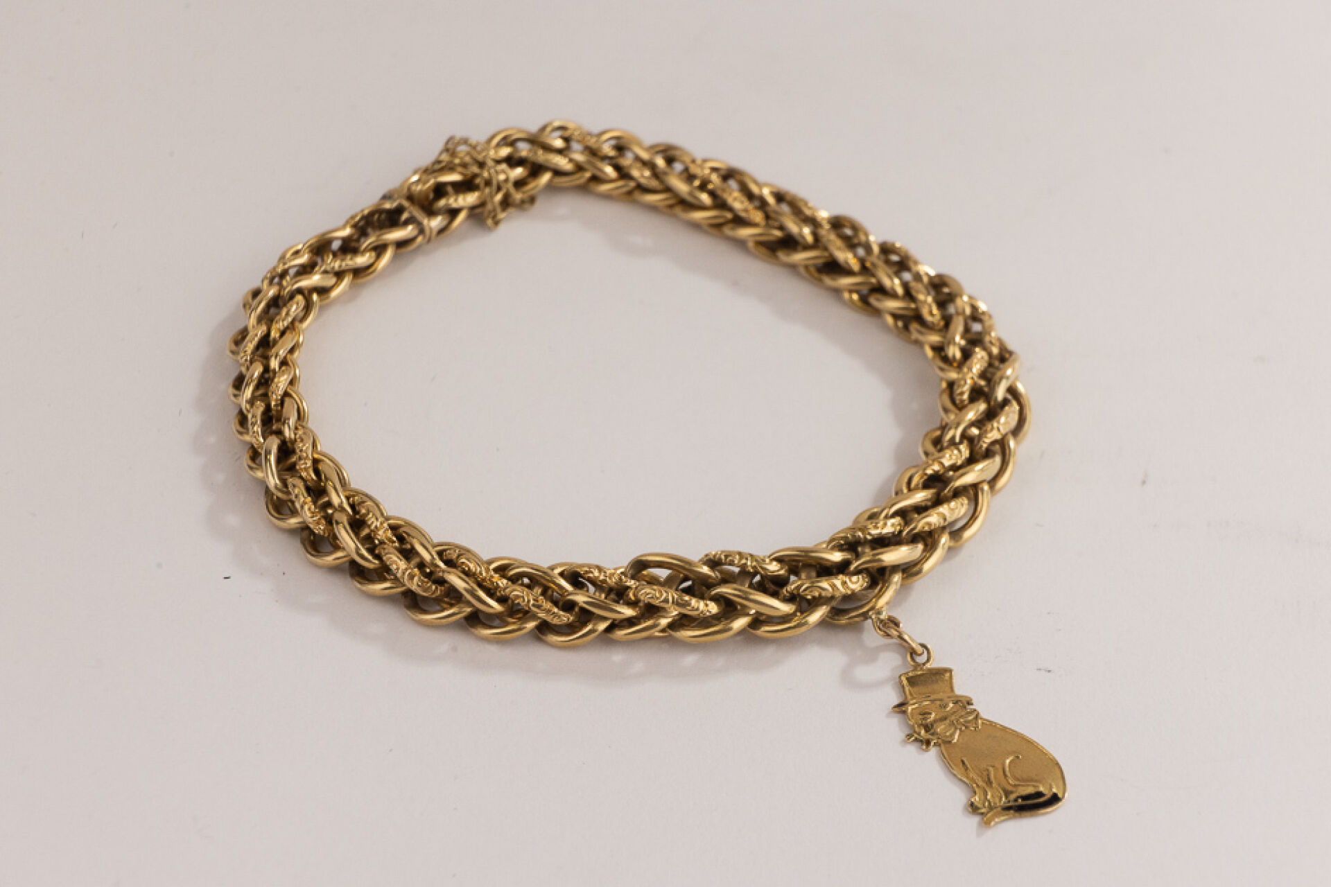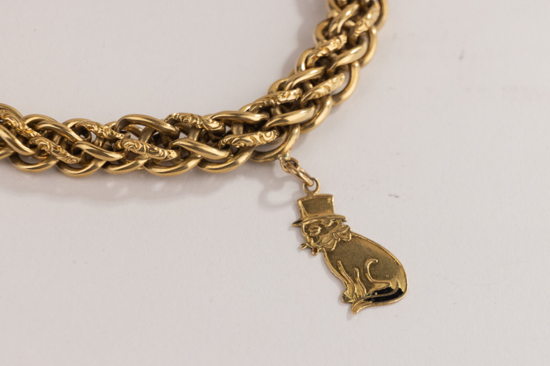Bracelet articulé en or jaune 18k (750 millièmes), maille tressée, retenant un pendentif figurant un chat au chapeau partiellement émaillé, chainette de sécurité. Poids : 26,23 gr - Long. : 19 cm (manque à l'émail du chat)