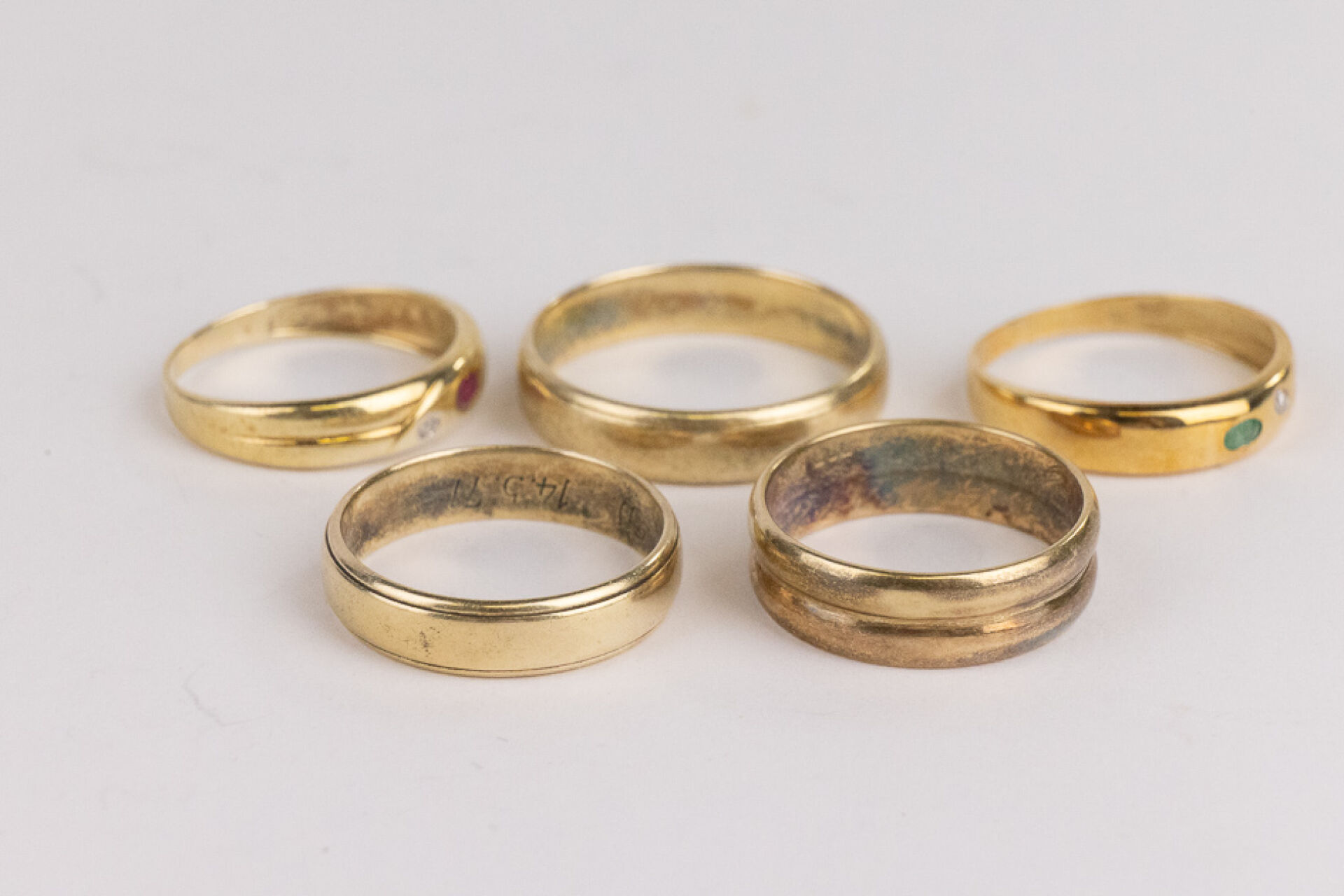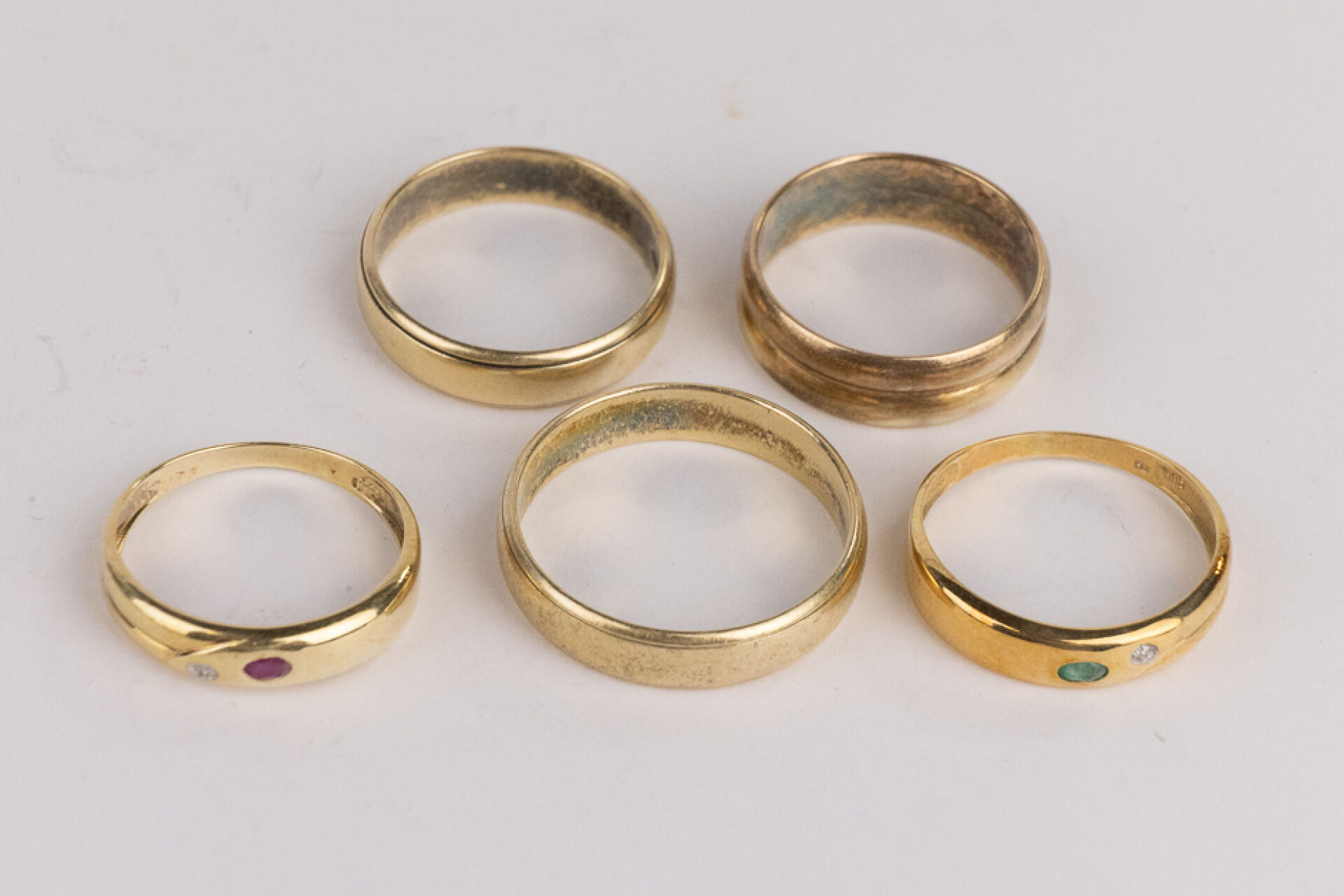 Ensemble de cinq bagues et alliances en or jaune 14k (585 millièmes), certaines ornées de petites pierres. Poids brut : 17,30 gr - Tours de doigt 56, 57, 58 et 65