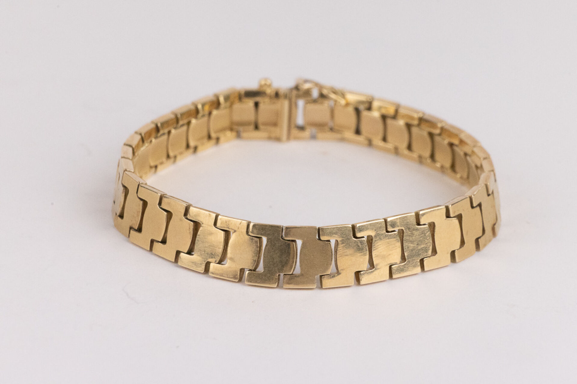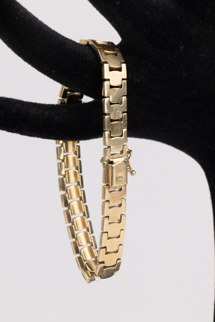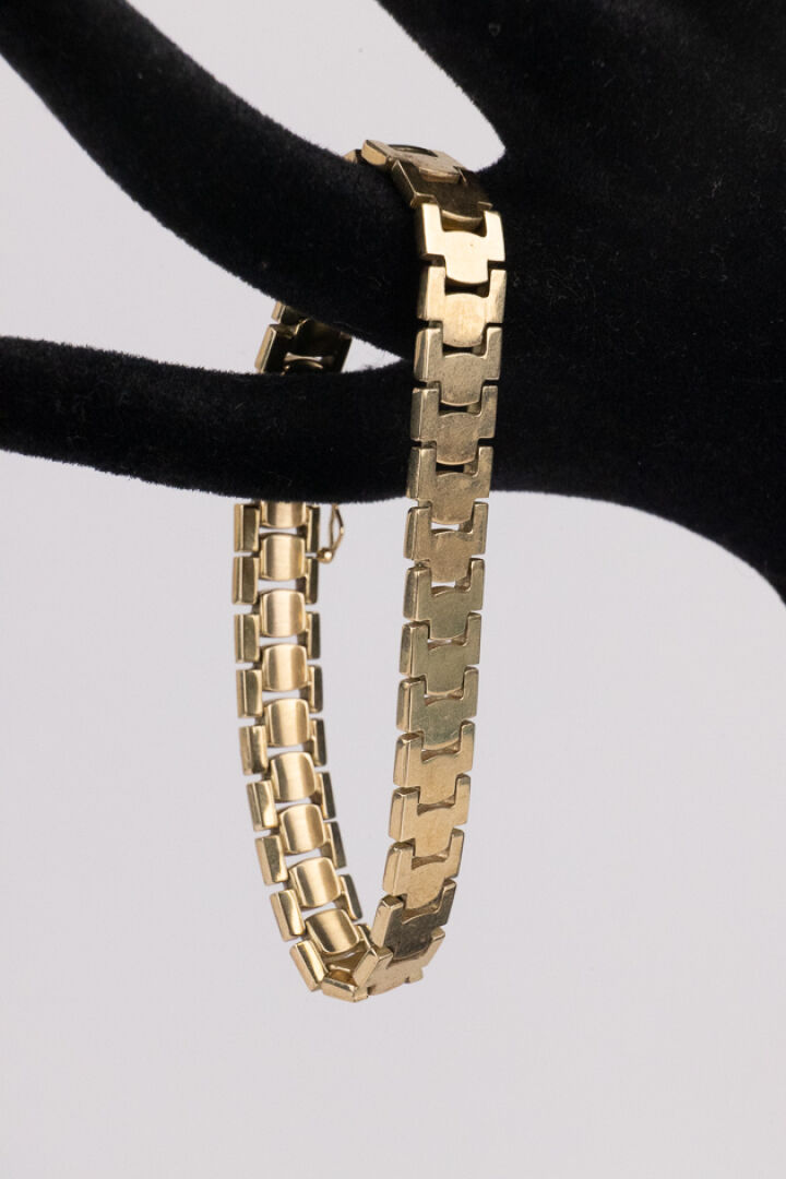 Bracelet articulé en or jaune 14k (585 millièmes), mailles plates, fermoir et huit de sécurité. Poids : 19 gr - Long. : 18 cm