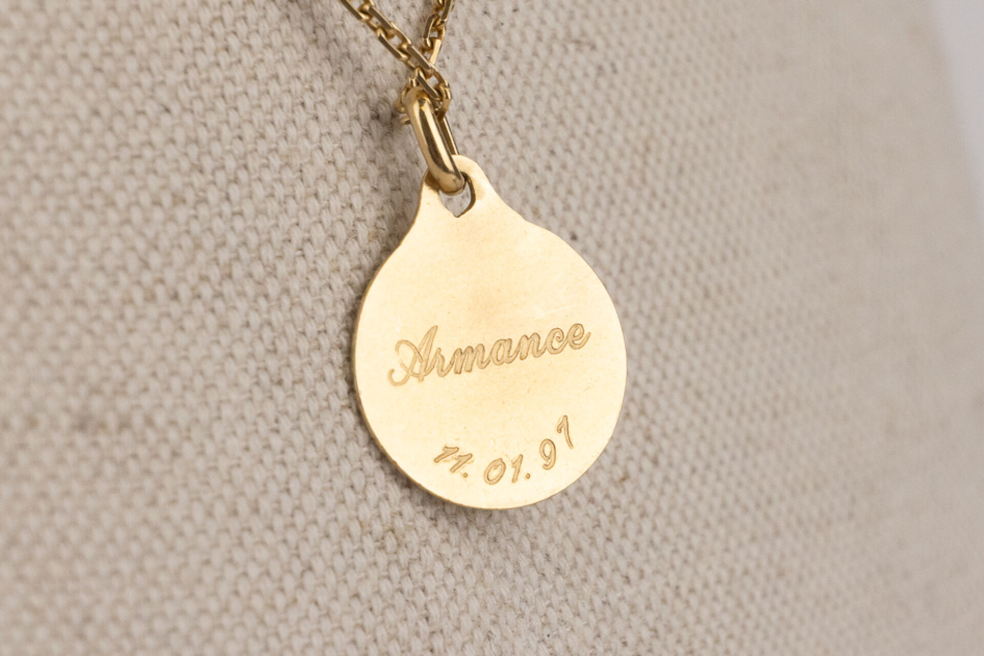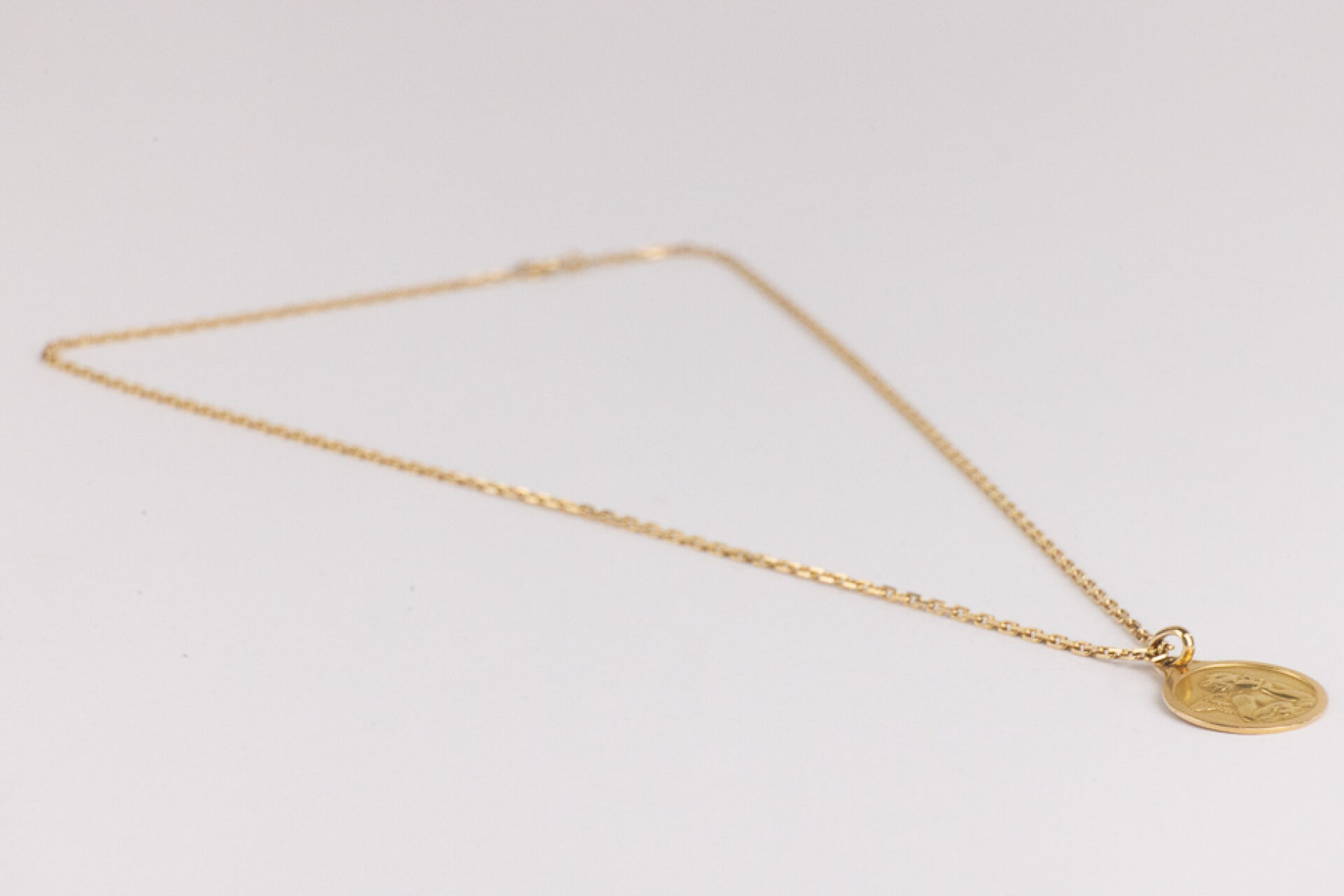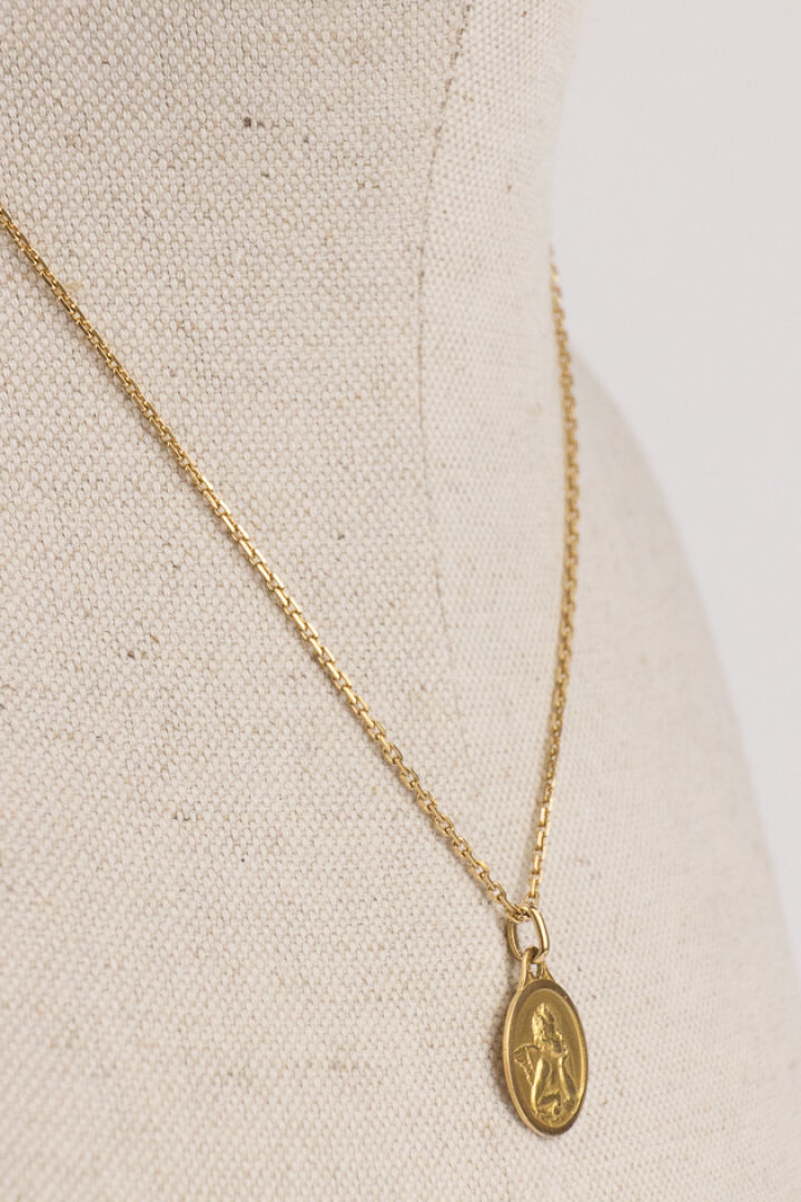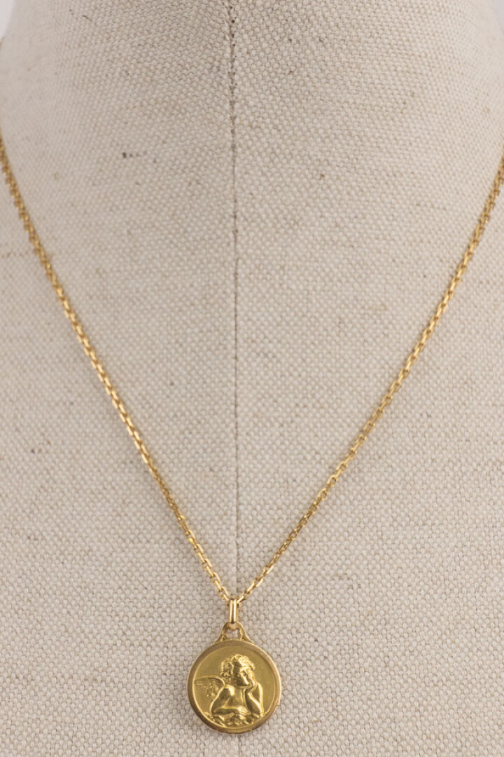 Chaine en or jaune 18k (750 millièmes), maille forçat, retenant une médaille en or jaune 18k (750 millièmes) figurant un ange et gravée "Armance 11.01.97" au dos. Poids total : 9,13 gr - Long. De la chaine : 45,5 cm