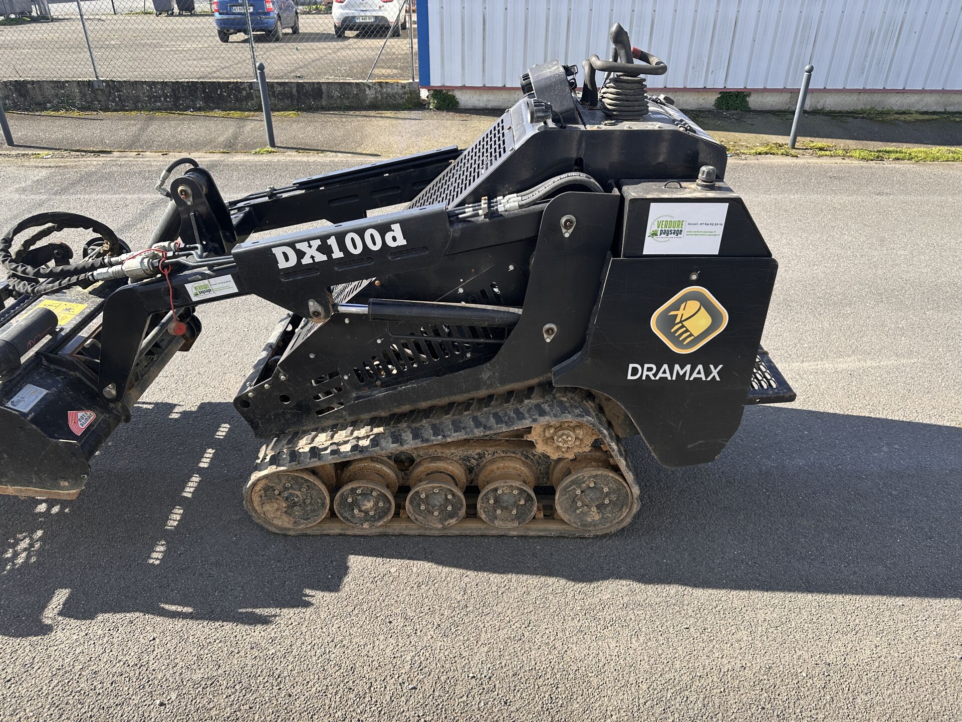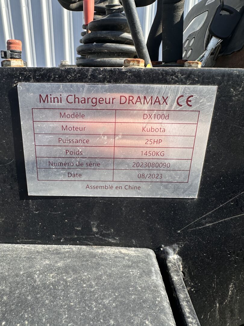 Mini chargeur DRAMAX sur chenilles plastique, modèle DX 100 D, moteur KUBOTA 25 CV, de 2023 Compteur : 98.7 heures - Poids : 1450 kg NS : 2023080090 VENDU SANS LES OUTILS VISIBLES SUR LES PHOTOS A SAVOIR PREPARATEUR DE SOL NI FRAISE NI ROULEAU CAGE
