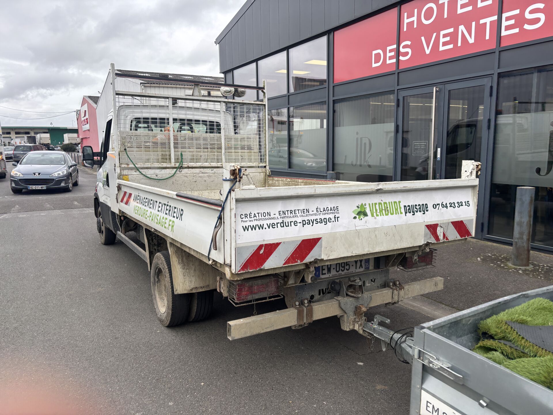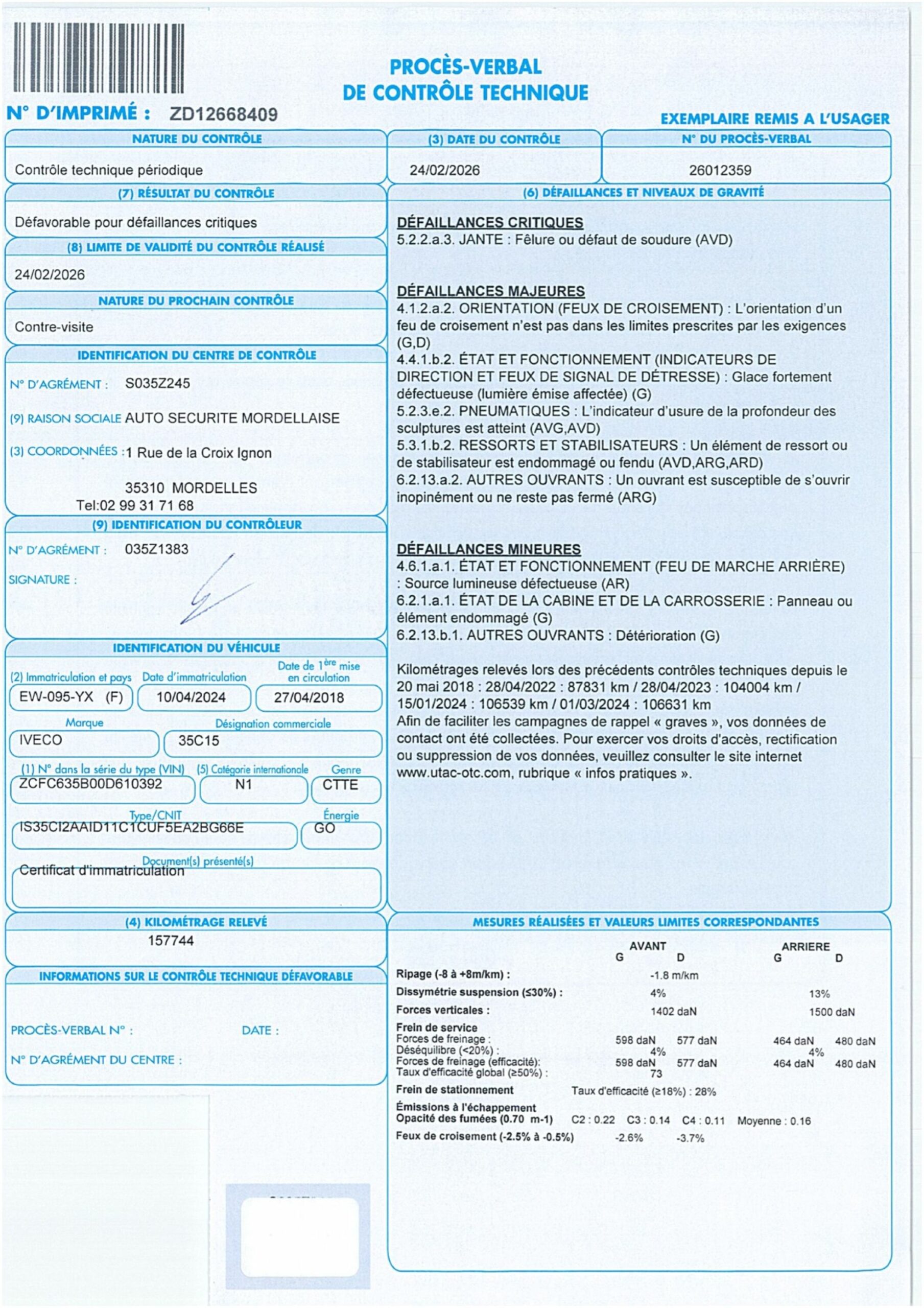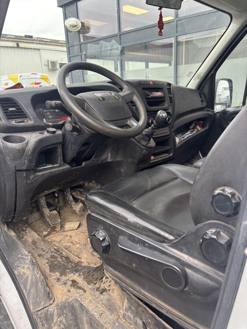 ENLEVEMENT SUR PLATEAU OBLIGATOIRE Boite manuelle 6 vitesses Vitres et rétroviseurs électriques, coffre à outils, roues arrière jumelées, attelage, sérigraphié, enfoncement OBLIGATION POUR L ACQUEREUR DE RETIRER L ADHESIF PUBLICITAIRE DEFAILLANCES CRITIQUES : Jante : fêlure ou défaut de soudure (AVD) DEFAILLANCES MAJEURES : l'orientation d'un feu de croisement n'est pas dans les limites prescrites par les exigences Glace fortement défectueuse (lumière émise affectée) Pneumatiques : indicateur d'usure de la profondeur des sculptures est atteint (AVG, AVD) Un élément de ressort ou de stabilisateur est endommagé ou fendu (AVD, ARG, ARD) Un ouvrant est susceptible de s'ouvrir inopinément ou ne reste pas fermé (ARG) DEFAILLANCES MINEURES : Feu de marche arrière : source lumineuse défectueuse (AR) Etat de la cabine et de la carrosserie (panneau ou élément endommagé (G) Autres ouvrants : déterioration (G)