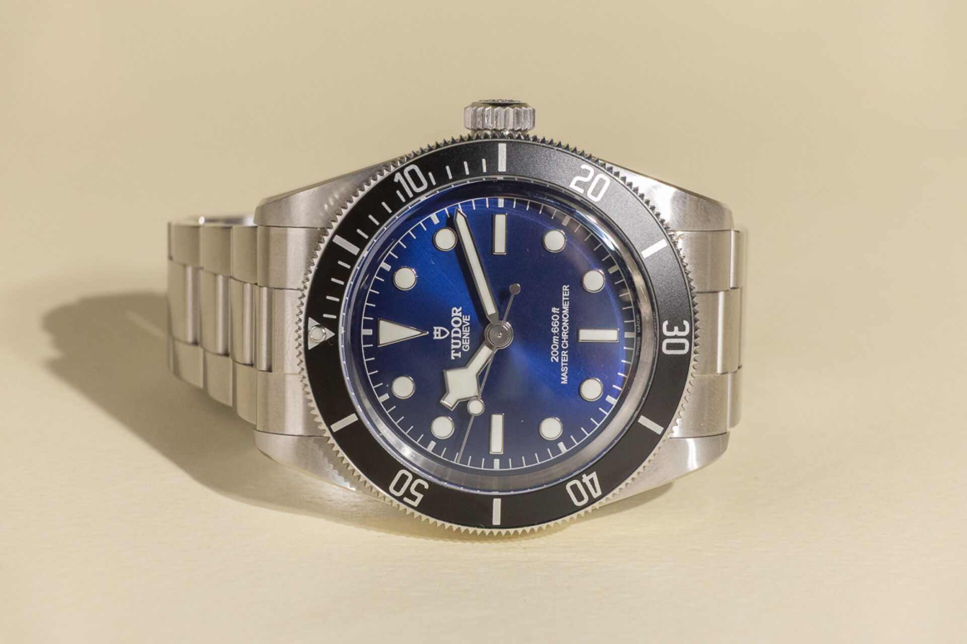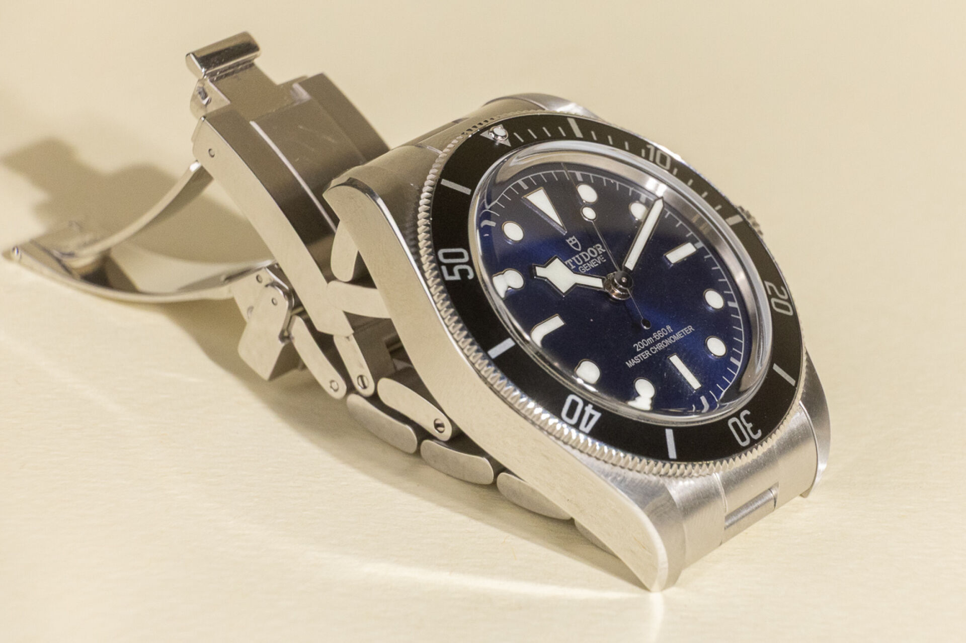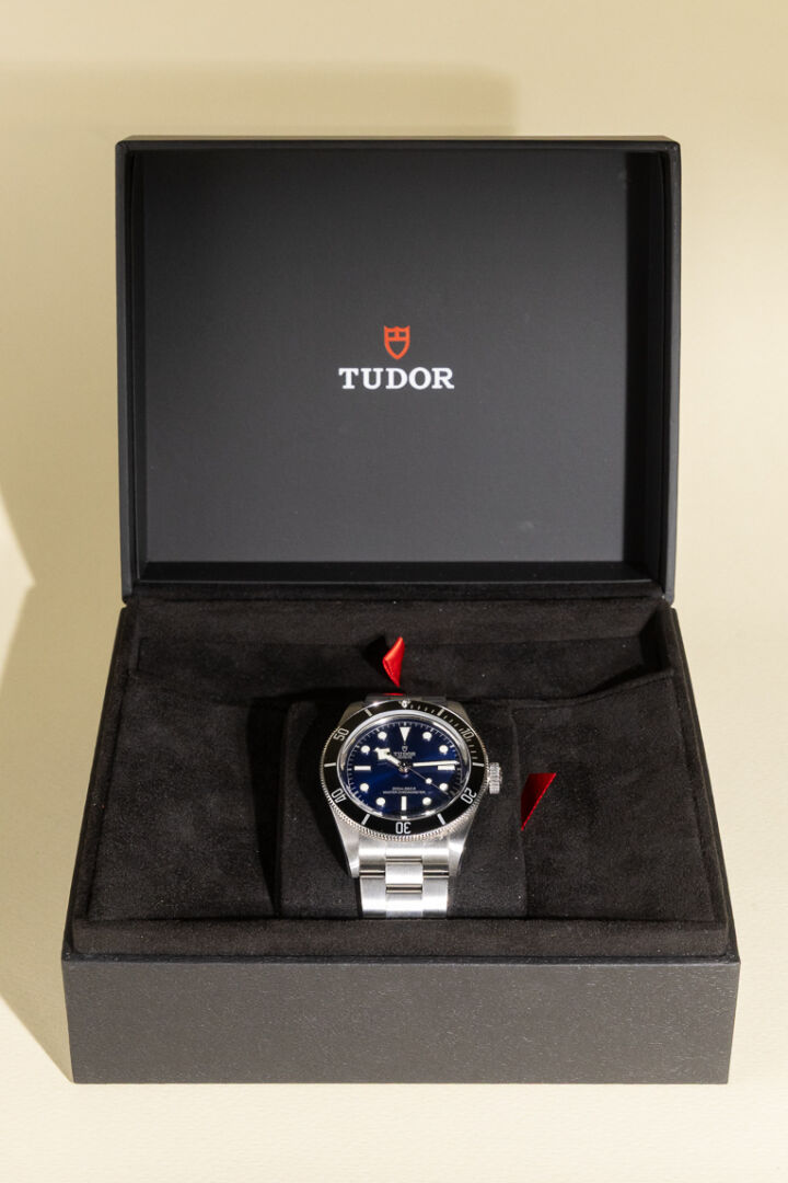 Maison TUDOR. Montre bracelet homme "Black Bay", boitier circulaire en acier, finitions polies et satinées, fond du cadran "Bleu Turdor", index bâtons et points pour les heures, lunette tournante unidirectionnelle graduée 60 minutes en acier avec disque en aluminium noir mat, glace saphir bombée. Mouvement mécanique à remontage automatique bidirectionnel par rotor, couronne de remontoir en acier vissée ornée de la rose Tudor en relief. Bracelet en acier à trois mailles avec finitions polies et satinées, flancs polis, équipé su fermoir Tudor "T-fit". Maillons supplémentaires. Diam. : 42 mm Papiers, écrin et boite. Montre fonctionnant lors de l'expertise, révision conseillée. Conditions de vente spécifiques : Veuillez noter que toutes les montres sont vendues en l'état. Aucune garantie n'est faite sur l'état de marche, une révision est donc conseillée. Certaines montres ont été ouvertes pour identifier le type et la qualité du mouvement, y compris les montres résistantes à l'eau, il est donc conseillé à l'acheteur de consulter un horloger pour revoir l'étanchéité de la montre.