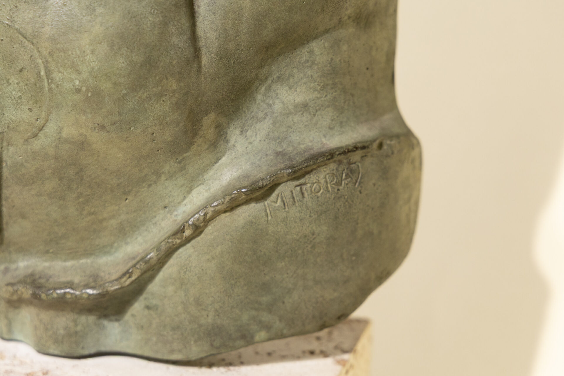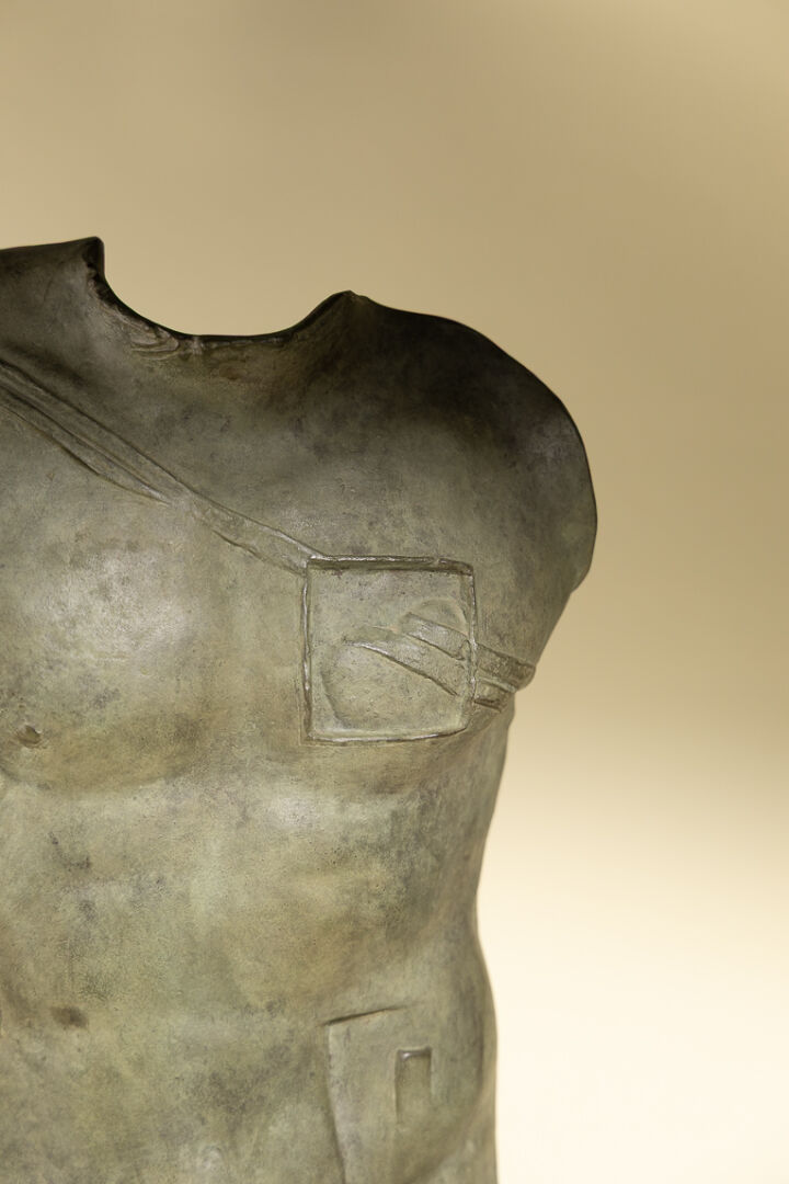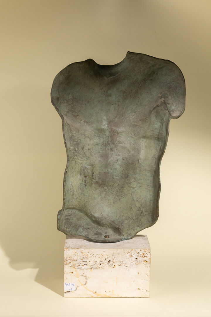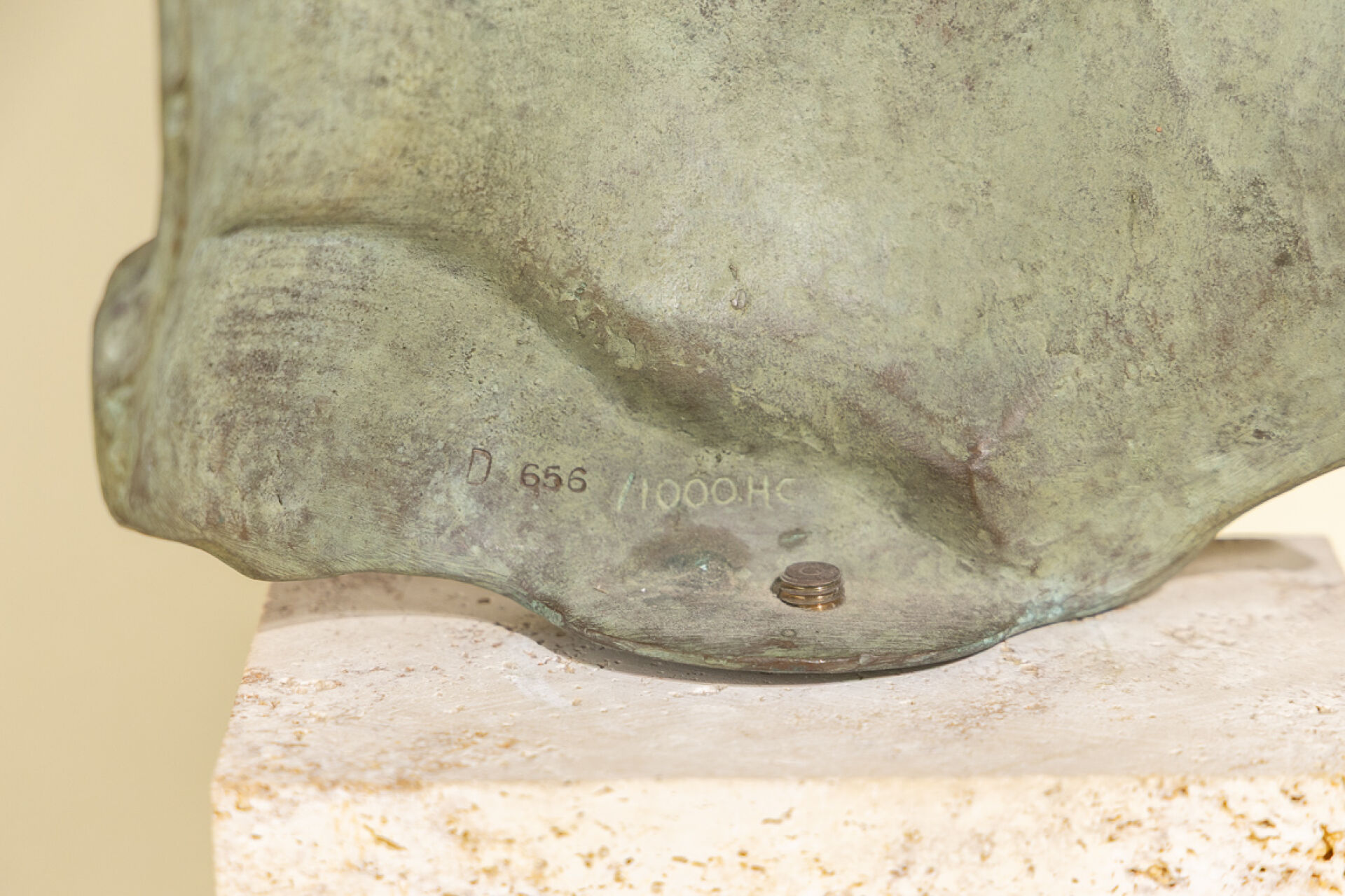 Igor MITORAJ (1944-2014). "Persée". Sujet en bronze à patine verte, signé et numéroté 656/1000. Avec son Certificat d'authenticité "exemplaire de l'édition originale hors commerce". Dim. hors socle : Haut. : 38 cm - Larg. : 26,5 cm